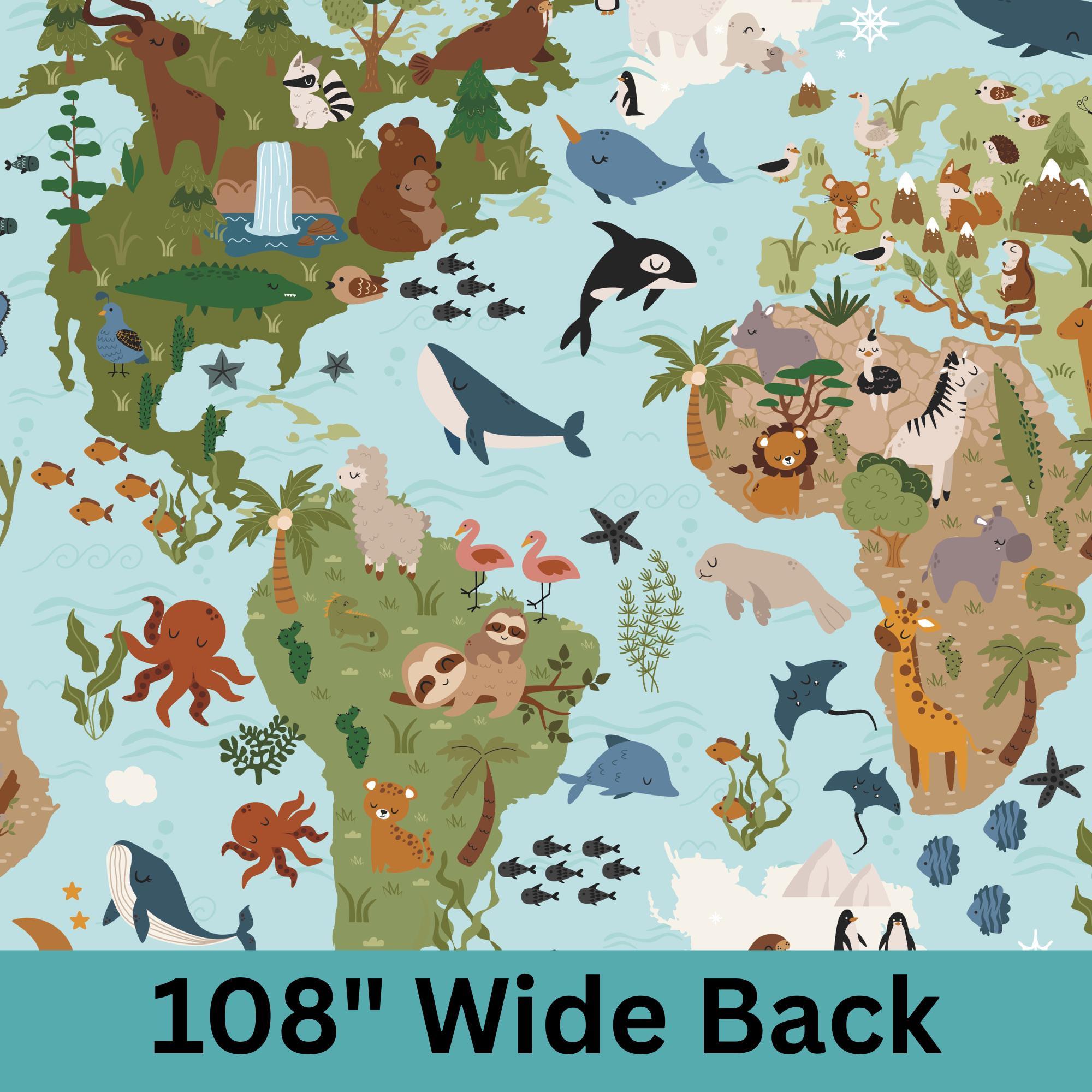 If you love the animals from around the world, you'll adore this 108" wide back quilting cotton fabric from the Riley Blake Designs' Created with Love collection by Jennifer Long! It features a map of the world with various animals on their continents or in the oceans on a background sky blue. The design is seamless, so if you order multiple quantities the fabric will be continuous without any interruption of the pattern. This fabric is made of 100% cotton and is 108" wide. It is perfect for quilting, crafts, home decor, nurseries and more. You'll have so much fun creating projects with this whimsical and charming fabric!