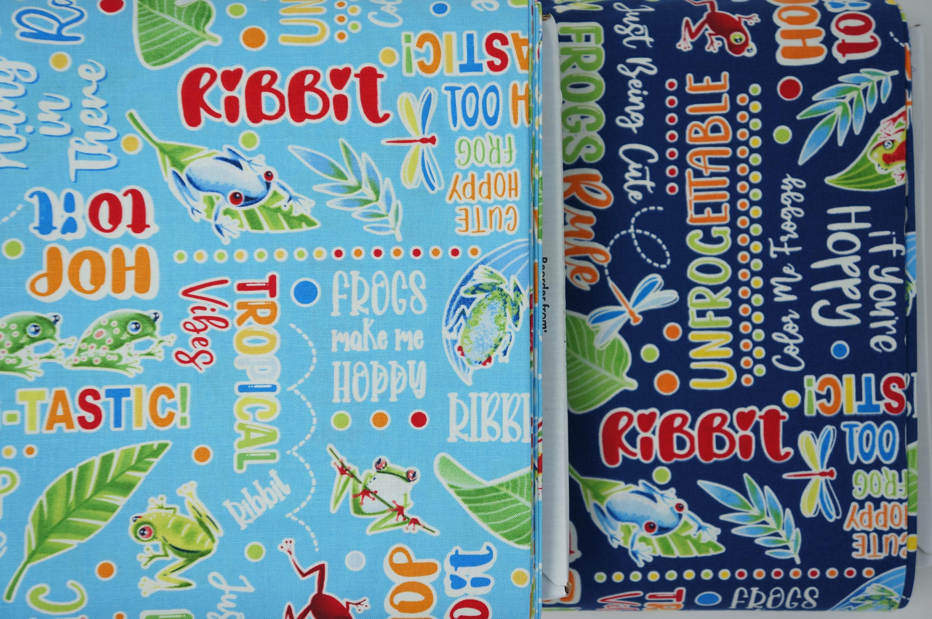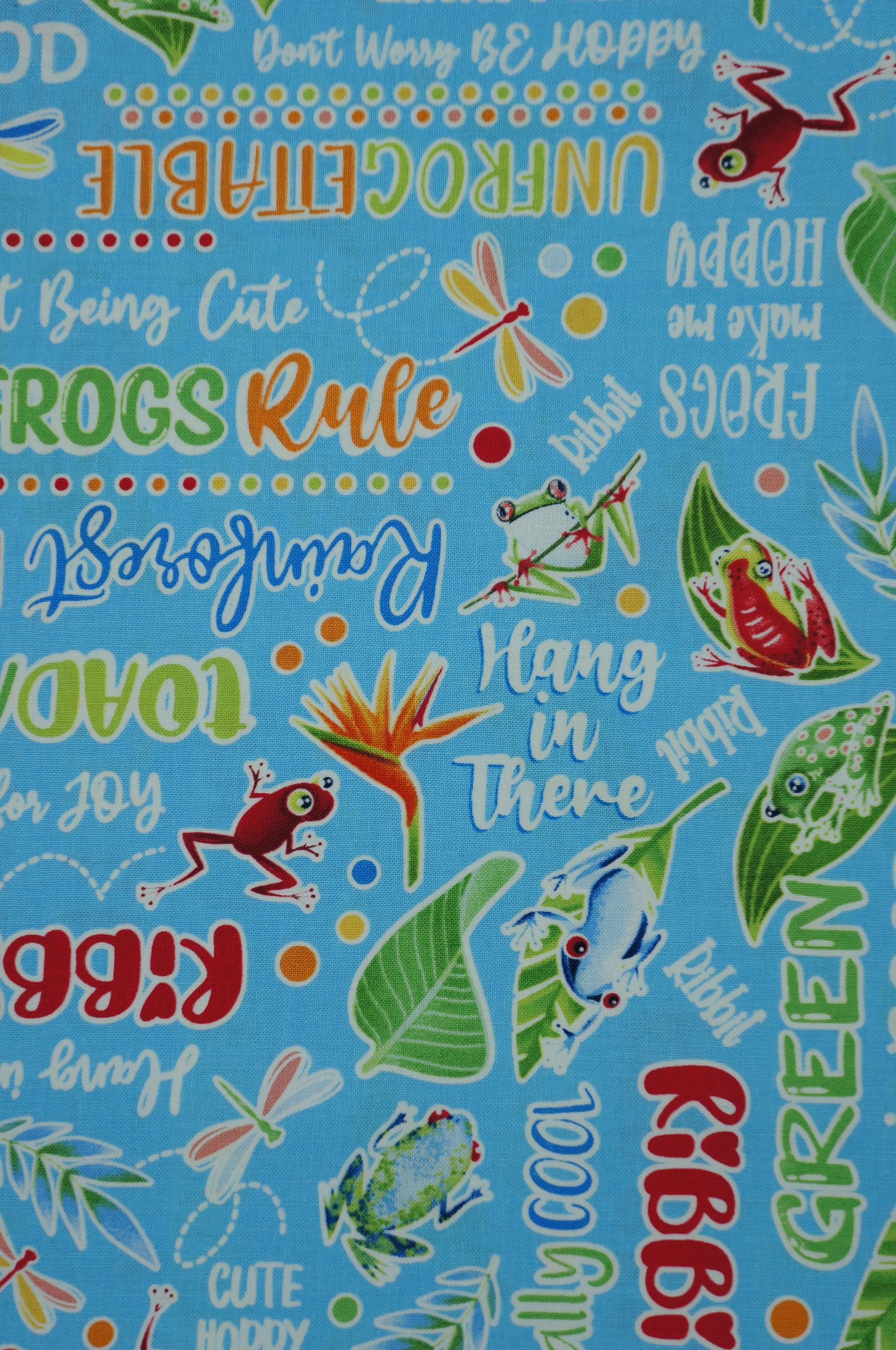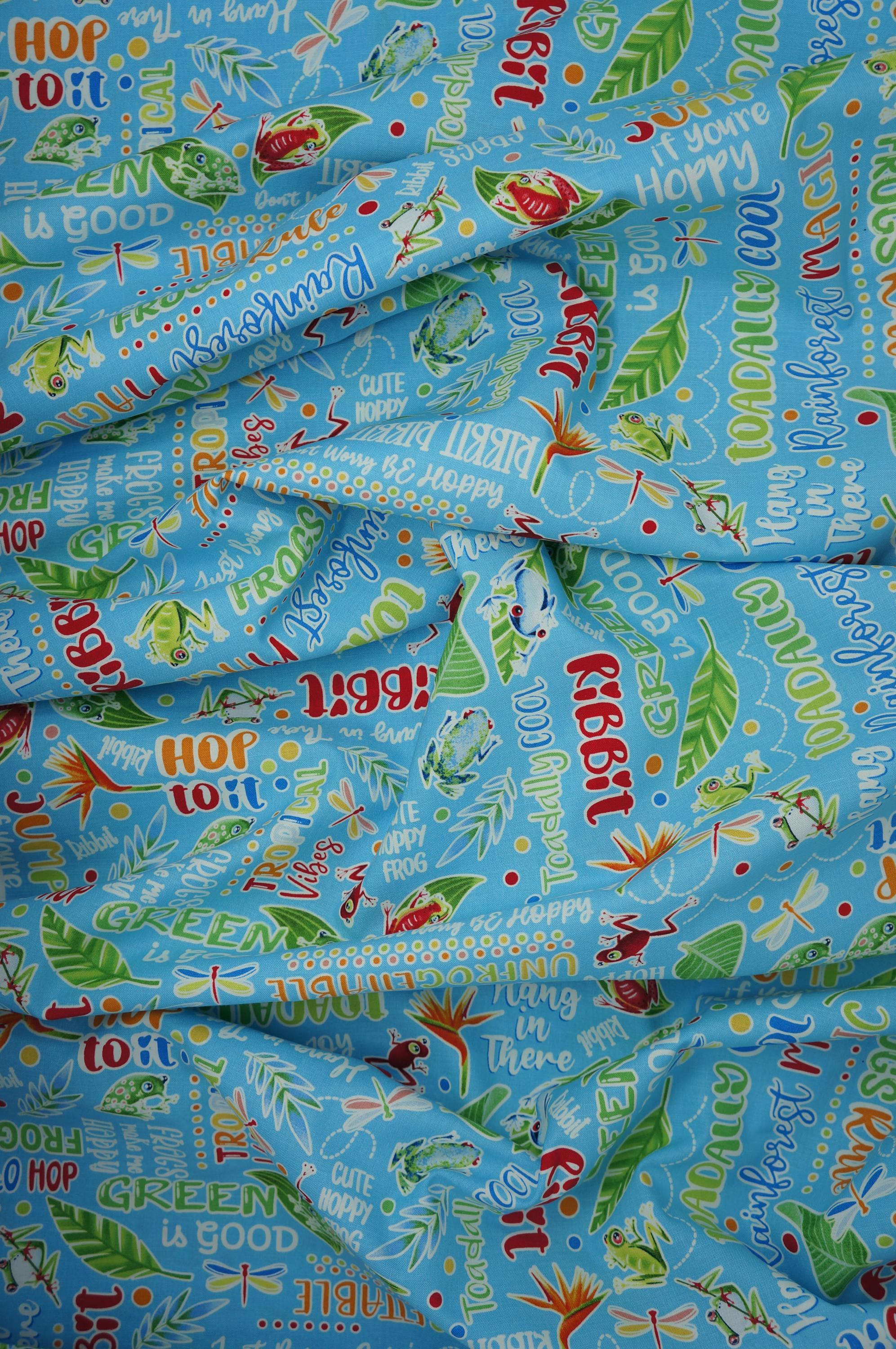 Introducing the Frog-Tastic Words Glow from the Rainforest Glow Collection—a delightful glow in the dark creation by the talented Kanvas Studio for Benartex Quilting Cotton Fabric. This fabric features fun frog phrases, frogs, dragonflies, and rainforest leaves run horizontally and vertically across a medium turquoise background. The frog phrases include vibrantly colored words such as "UNFROGETTABLE", "Jump if your Hoppy", "Don't Worry by Hoppy", and "Toadally Cool". The screen-printed design bursts with vibrant colors. Whether you’re crafting quilts, apparel, or home decor, this fabric promises to elevate your creations to a whole new level of cuteness! Made of high quality 100% quilting this fabric strikes the perfect balance between durability and comfort. So, dive into the world of frogs, where imagination meets craftsmanship. Let your creativity flourish with this enchanting fabric—it’s time to stitch magic!