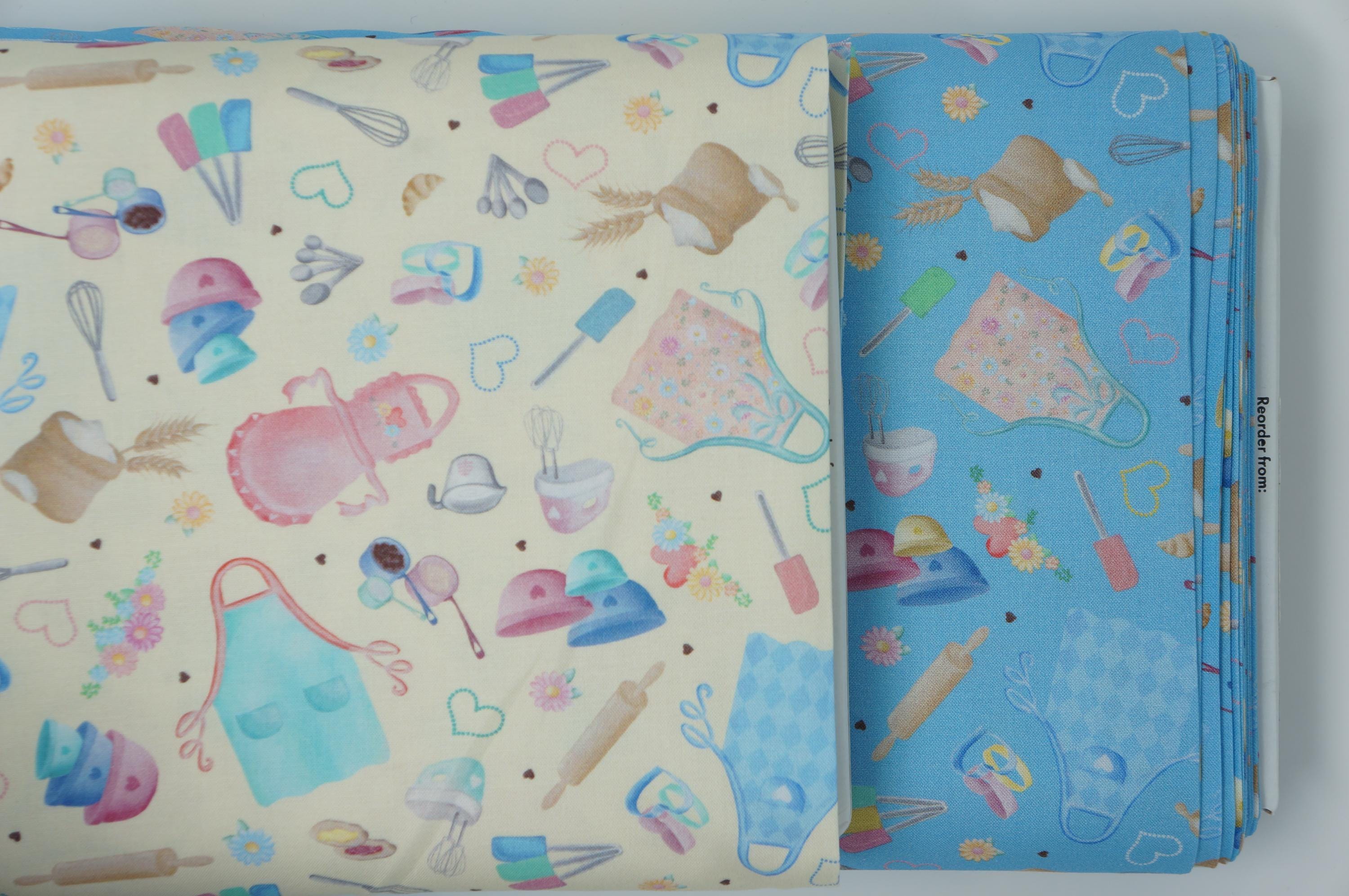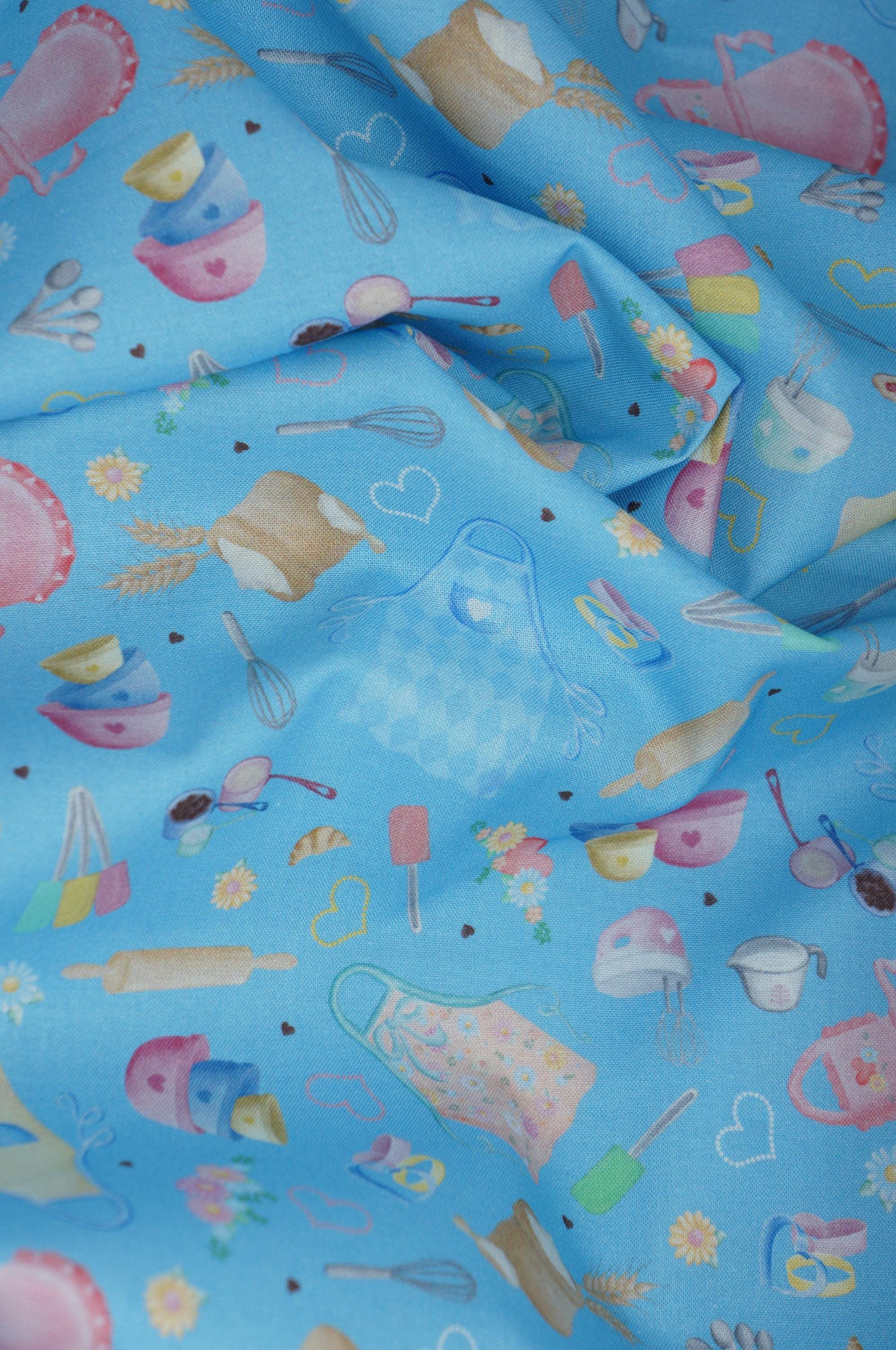 If you love cooking and baking, you will adore this Time to Bake quilting cotton fabric from the Gnomebody Bakes it Better Collection designed by Andi Metz for Kanvas Studio Benartex! It features colorful prints of kitchen utensils, aprons, ingredients, hearts and flowers on a blue background. This fabric is perfect for making aprons, oven mitts, table runners, placemats, and more. This fabric high quality, 100% cotton, soft, durable, and easy to sew with. Whether you are a professional chef or a home cook, you will find endless ways to use this cooking and baking fabric in your projects.