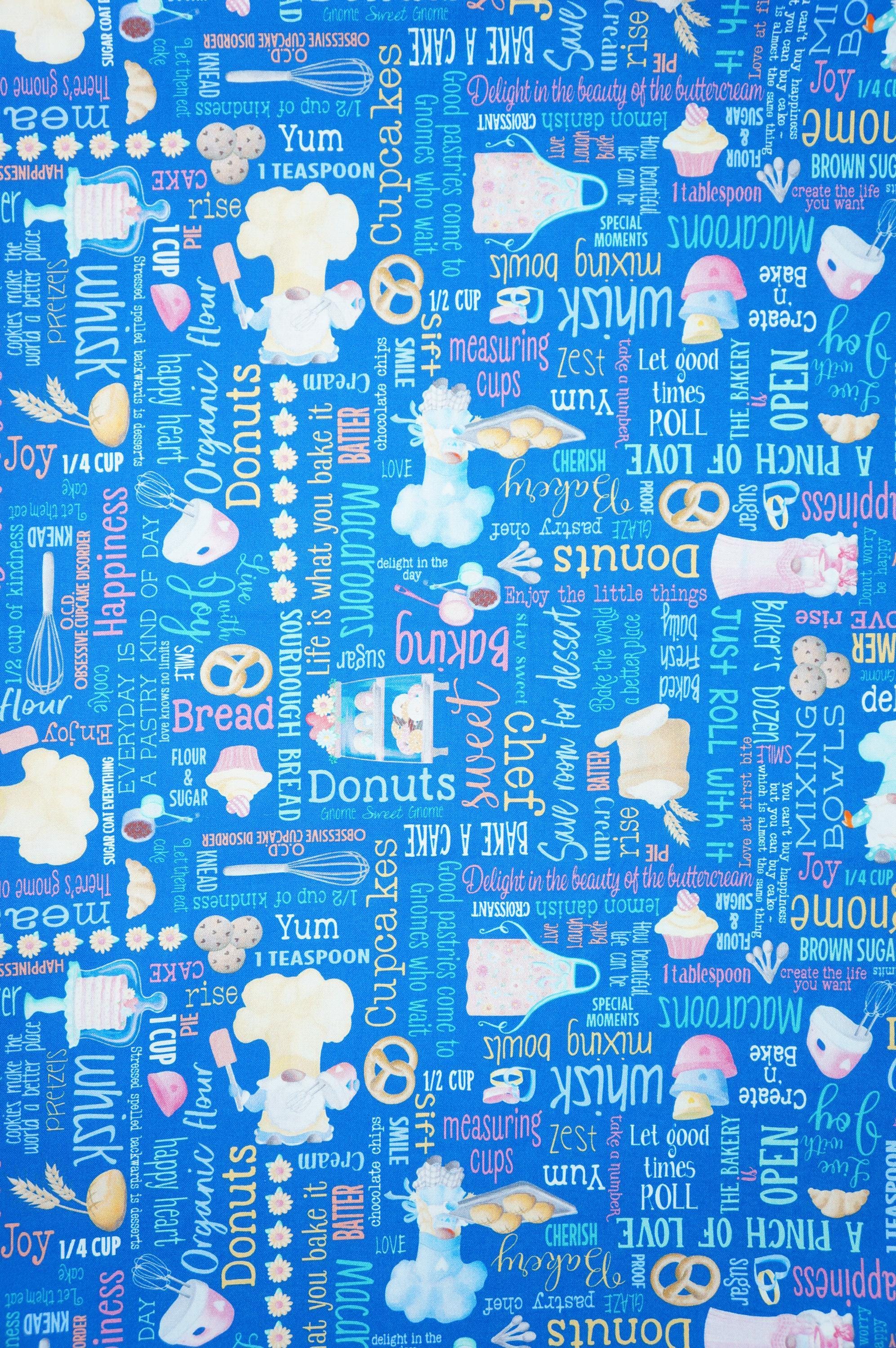 If you love cooking and baking, you will adore this Baking Words quilting cotton fabric from the Gnomebody Bakes it Better Collection designed by Andi Metz for Kanvas Studio Benartex! It features colorful grid of baking related words along with graphics of kitchen utensils, gnomes, aprons, ingredients and flowers on a blue background. This fabric is perfect for making aprons, oven mitts, table runners, placemats, and more. This fabric high quality, 100% cotton, soft, durable, and easy to sew with. Whether you are a professional chef or a home cook, you will find endless ways to use this cooking and baking fabric in your projects.