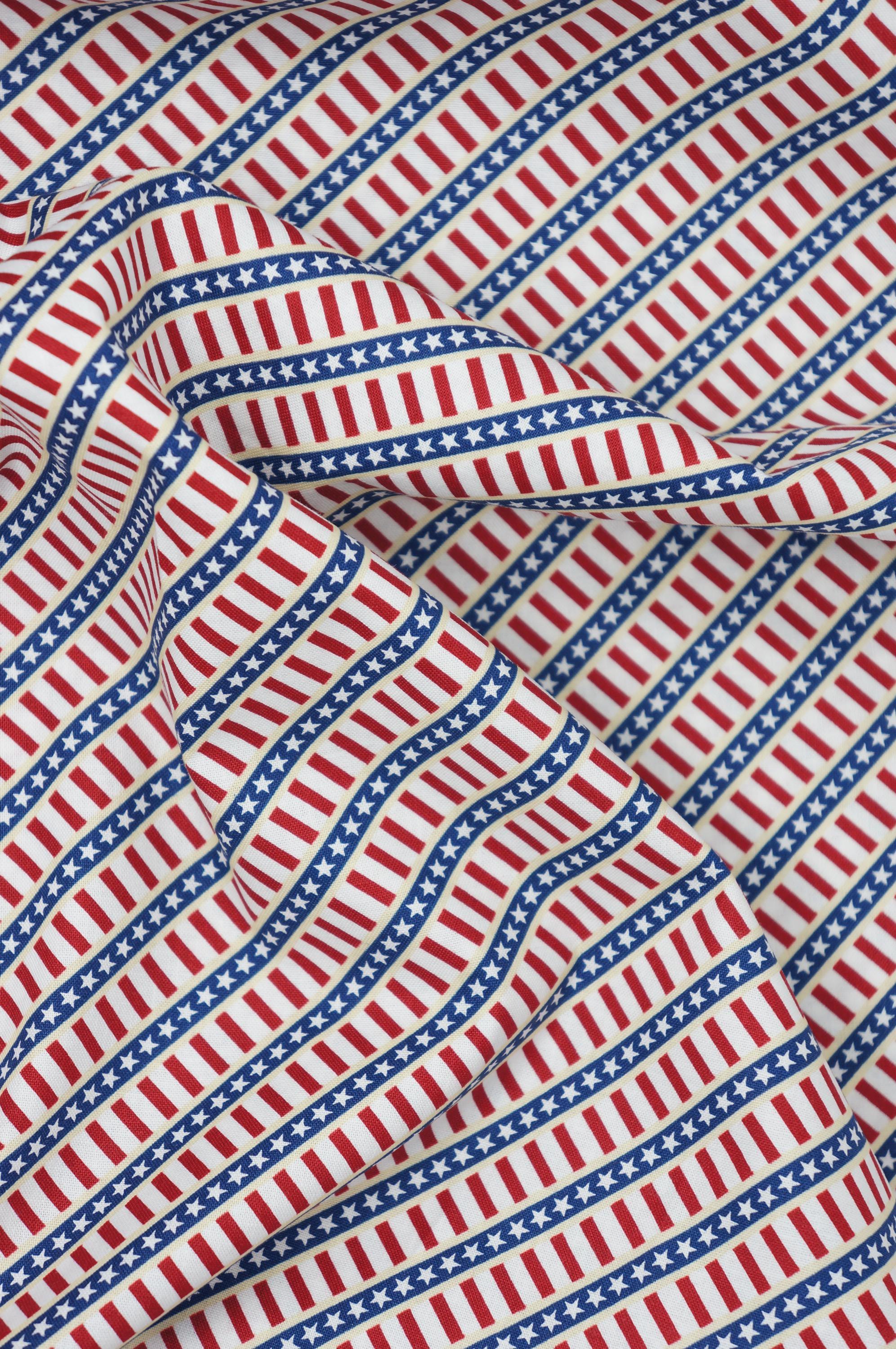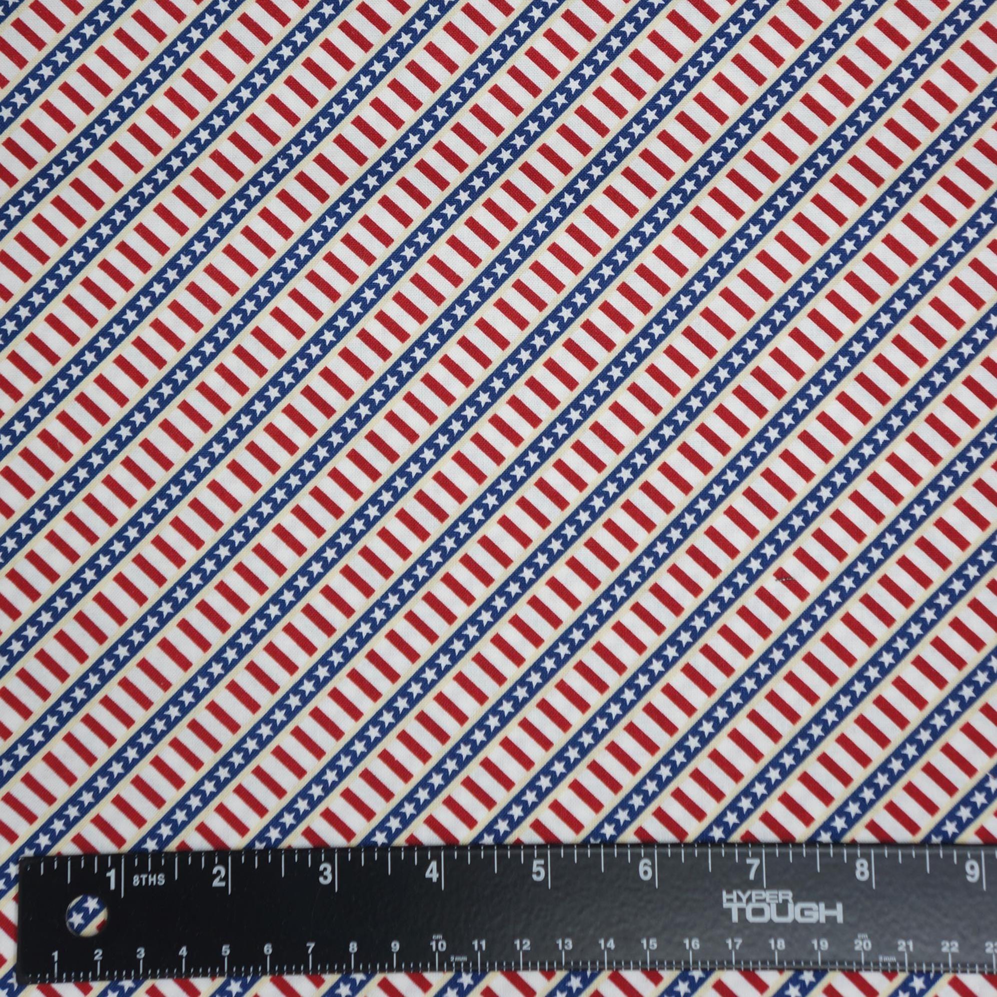 Elevate your patriotic projects with our Patriotic Diagonal Stripe on Cream Quilting Cotton Fabric from the Hearts Anthem Collection by Stephanie Marrott for Windham Fabrics! Bursting with timeless Americana charm, this fabric features diagonal navy-blue stripes with stars and another diagonal stripe of alternating cream and red stripes, creating a stunning display of patriotic flair. Whether you're quilting, crafting home decor, or designing festive apparel, this high-quality quilting cotton is the perfect choice for expressing your love for the stars and stripes. Let your creativity run wild as you infuse your projects with the spirit of freedom and pride. With its exceptional quality and eye-catching design, this Patriotic Stars and Stripes Fabric is a must-have for any DIY enthusiast looking to add a touch of patriotic elegance to their creations!