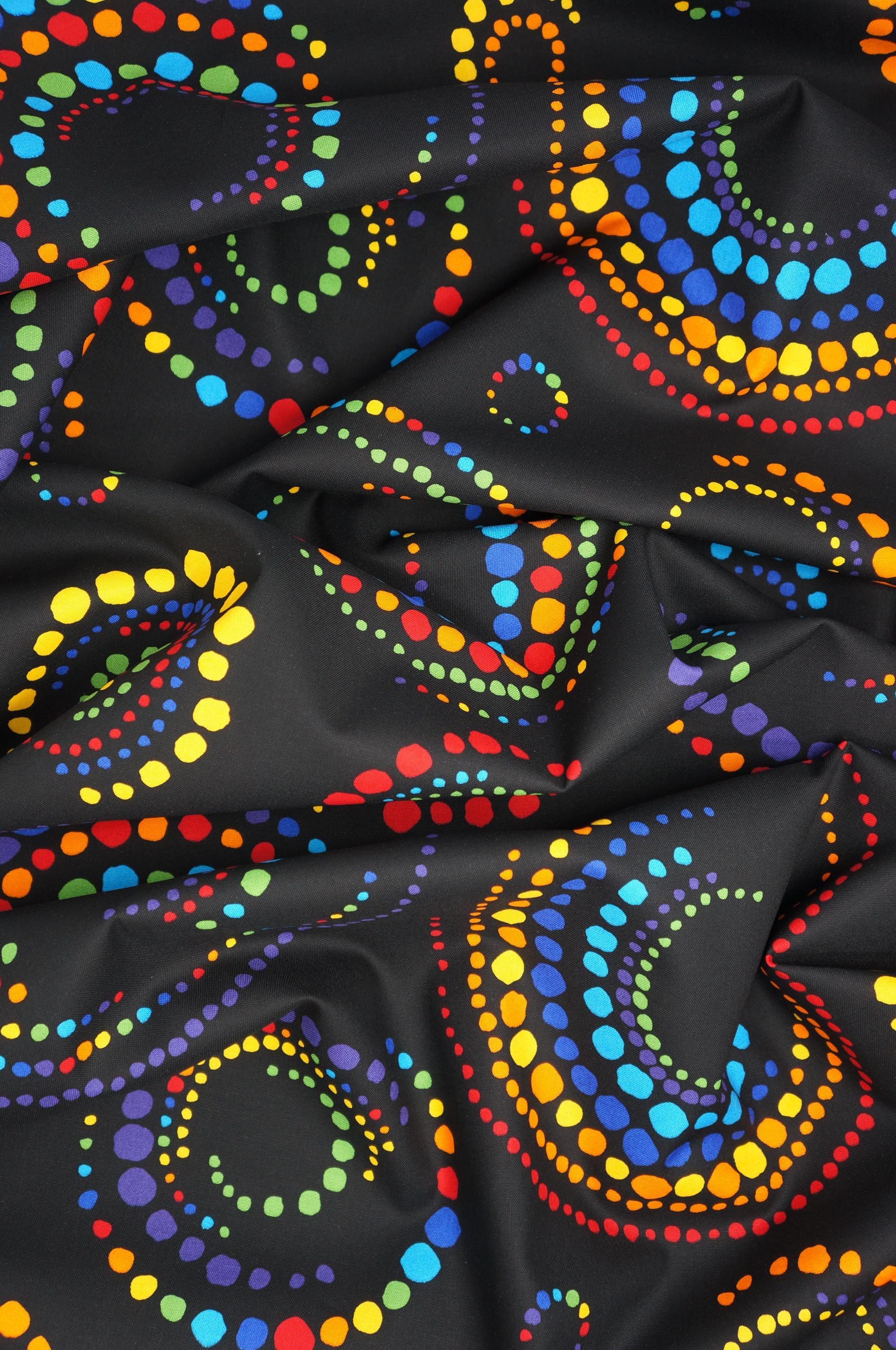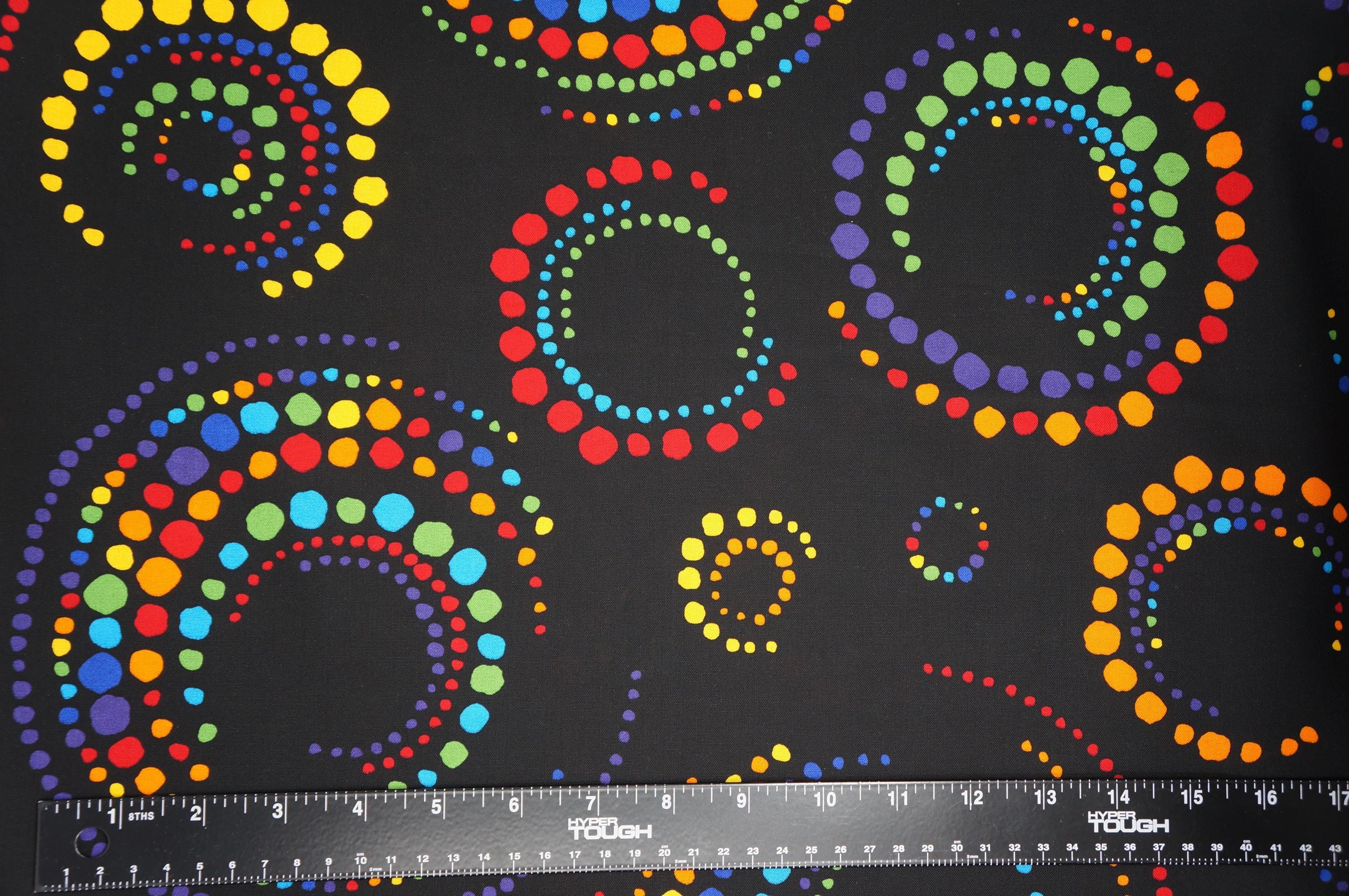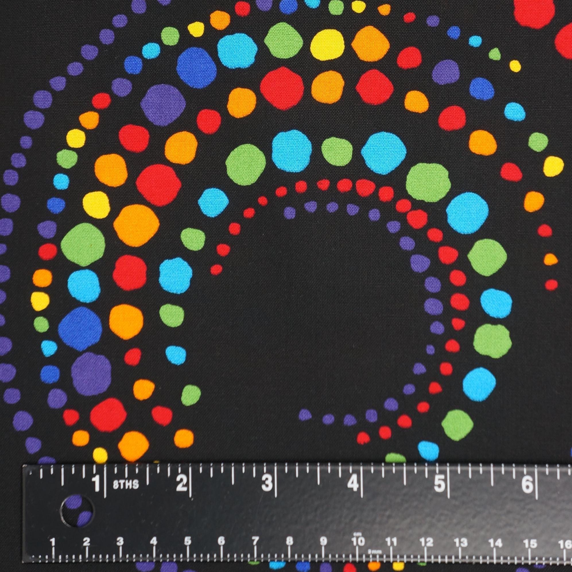 If you love simple but modern blender fabric, you will adore Multi Dots on Black quilting cotton fabric from the Dots and Stripes Delight Collection by RKF for Robert Kaufman Fabrics. This fabric features rainbow-colored dots in a circular pattern on a black background. This fabric is made of 100% high quality quilting cotton, durable and easy to sew. This mandala inspired fabric will make you smile and inspire you to create beautiful projects!