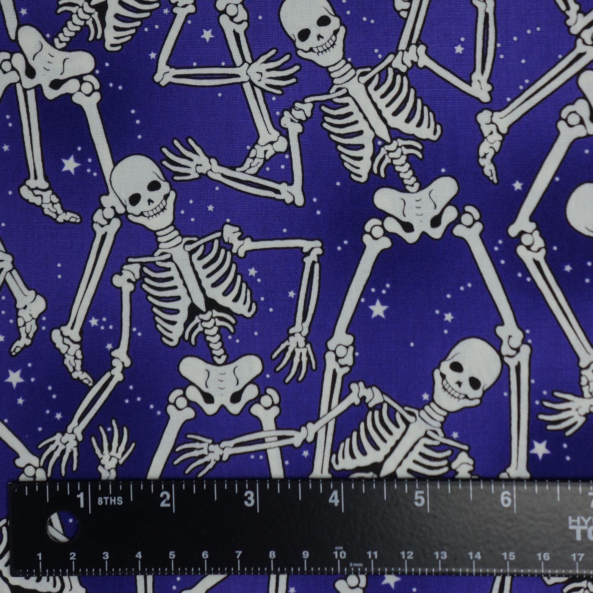 If you're looking for a happy and fun skeleton fabric for your Halloween projects, look no further than the Halloween Spirit Skeleton Crew on Purple by Benartex Kanvas Studio Quilting Cotton Fabric. Designed by Gretta Lynn this fabric features tossed dancing glow in the dark skeletons with stars on a purple background, perfect for creating quilts, pillows, costumes, and more. The skeletons and stars glow in the dark when the fabric is exposed to light and then you turn out the lights. The fabric is made of 100% high quality cotton and has a soft and smooth feel. The Halloween Spirit Skeleton Crew on Purple quilting cotton fabric is a must-have for any Halloween lover!