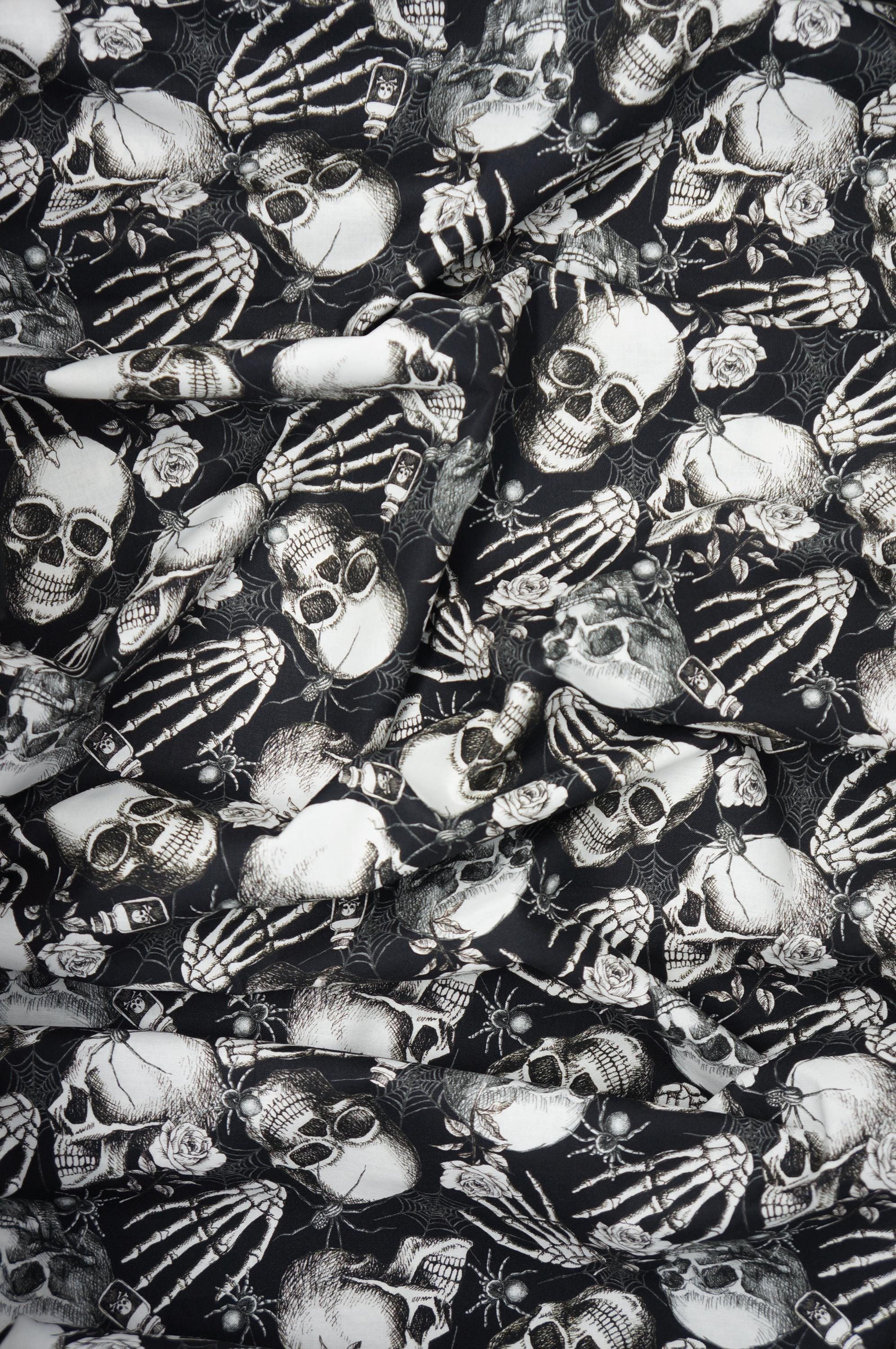If you love spooky and romantic themes, you will adore Tossed Skulls and Hands Halloween Quilting Cotton Fabric from the Fear Factory Collection by Lena Art Studio for Studio E! This fabric is made of 100% high quality cotton and has a smooth texture. It features a stunning design of white skulls, hands, spiderwebs, spiders and roses on a black background, creating a striking contrast and a gothic vibe. You can use this fabric to make costumes, quilts, pillows, bags, and more. This fabric is perfect for Halloween or any day you want to add some edge to your style!