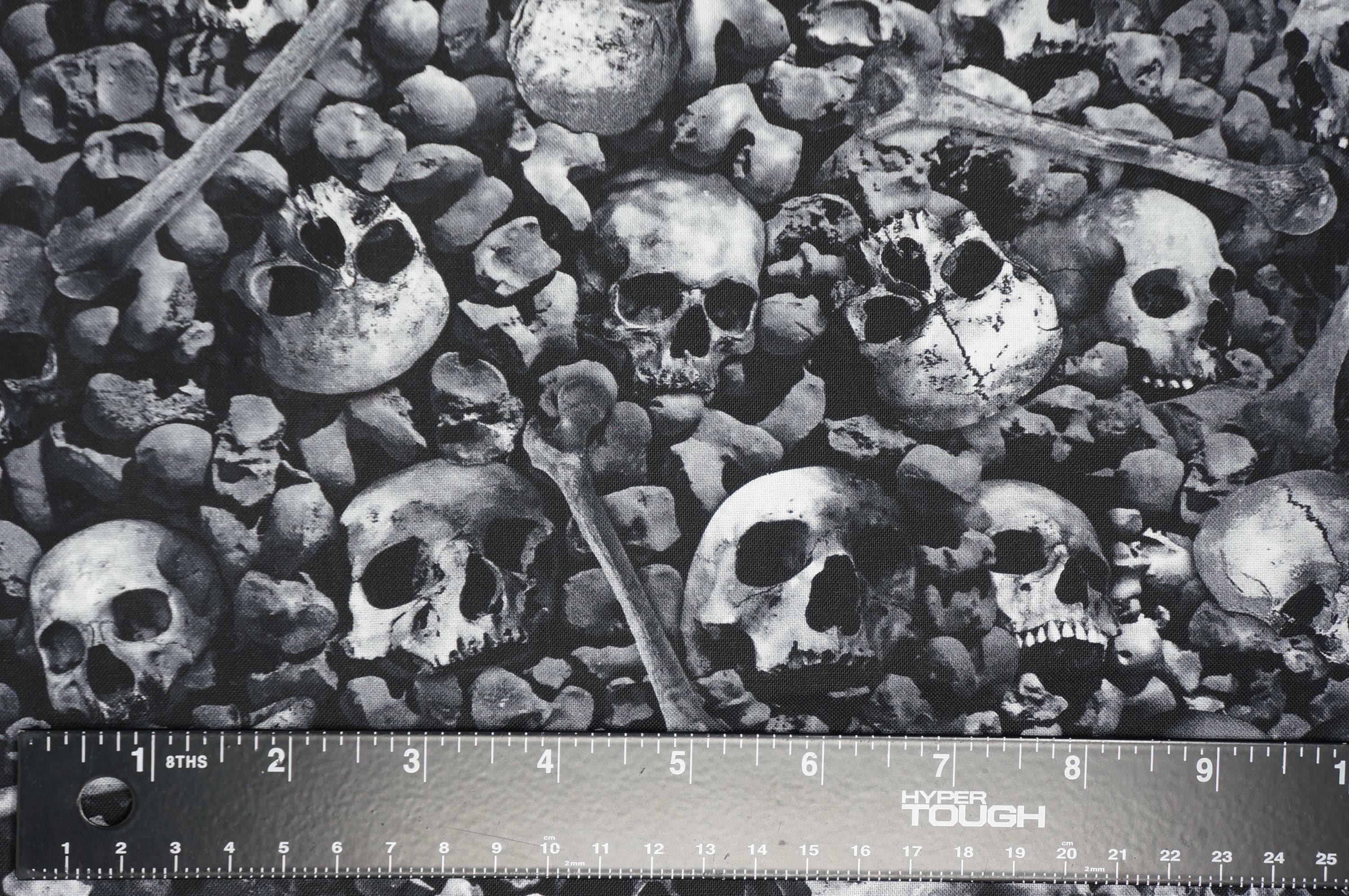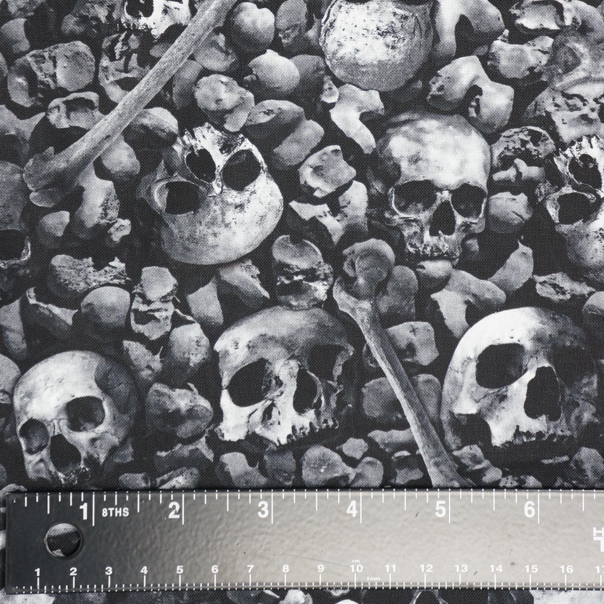 If you love spooky fabric, you will love Packed Skulls and Bones Halloween Quilting Cotton Fabric from the Wicked Collection by Timeless Treasures! This fabric is made of 100% high quality cotton and has a smooth texture. It features a stunning design of realistic skulls and bones packed onto the fabric on a black background, creating a striking contrast and a gothic vibe. You can use this fabric to make costumes, quilts, pillows, bags, and more. This fabric is perfect for Halloween or any day you want to add some edge to your style!