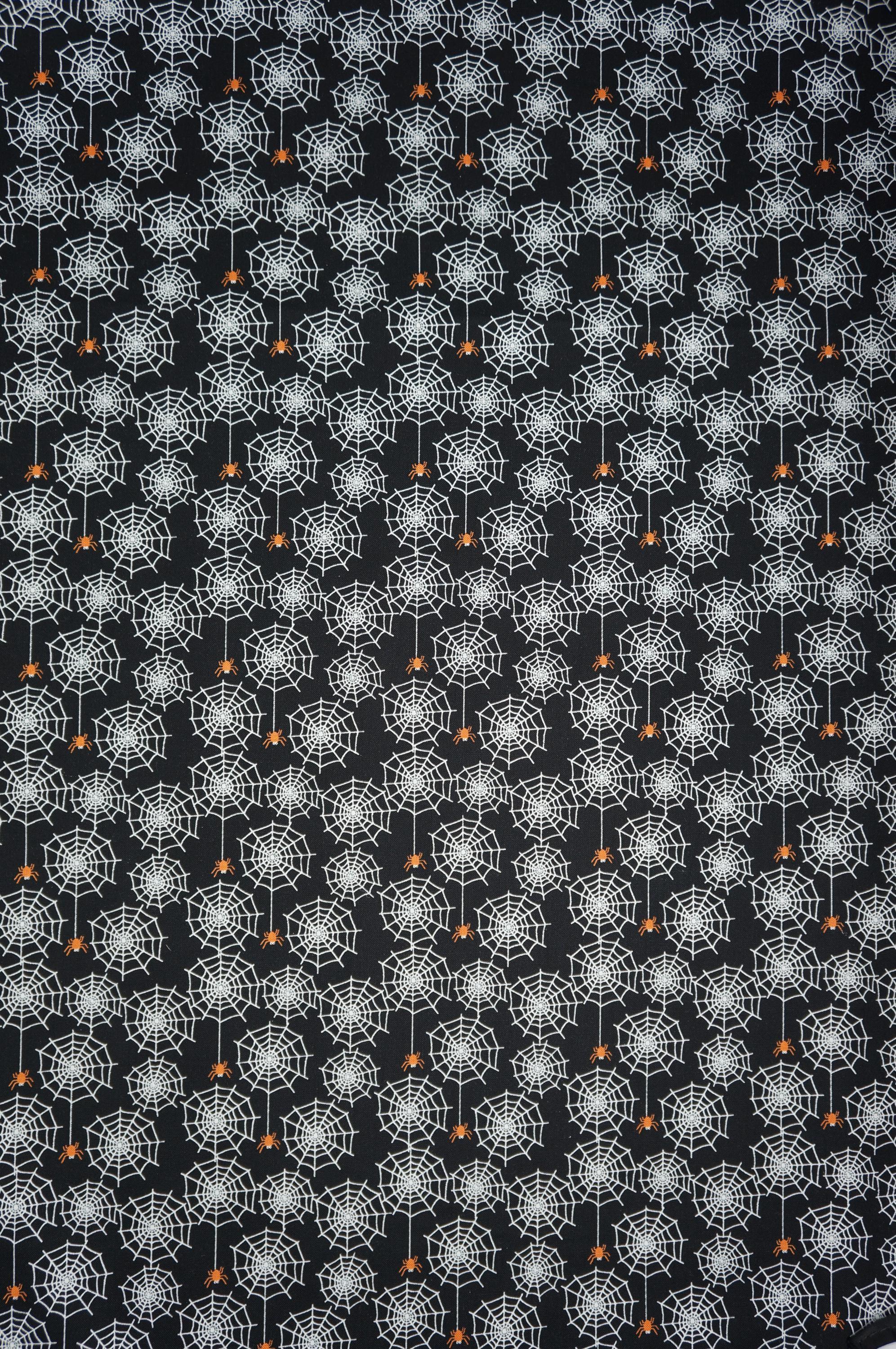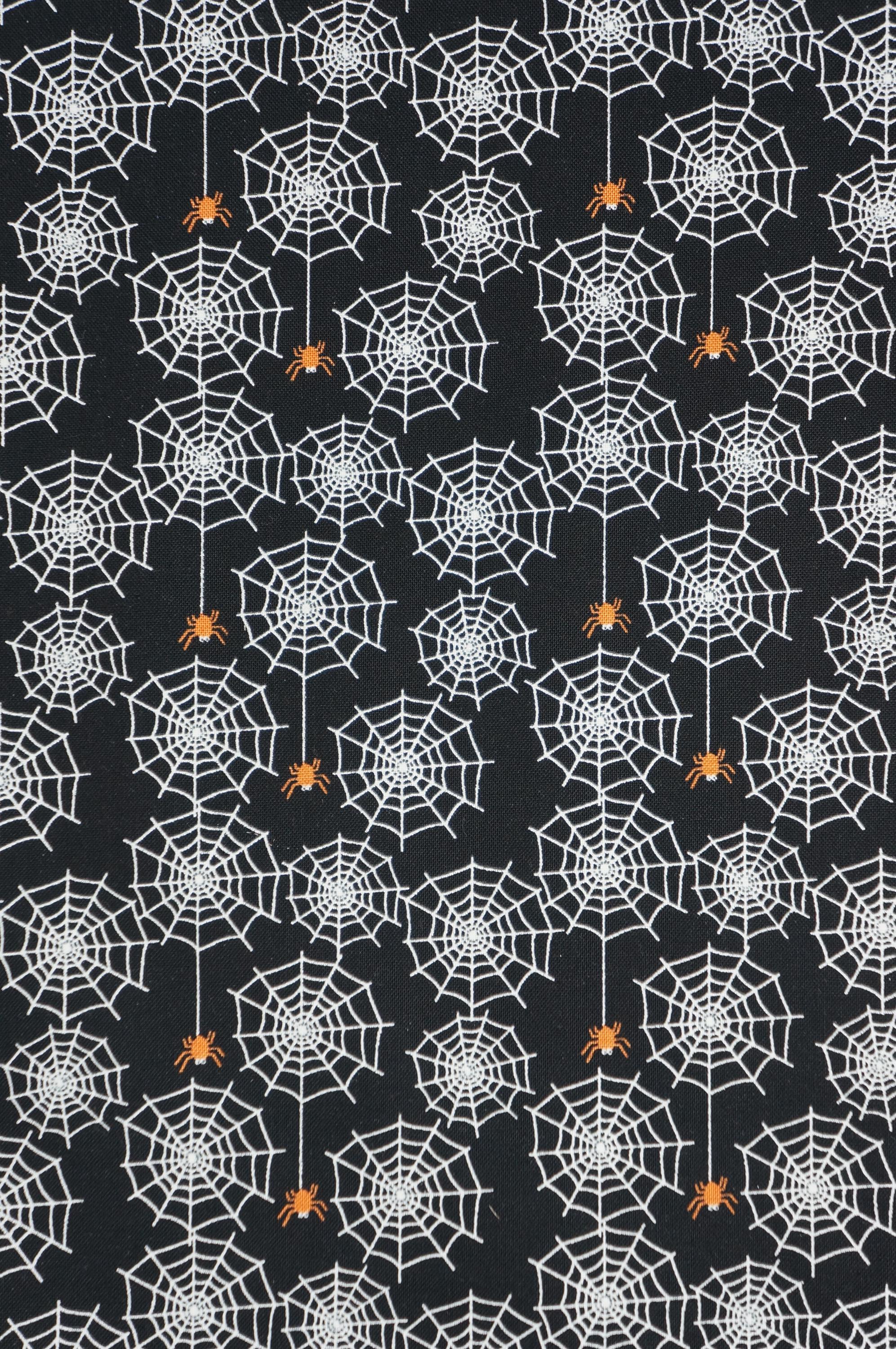 Step into the eerie elegance of Sandy Gervais's Spiderwebs on Black for the Beggar's Night Collection for Riley Blake Designs! Perfect for those who revel in spooky sophistication, this hauntingly beautiful quilting cotton is a must-have for your next project. With its captivating design showcasing delicate spiderwebs and dangling orange spiders against a mysterious black backdrop, this fabric adds a touch of gothic charm to any creation. Whether you're crafting quilts, garments, or home decor, let your imagination weave its own web of enchantment. Embrace the thrill of the unknown and bring your creative visions to life with this bewitching textile!