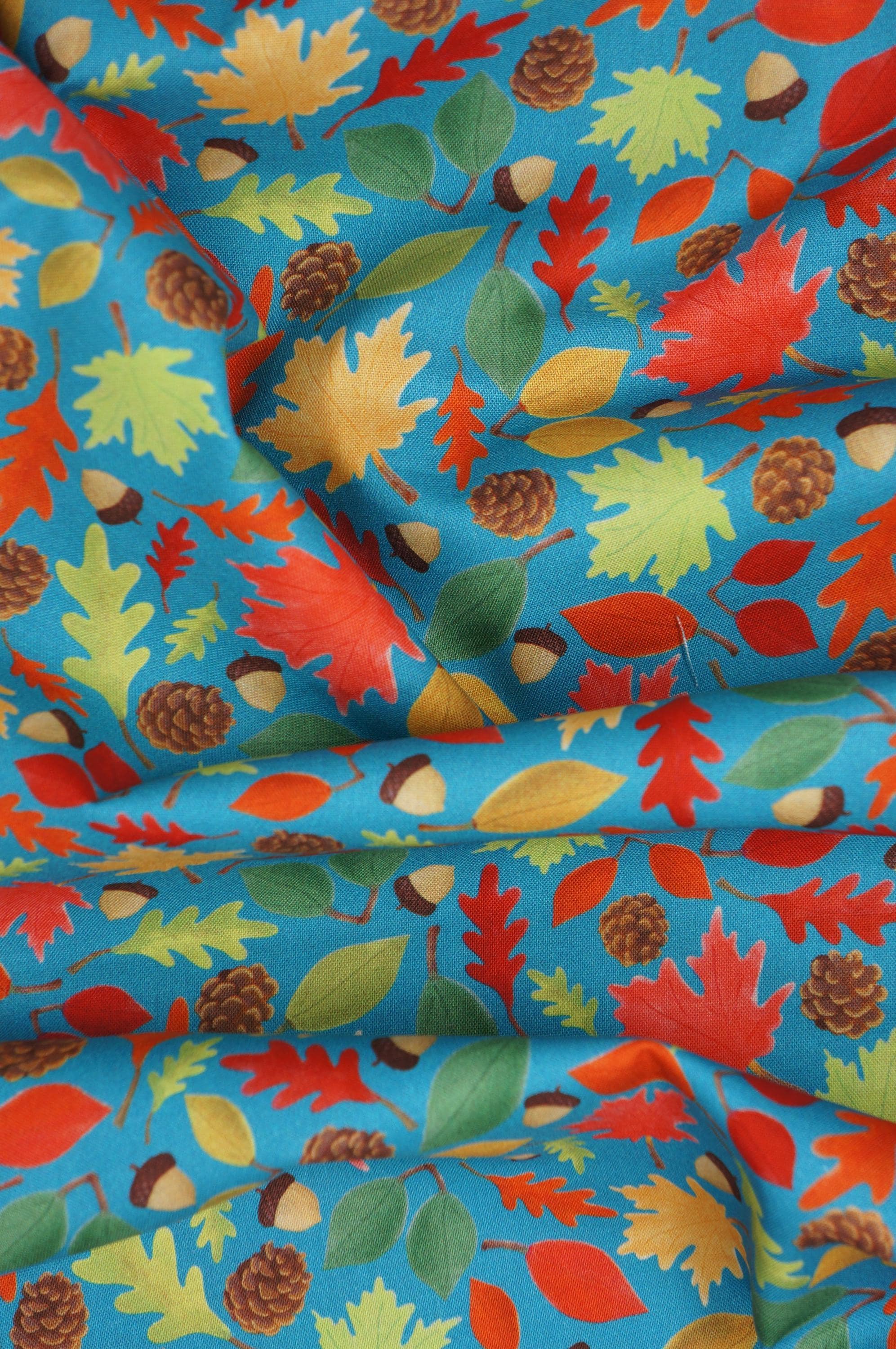 Step into the cozy embrace of nature with our enchanting Leafy Fall Fun quilting cotton fabric from the Falling for Gnomes Collection by Andi Metz for Benartex Kanvas Studio! Crafted with utmost care, this quilting cotton fabric boasts a delightful print of boldly designed leaves, pinecones and acorns scattered across a teal background. Whether you're creating a quilt, home decor accents, or apparel, this fabric is a testament to the beauty of the great outdoors. Let your imagination run wild as you bring the essence of autumn into your next crafting masterpiece!
