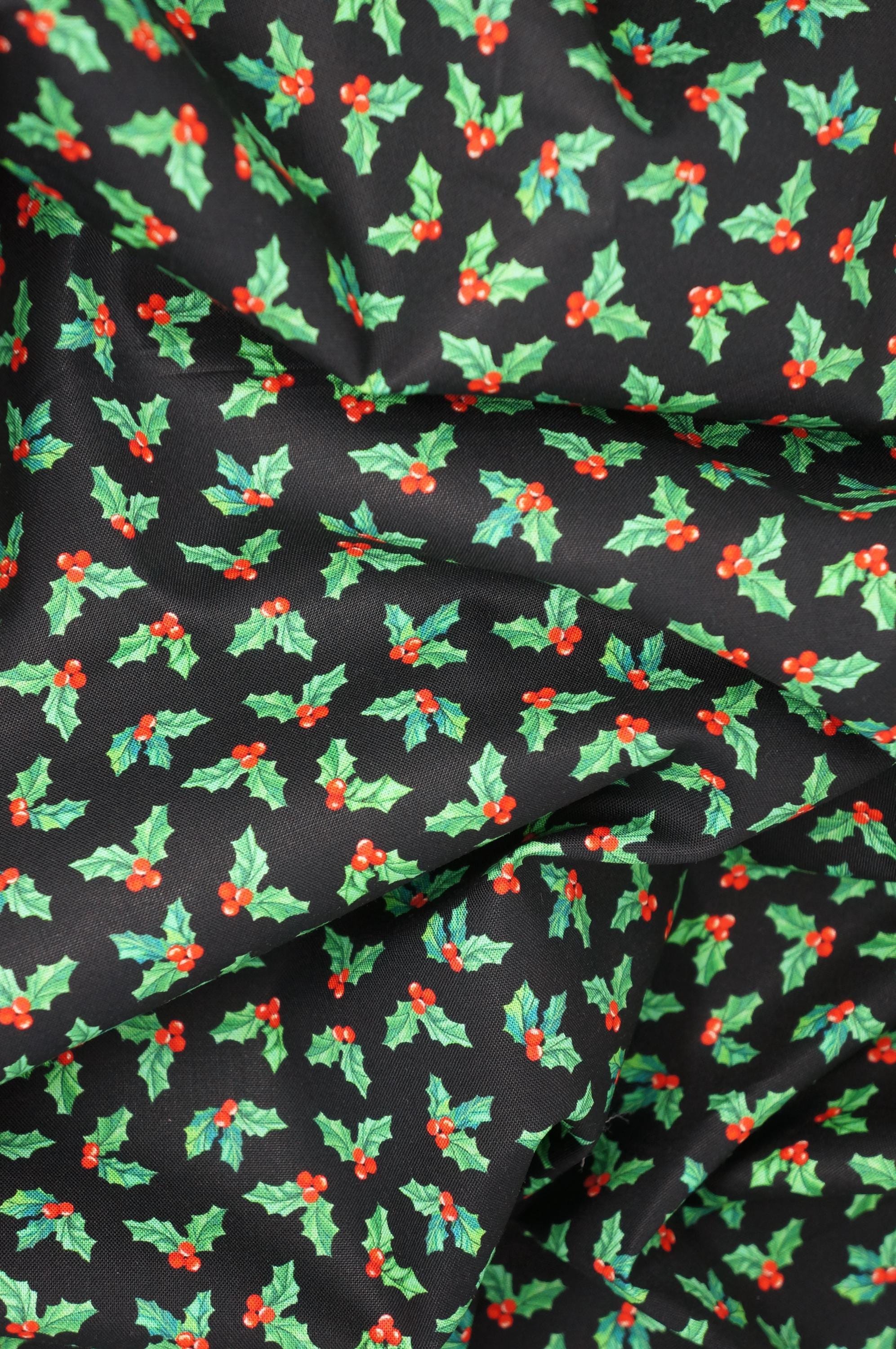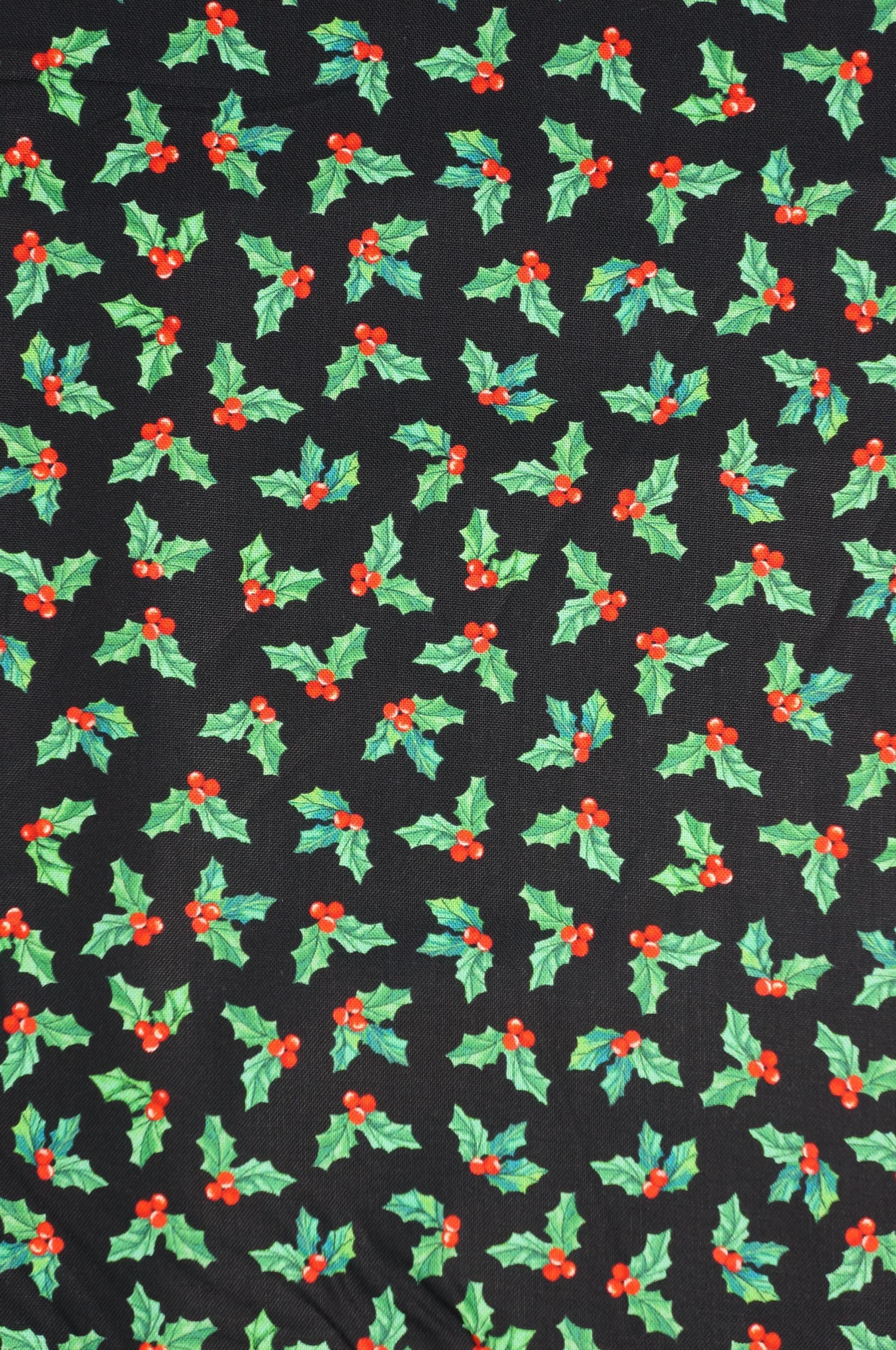 Transform your holiday projects with the enchanting charm of this Holly Leaves Fabric! This delightful fabric features vibrant holly leaves and bright red berries dancing on a rich black background, perfectly capturing the festive spirit of the season. Part of The Sugar & Spice Collection by Nicole DeCamp for Benartex Kanvas Studio, this premium quilting cotton is ideal for all your creative endeavors, from cozy quilts and seasonal table runners to stylish holiday décor and unique gifts. Bring a touch of Christmas magic to your creations and spread the joy of the season with every stitch!