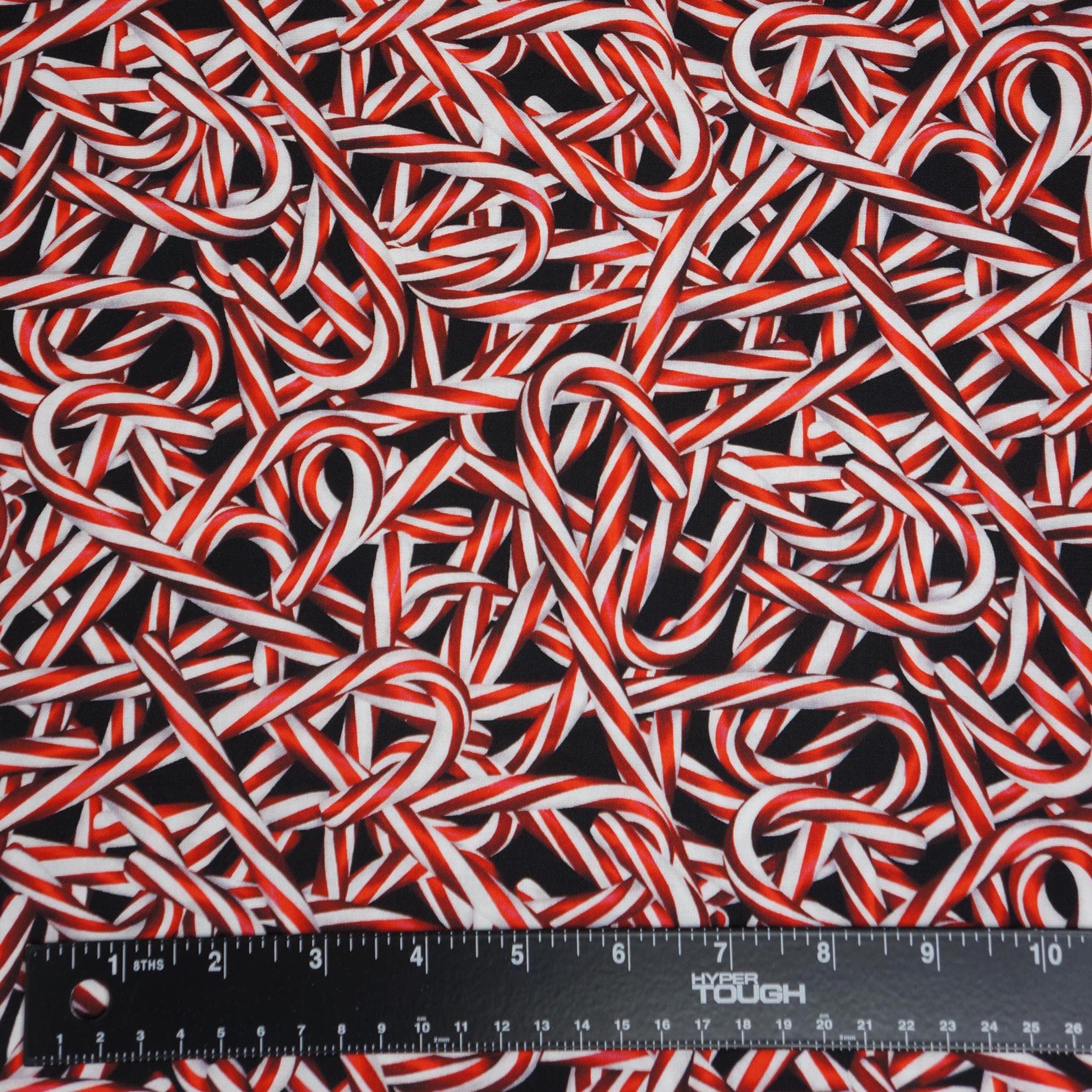 If you're looking for a festive and cozy fabric to make your own Christmas crafts, look no further than this Candy Cane quilting cotton fabric designed by designers at Kanvas Studio for the Sweet Holidays Collection! This fabric features realistic red and white candy canes packed on a rich black background. It's perfect for making quilts, pillows, table runners, stockings, and more. You'll love how soft and durable this fabric is, and how easy it is to sew with. Plus, it's made by Benartex, a trusted brand in sewing and crafting. Order this candy cane quilting cotton fabric today and get ready to create some wonderful holiday projects!