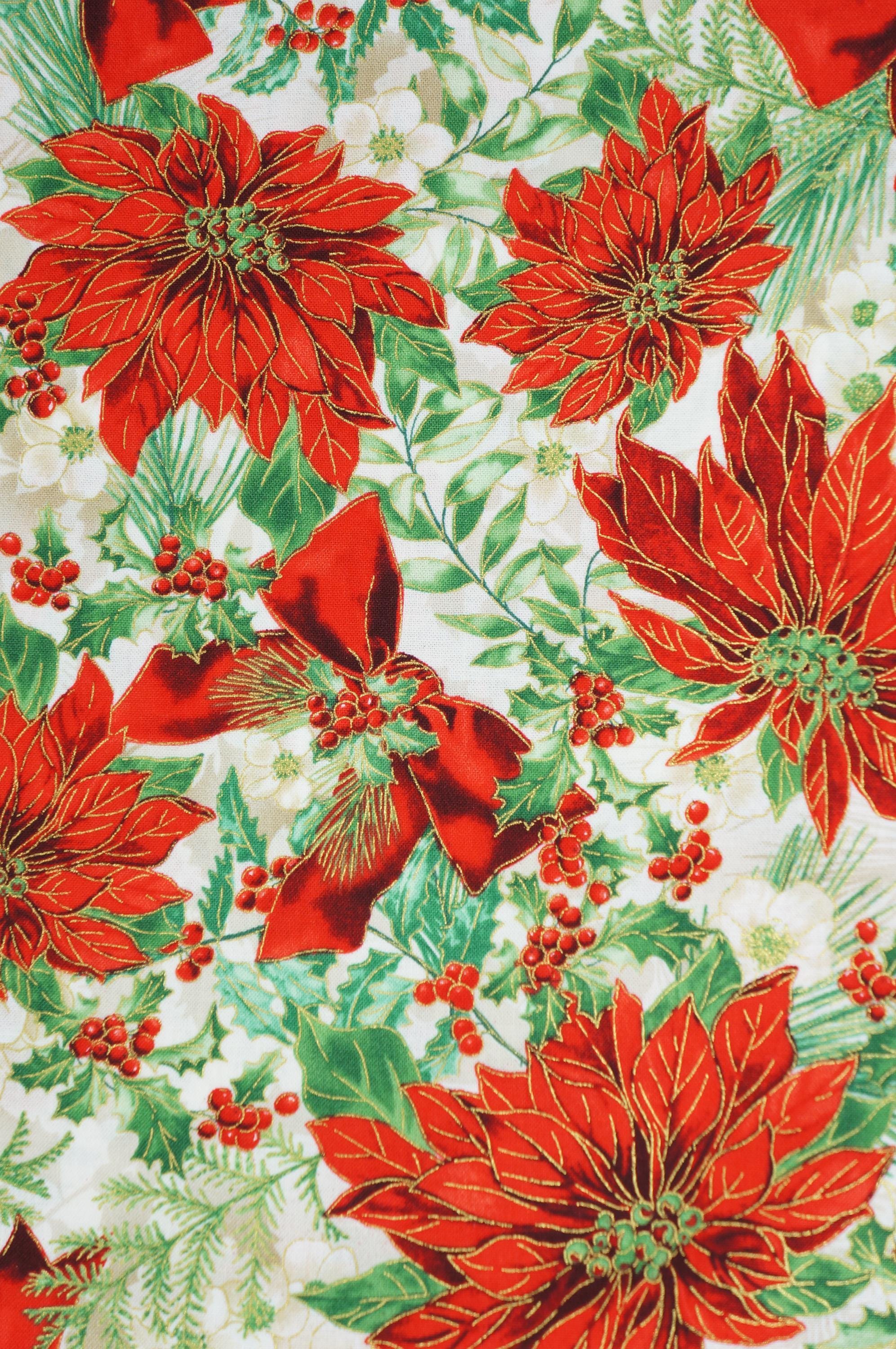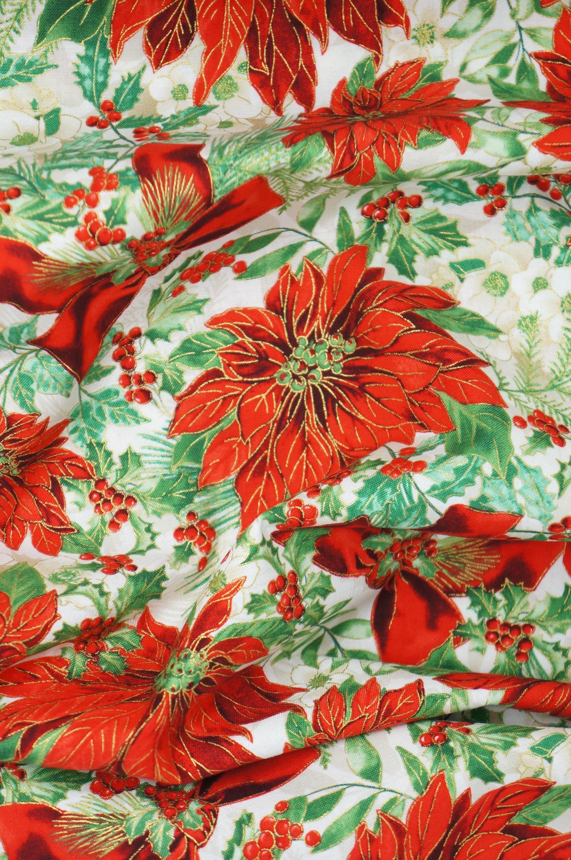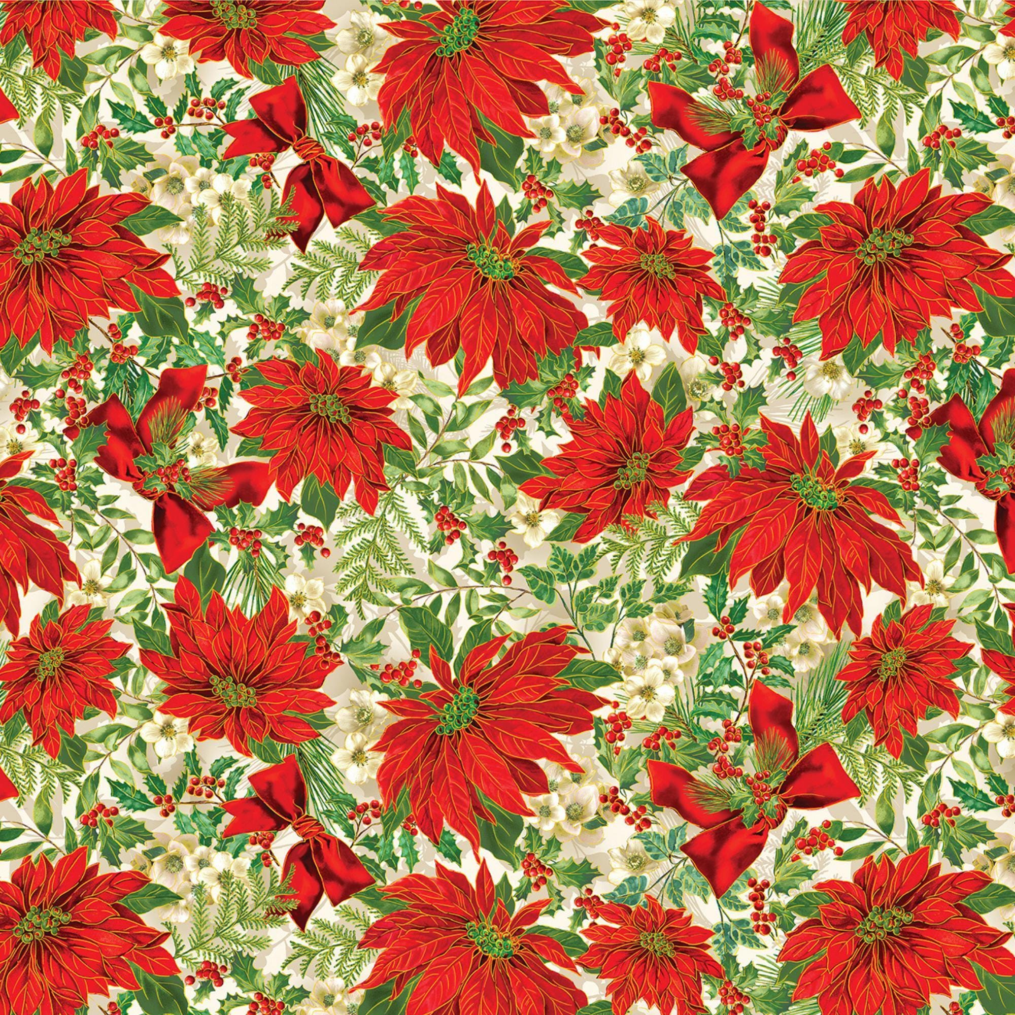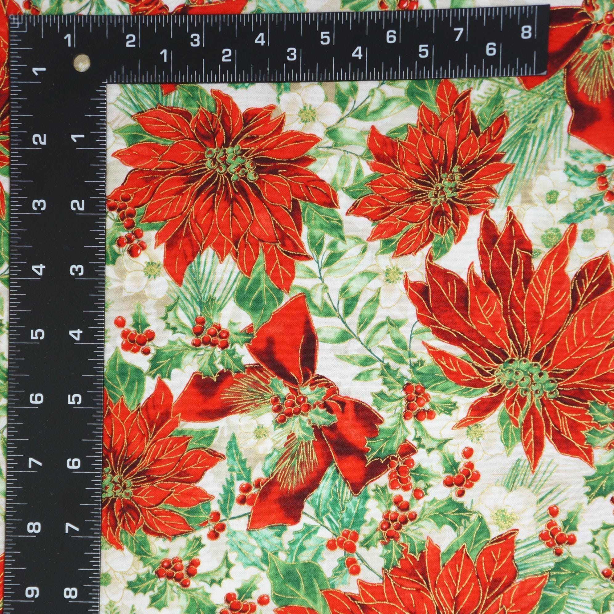 Poinsettia Serenade on Cream with Gold Metallic Accents Quilting Cotton Fabric is a beautiful and festive fabric for your holiday projects. This fabric a is part of Christmas Musical Collection by Greta Lynn for Benartex Kanvas Studio. This fabric features tossed red poinsettias, red bows, holly leaves and berries and holiday floral accented in gold outlining creating a lovely contrast with the rich cream background. This fabric is great for quilting, apparel and home decor, as it is soft, durable and easy to work with. Whether you want to make a cozy quilt, a stylish dress or a charming pillow, this fabric will bring some winter wonder to your creations.