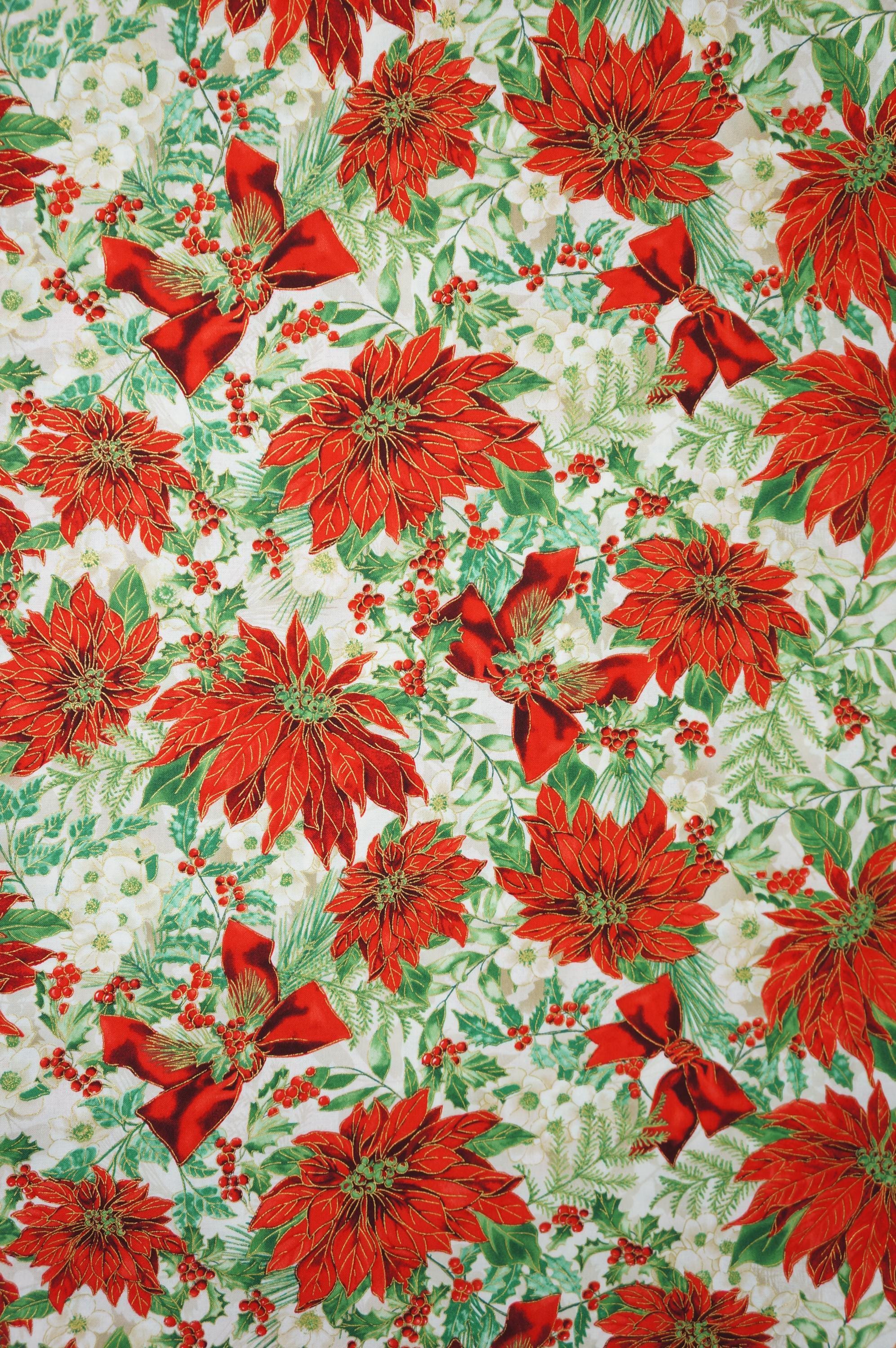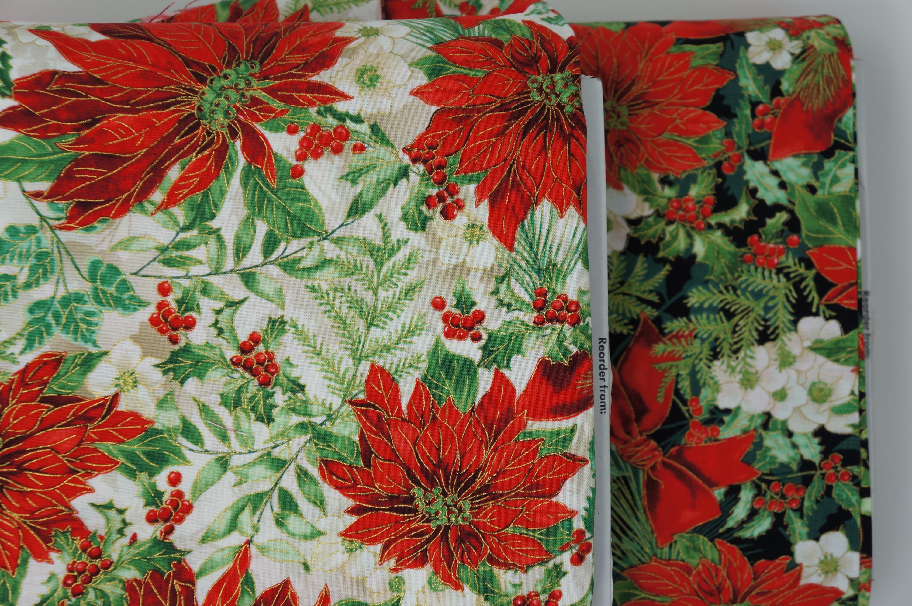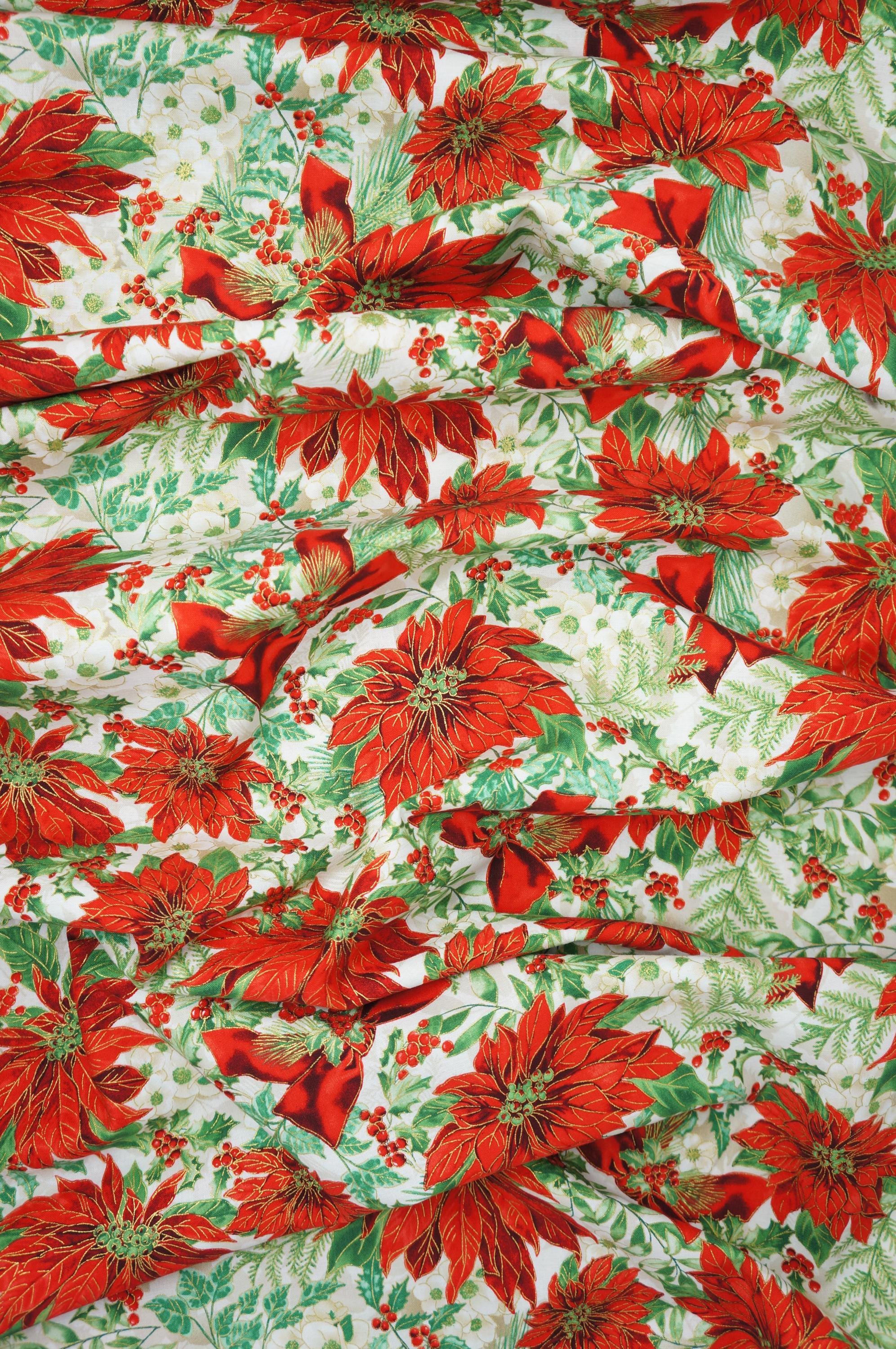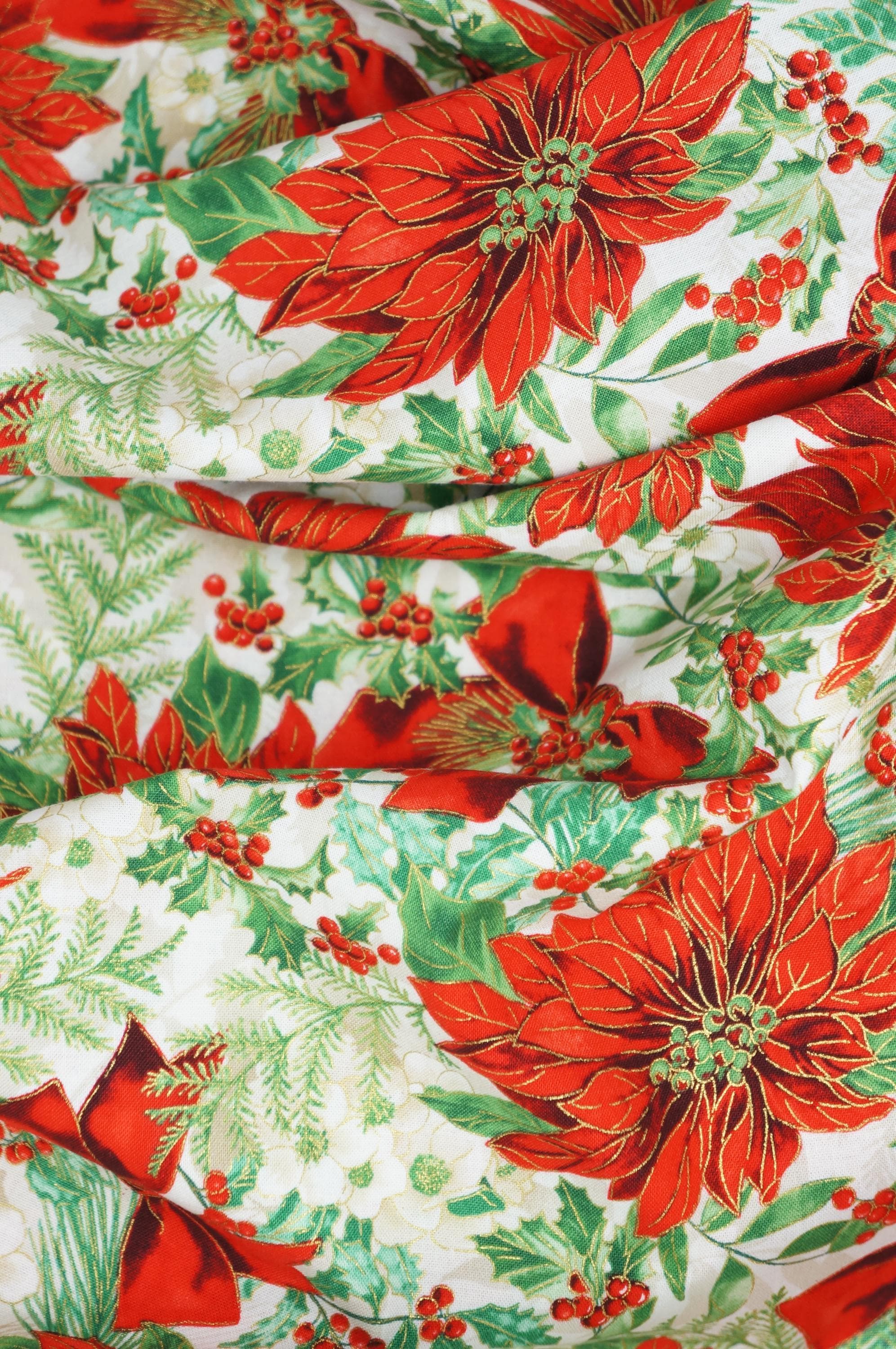 Poinsettia Serenade on Cream with Gold Metallic Accents Quilting Cotton Fabric is a beautiful and festive fabric for your holiday projects. This fabric a is part of Christmas Musical Collection by Greta Lynn for Benartex Kanvas Studio. This fabric features tossed red poinsettias, red bows, holly leaves and berries and holiday floral accented in gold outlining creating a lovely contrast with the rich cream background. This fabric is great for quilting, apparel and home decor, as it is soft, durable and easy to work with. Whether you want to make a cozy quilt, a stylish dress or a charming pillow, this fabric will bring some winter wonder to your creations.