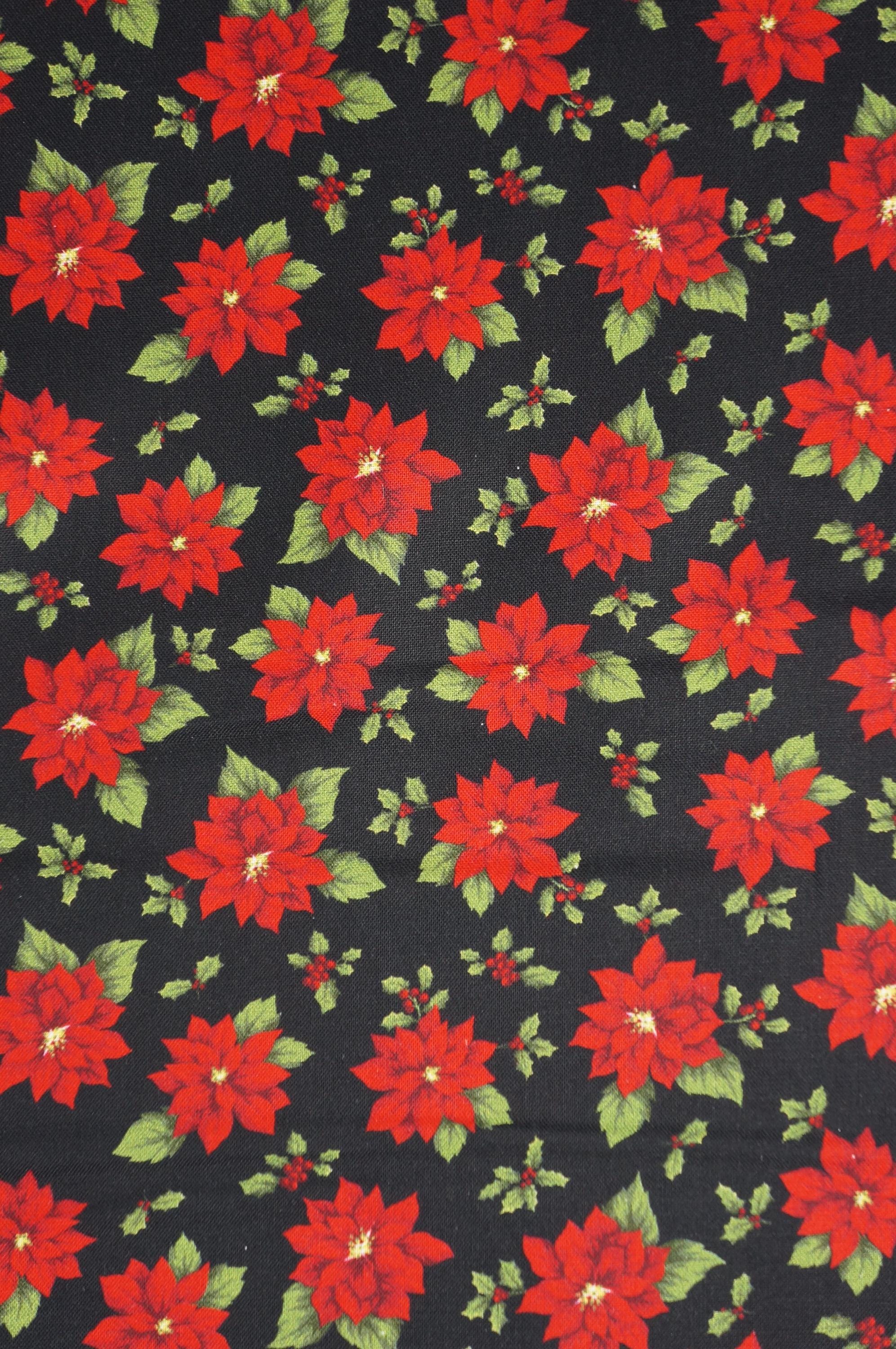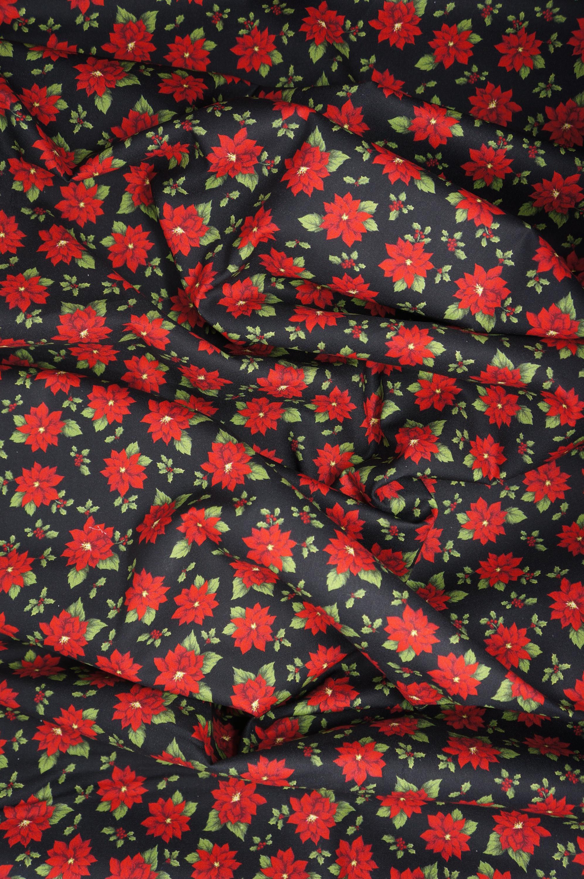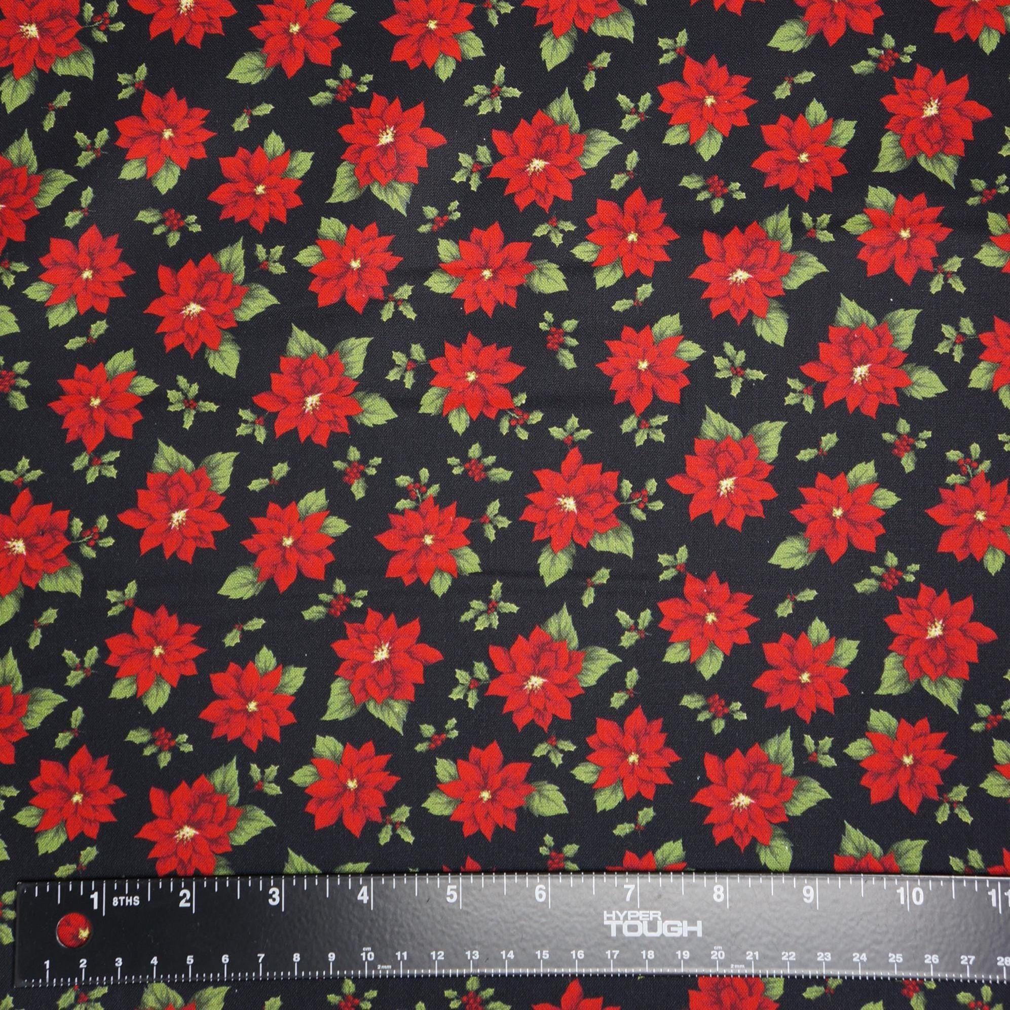 Poinsettia Toss on Black Quilting Cotton Fabric is a beautiful and festive fabric for your holiday projects. This fabric a is part of Holiday at Home Collection by Painted Sky Studio for Benartex. This fabric features tossed red poinsettias and holly leaves and berries, creating a lovely contrast with the rich background. This fabric is great for quilting, apparel and home decor, as it is soft, durable and easy to work with. Whether you want to make a cozy quilt, a stylish dress or a charming pillow, this fabric will bring some winter wonder to your creations.