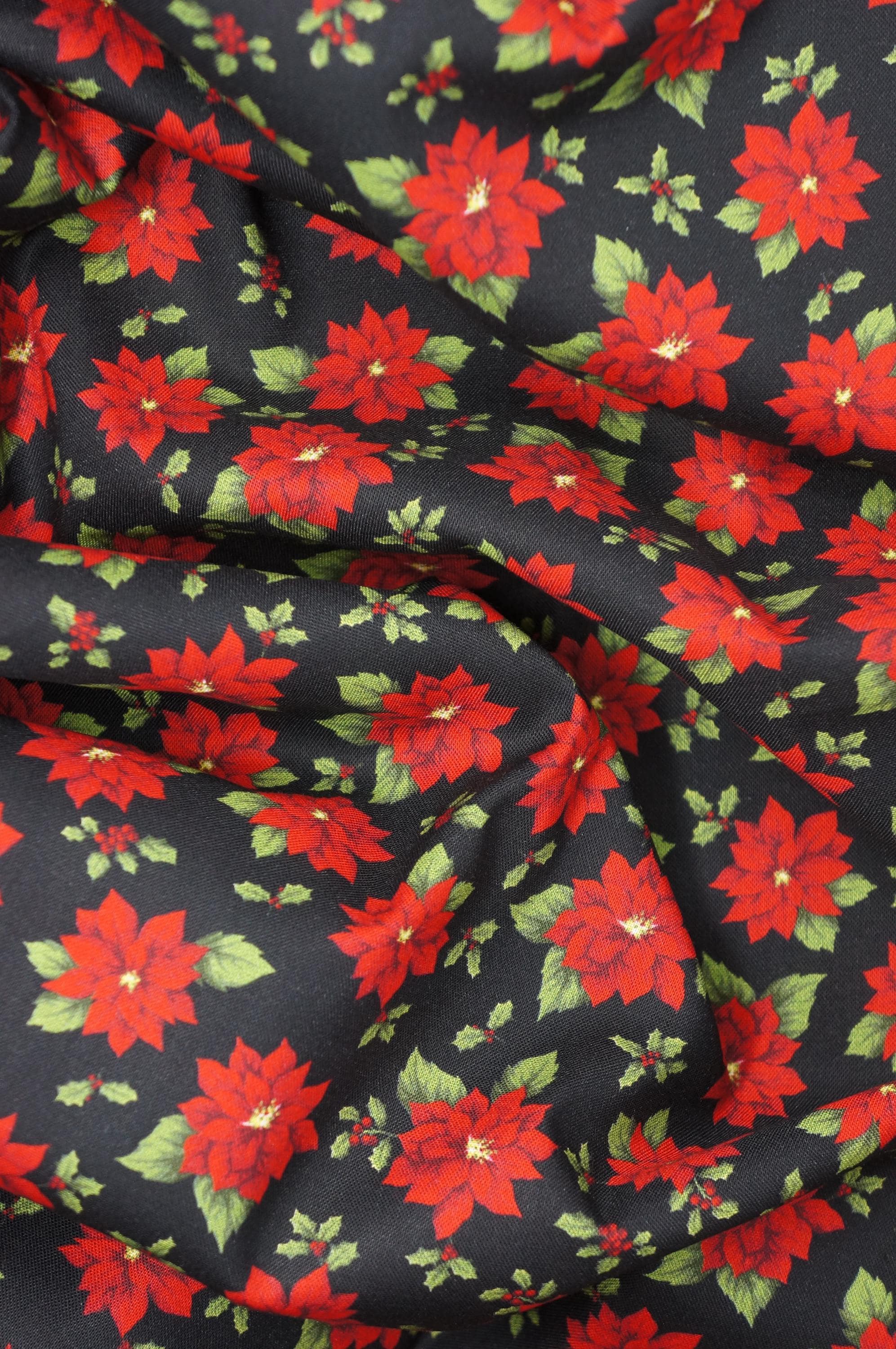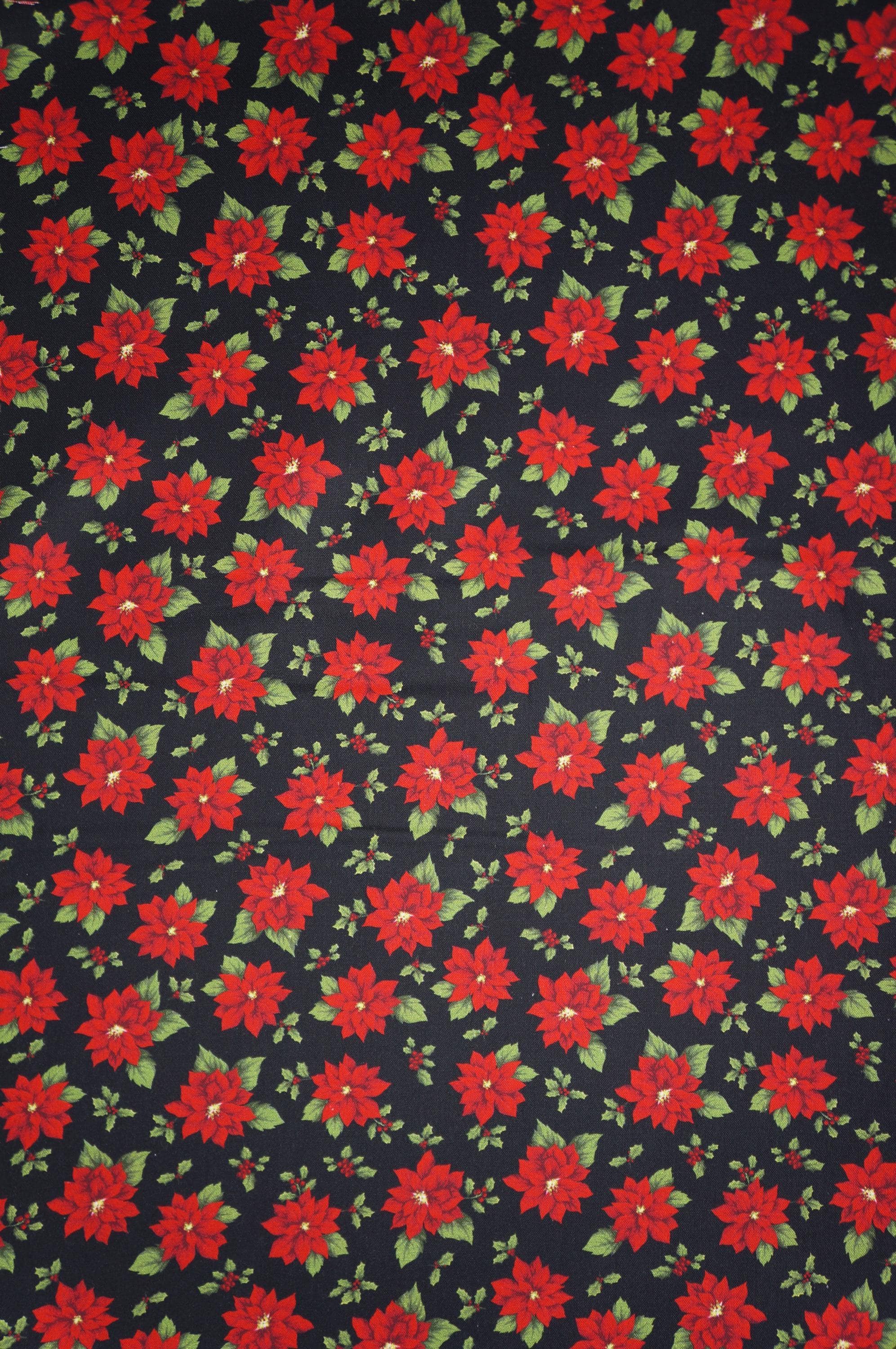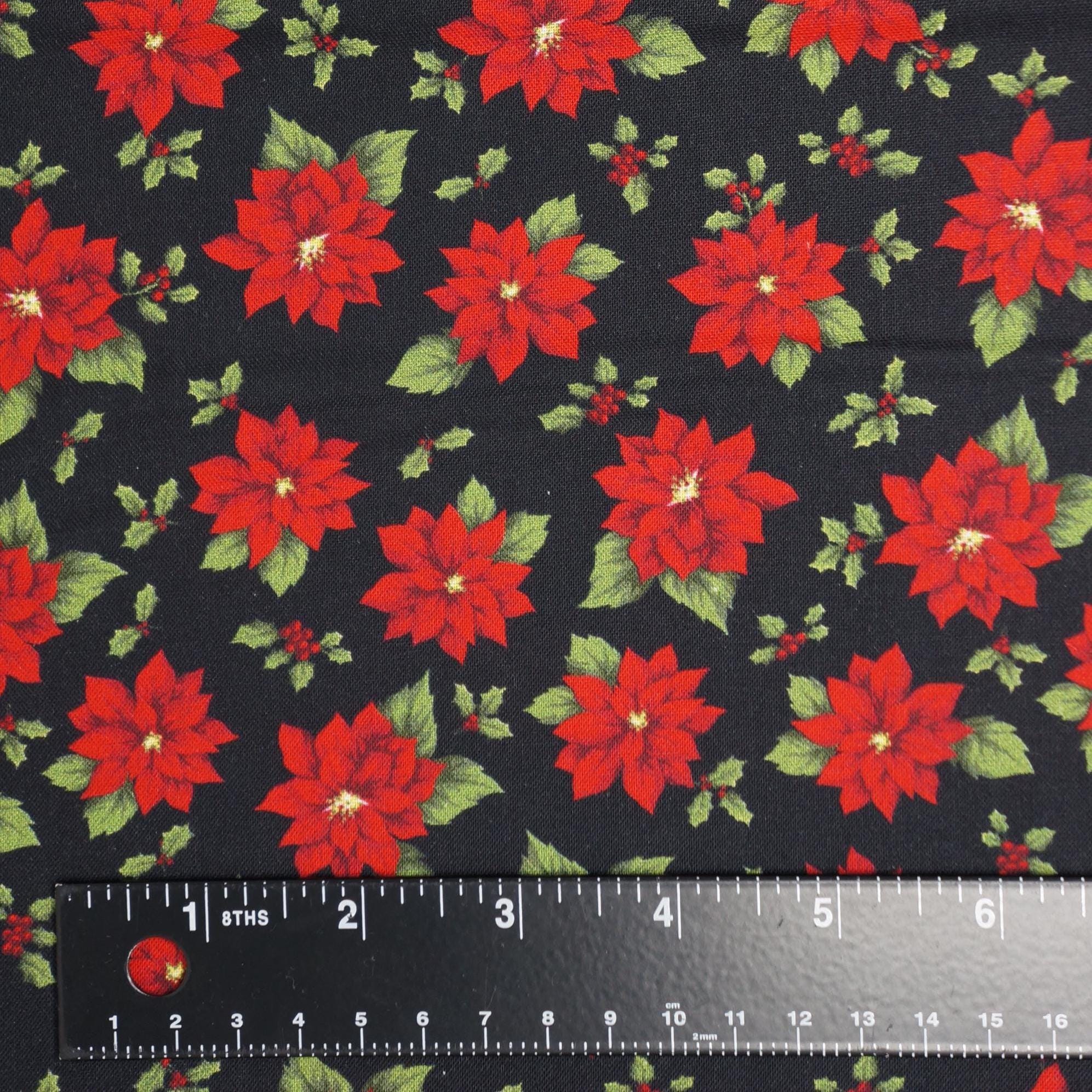 Poinsettia Toss on Black Quilting Cotton Fabric is a beautiful and festive fabric for your holiday projects. This fabric a is part of Holiday at Home Collection by Painted Sky Studio for Benartex. This fabric features tossed red poinsettias and holly leaves and berries, creating a lovely contrast with the rich background. This fabric is great for quilting, apparel and home decor, as it is soft, durable and easy to work with. Whether you want to make a cozy quilt, a stylish dress or a charming pillow, this fabric will bring some winter wonder to your creations.