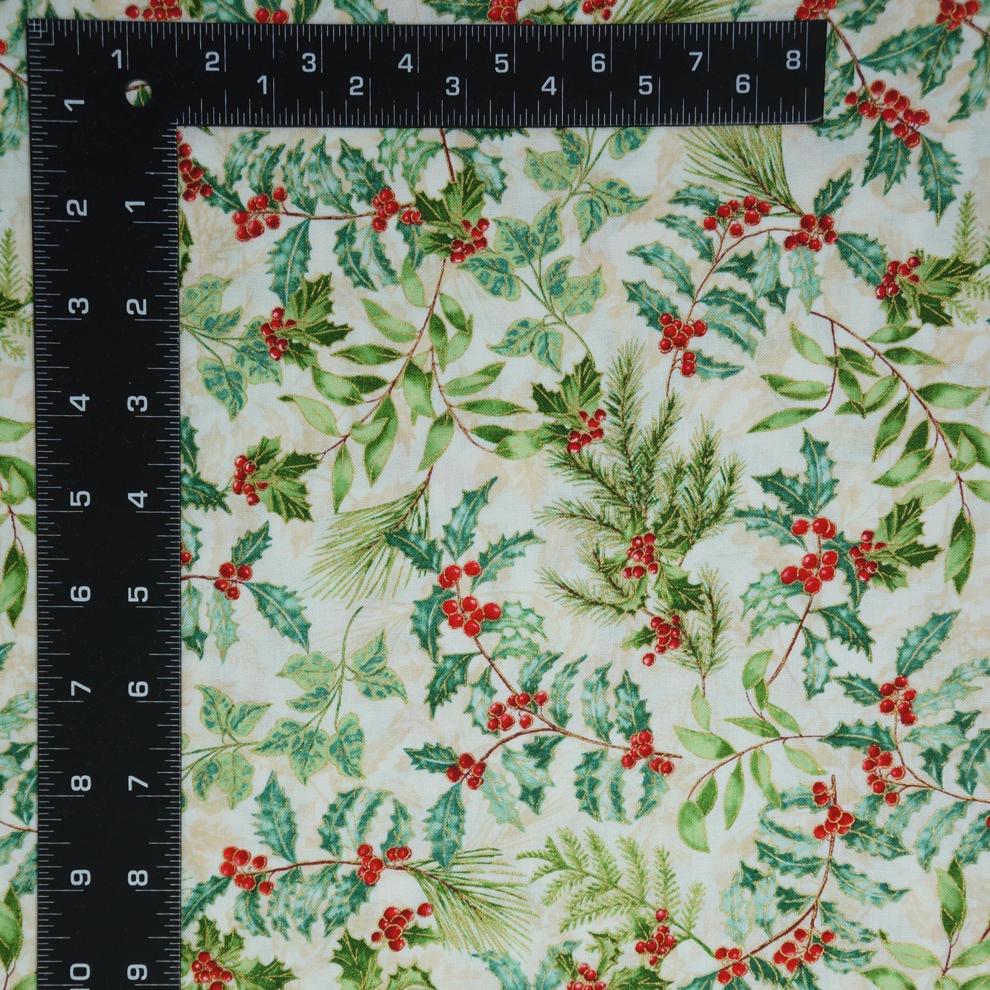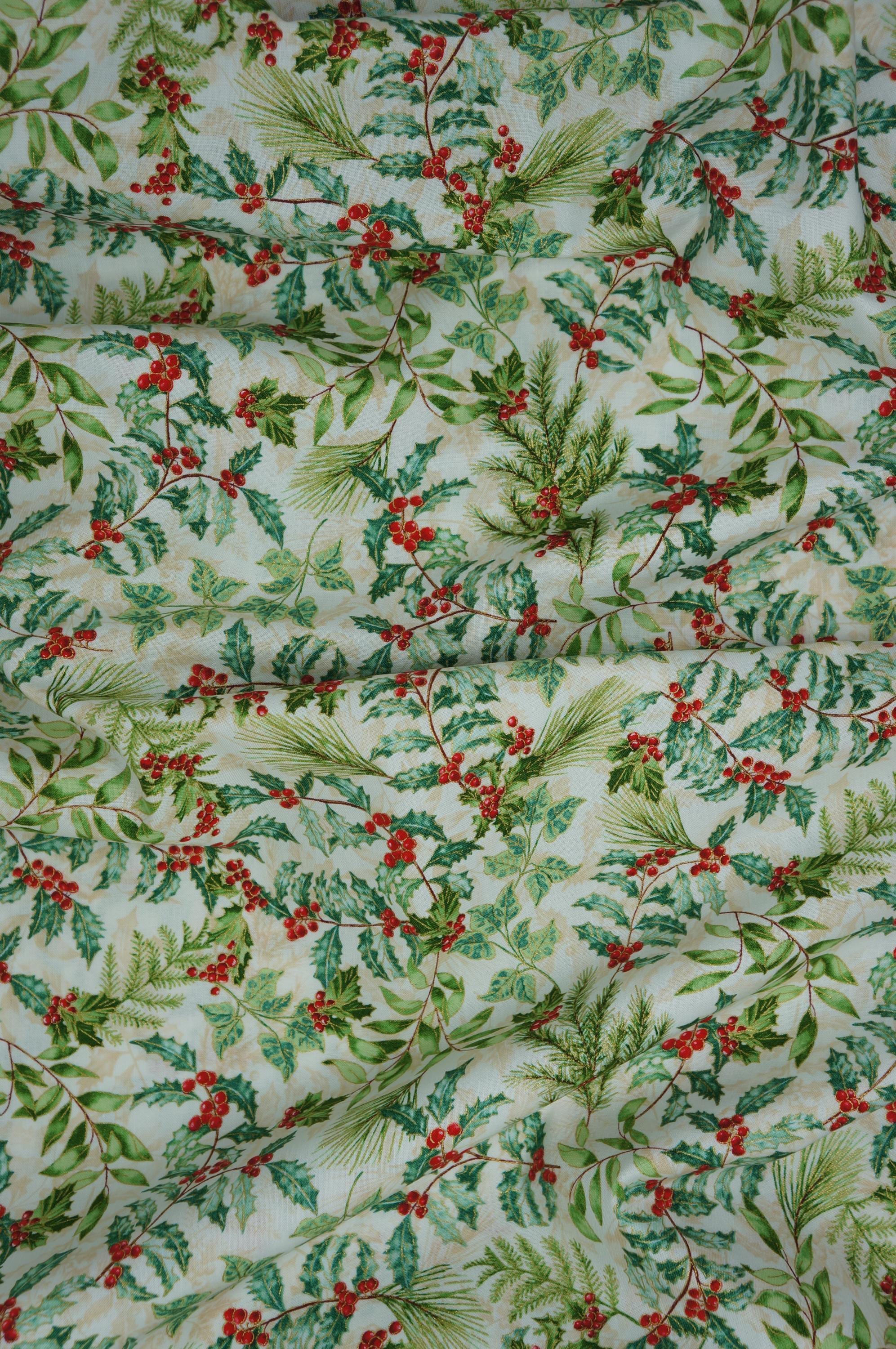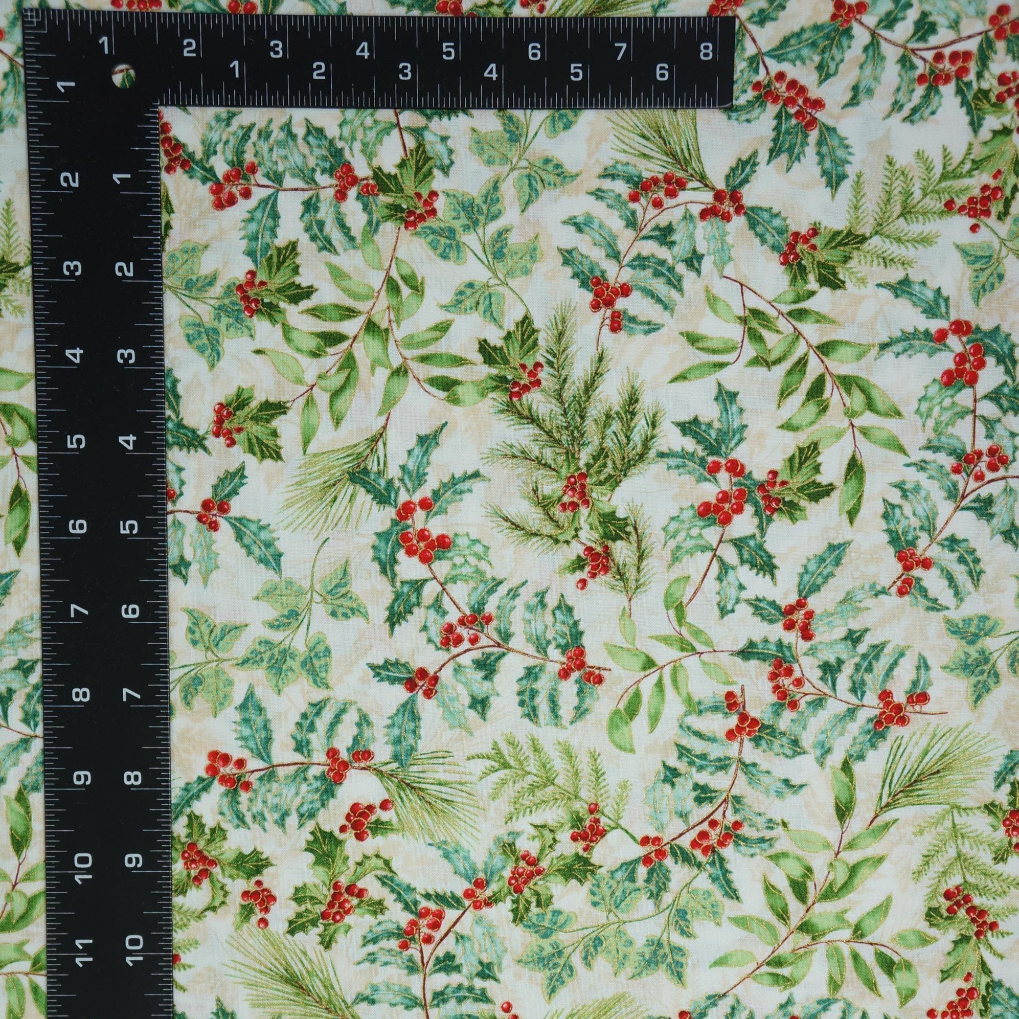 Holly and Berries on Cream with Gold Metallic Accents Quilting Cotton Fabric is a beautiful and festive fabric for your holiday projects. This fabric a is part of Christmas Musical Collection by Greta Lynn for Benartex Kanvas Studio. This fabric features tossed holly leaves and berries and holiday greens accented in gold outlining creating a lovely contrast with the rich textured cream background. This fabric is great for quilting, apparel and home decor, as it is soft, durable and easy to work with. Whether you want to make a cozy quilt, a stylish dress or a charming pillow, this fabric will bring some winter wonder to your creations.