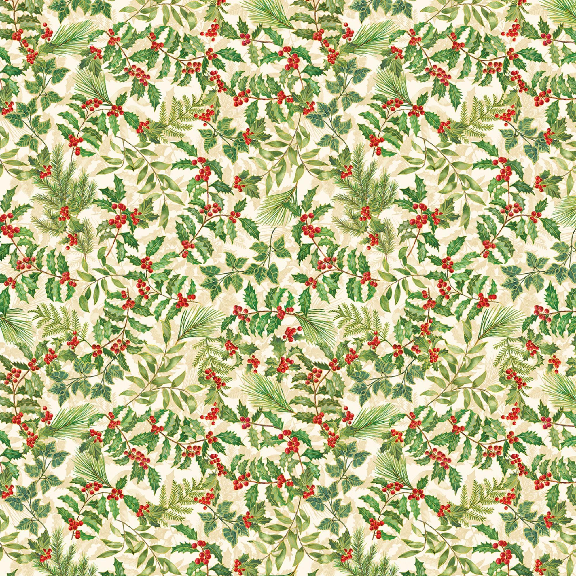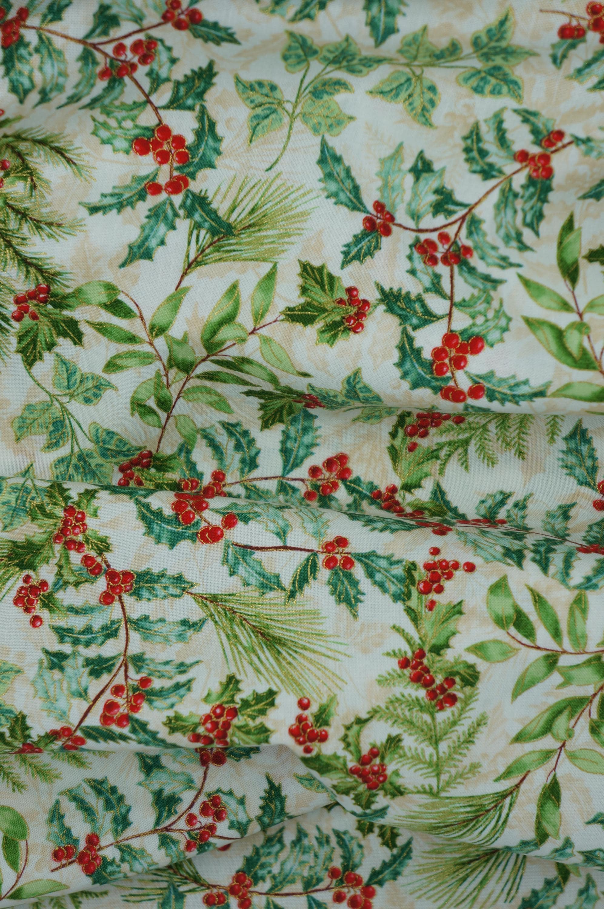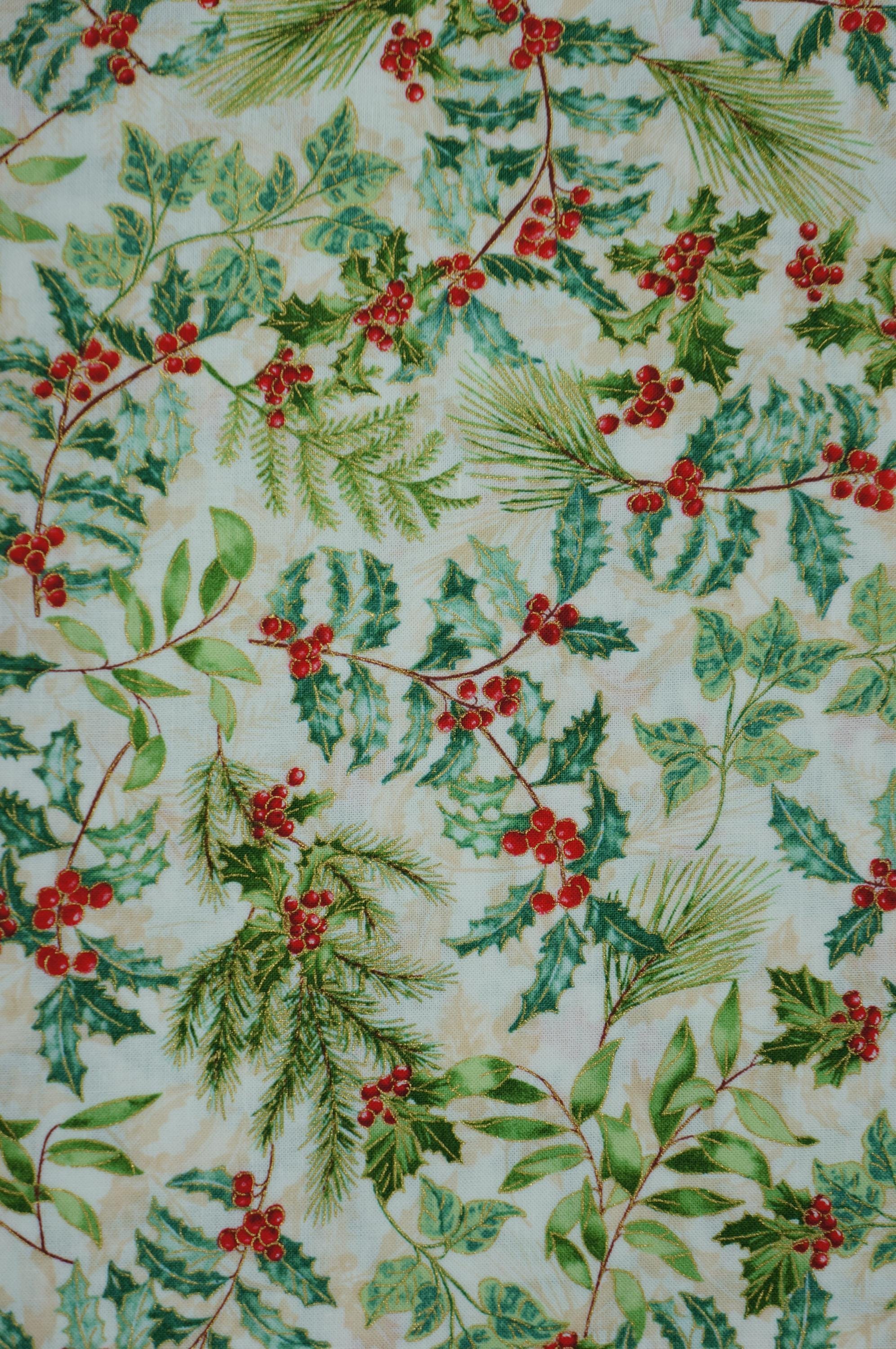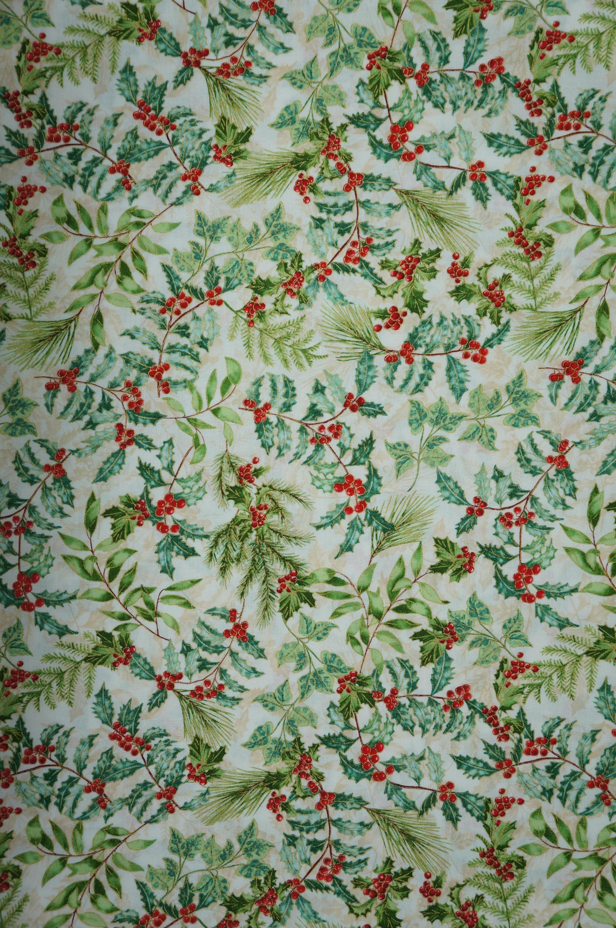 Holly and Berries on Cream with Gold Metallic Accents Quilting Cotton Fabric is a beautiful and festive fabric for your holiday projects. This fabric a is part of Christmas Musical Collection by Greta Lynn for Benartex Kanvas Studio. This fabric features tossed holly leaves and berries and holiday greens accented in gold outlining creating a lovely contrast with the rich textured cream background. This fabric is great for quilting, apparel and home decor, as it is soft, durable and easy to work with. Whether you want to make a cozy quilt, a stylish dress or a charming pillow, this fabric will bring some winter wonder to your creations.
