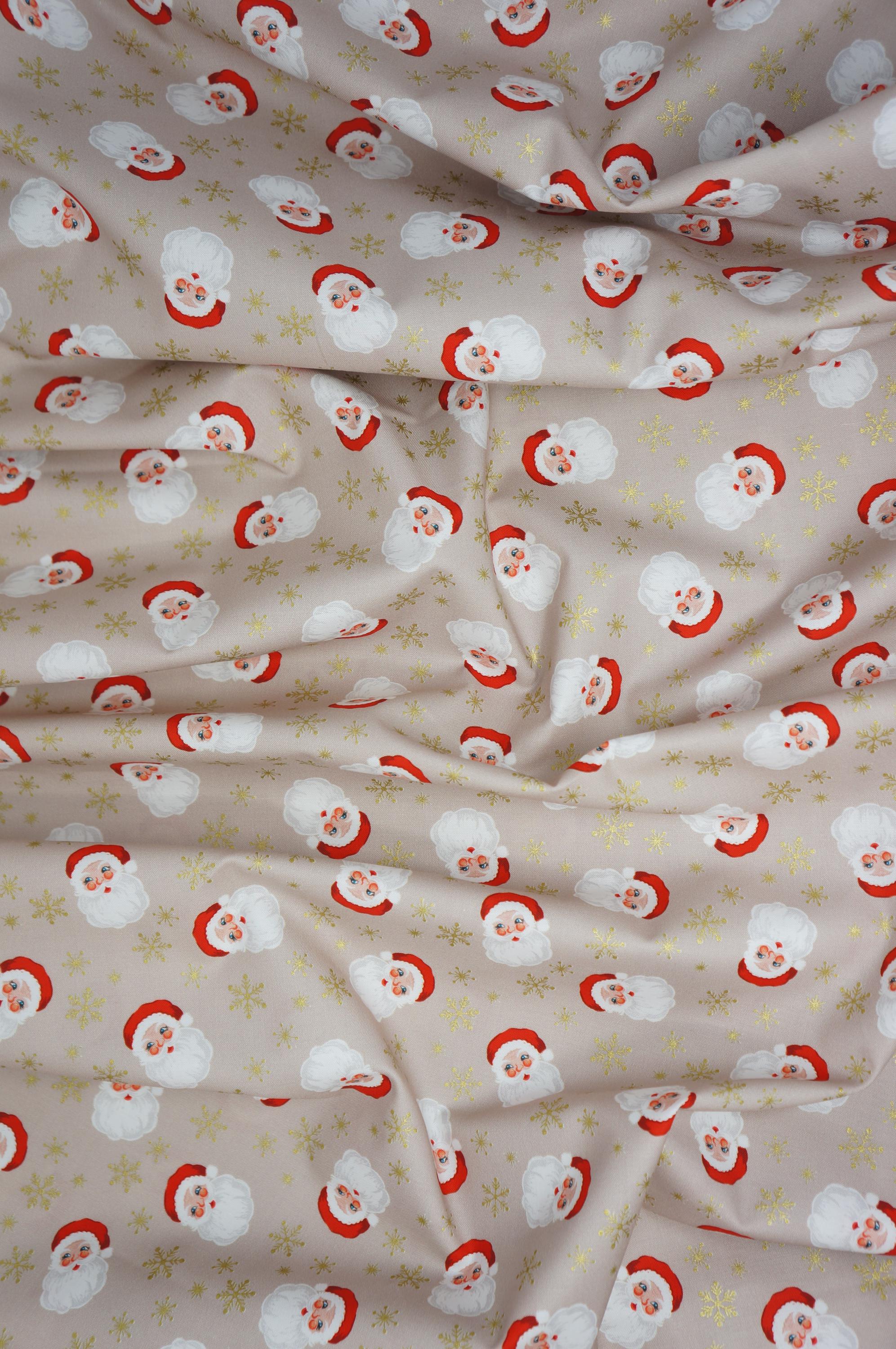 If you love Christmas and sewing, you will adore this quilting cotton fabric! Santa on Natural from the "Oh Christmas Tree!" Collection by Lewis and Irene is a festive and fun print that features tossed Santa heads and gold metallic snowflakes on a natural cream background. This fabric is perfect for making quilts, pillows, table runners, stockings, and more. It is 100% cotton and easy to work with. You can mix and match it with other Christmas fabrics from the Lewis & Irene "Oh Christmas Tree!" Collection or use it as a standalone piece. Either way, you will create something beautiful and cheerful with this fabric!