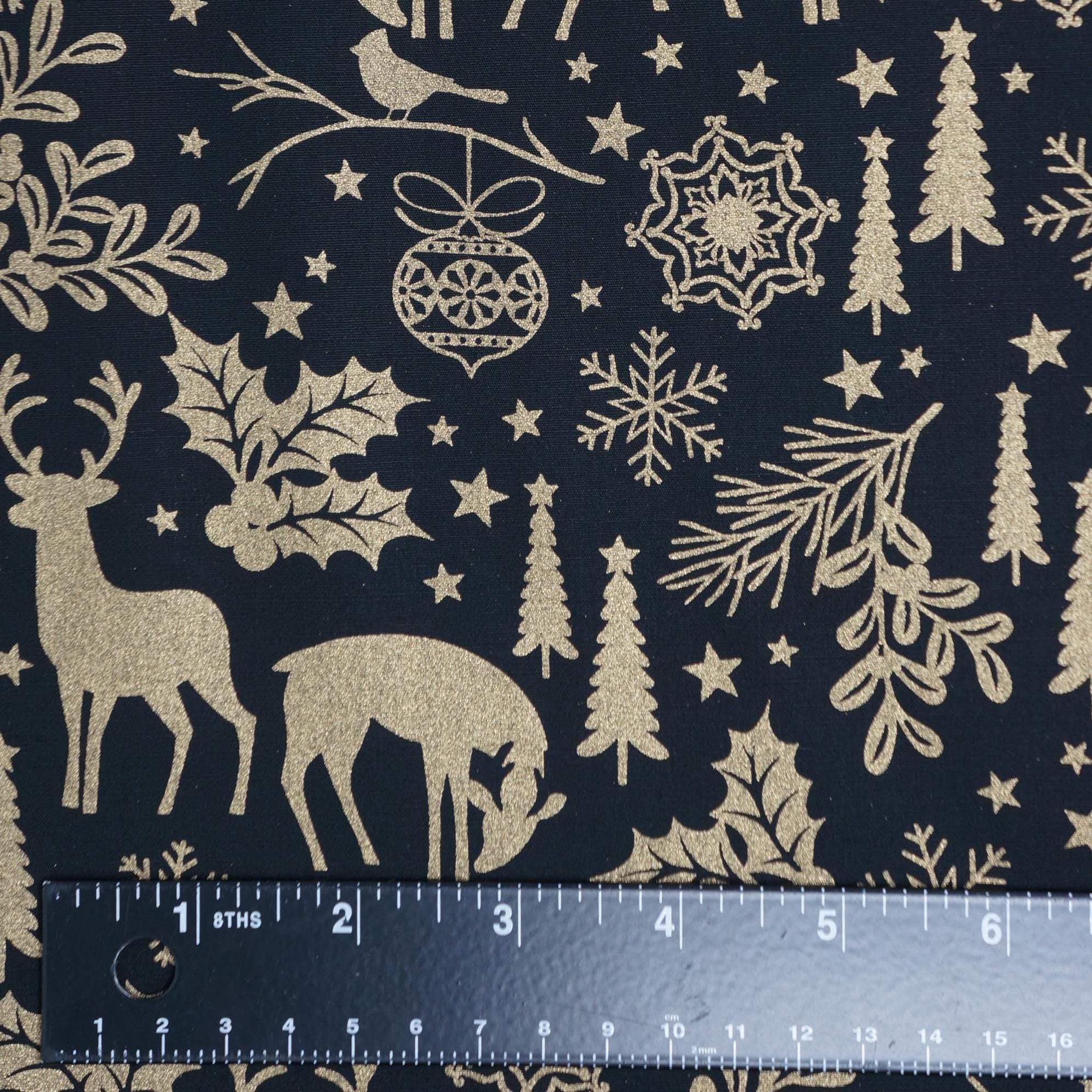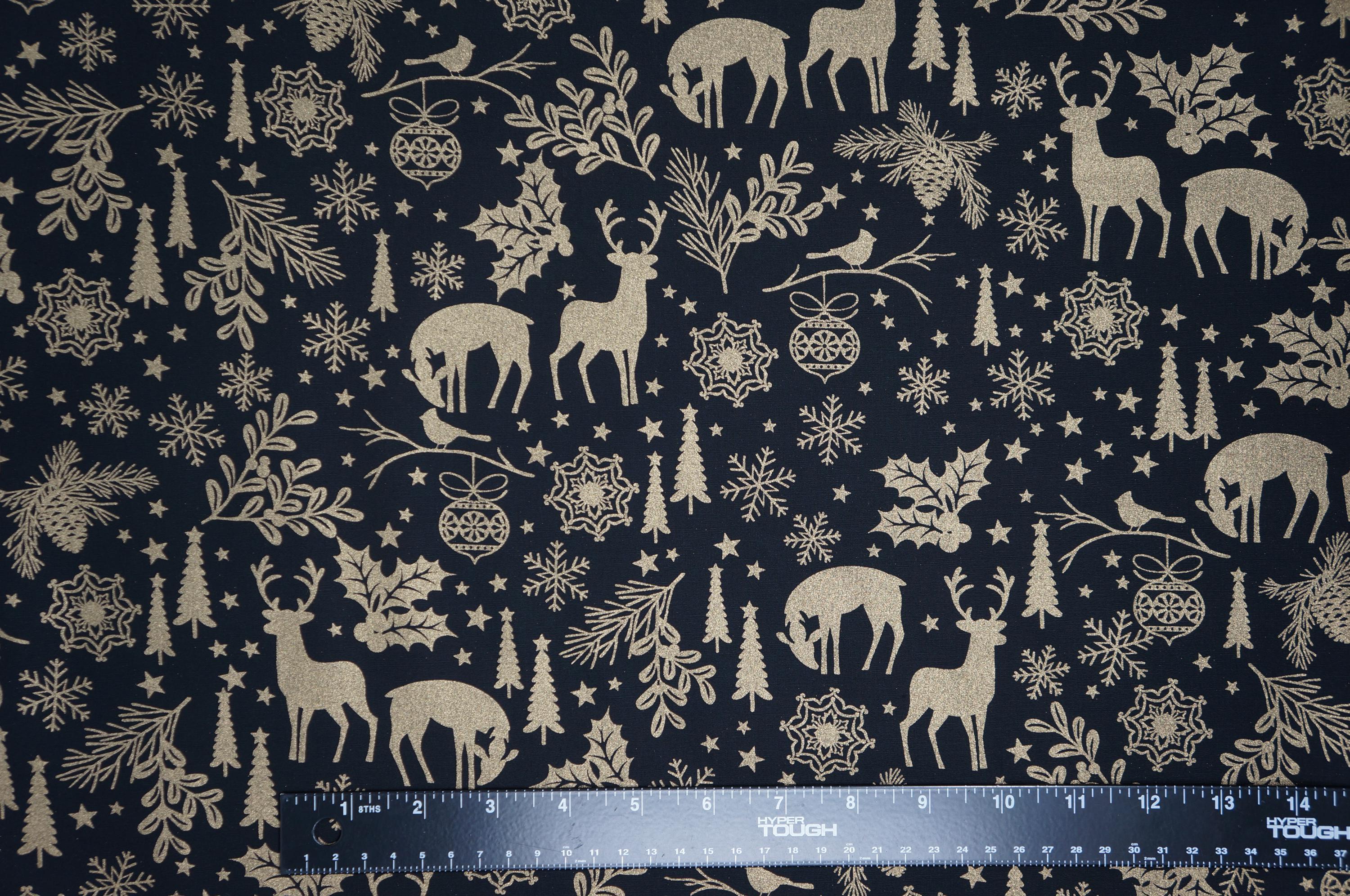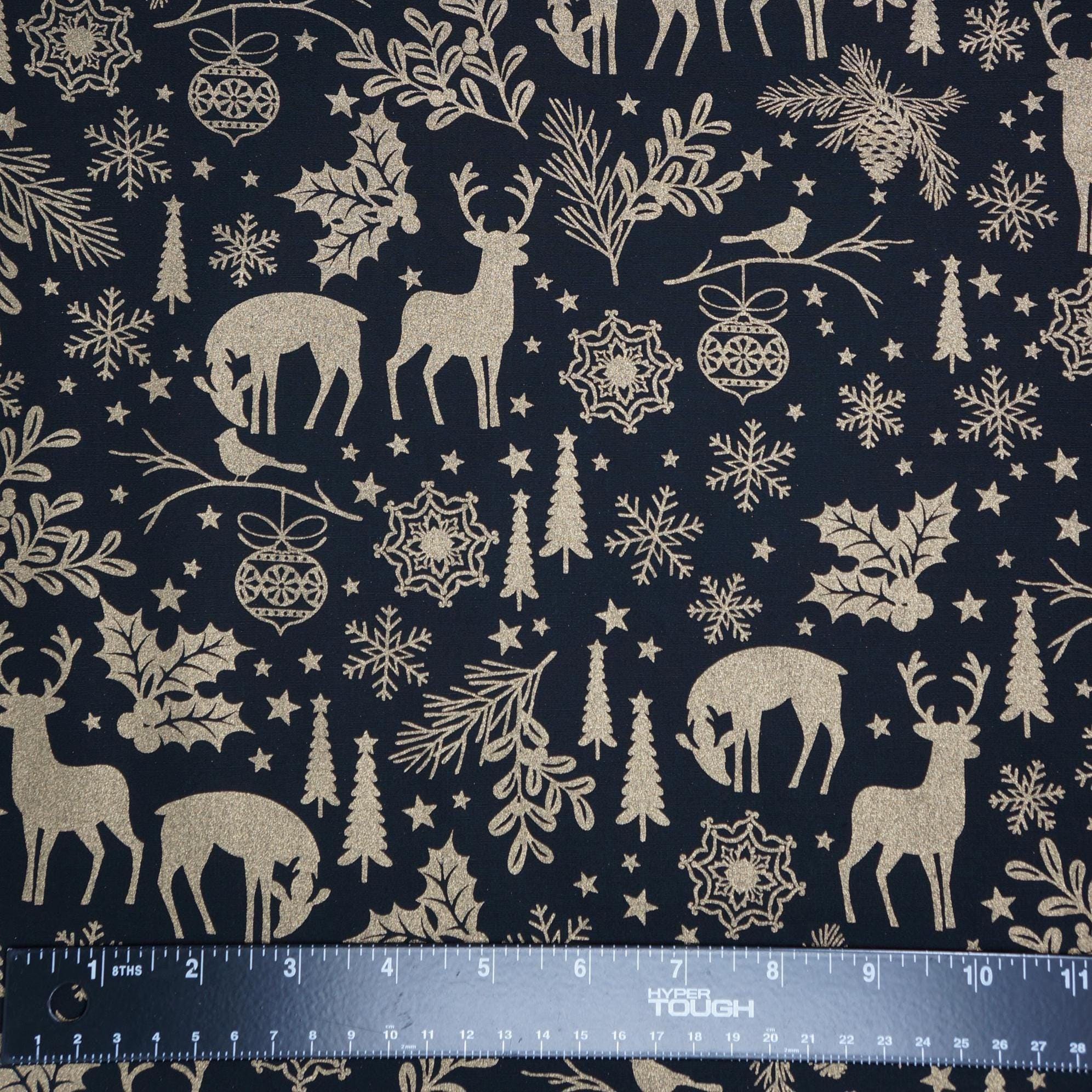 Add a touch of festive elegance to your holiday projects with our stunning Holiday Forest Quilting Cotton Fabric from the Holiday Sparkle Collection by Greta Lynn for Benartex Kanvas Studio. This fabric showcases gold metallic deer, snowflakes holly, tees and stars on a rich black background. The fabric is actually dyed black, so both sides of this fabric are black. Whether you’re crafting a cozy quilt, festive table runner, or holiday décor, this premium cotton fabric promises to bring warmth, joy, and a luxurious shimmer to your creations. Don’t miss out on this beautiful addition to your holiday fabric stash!