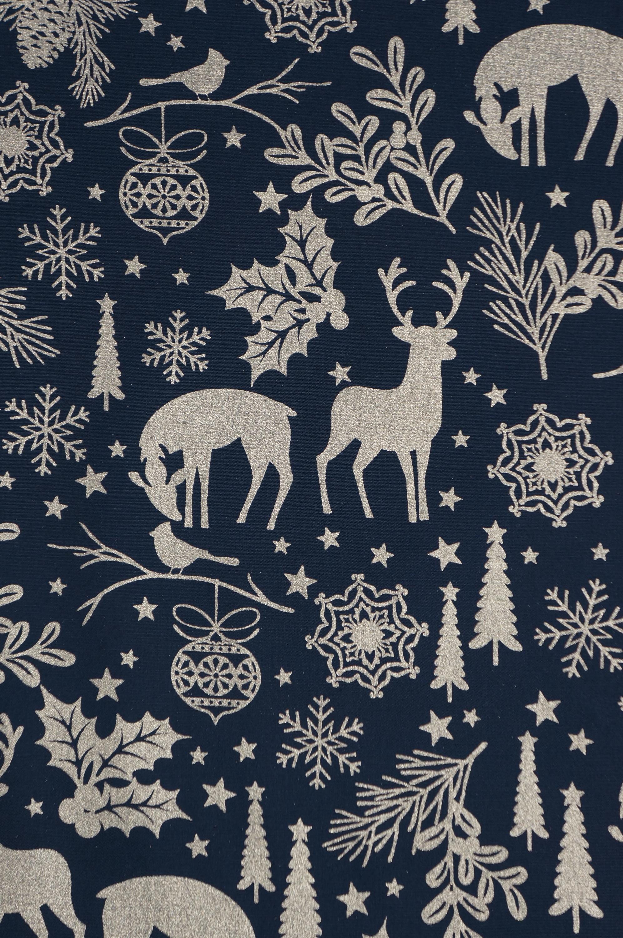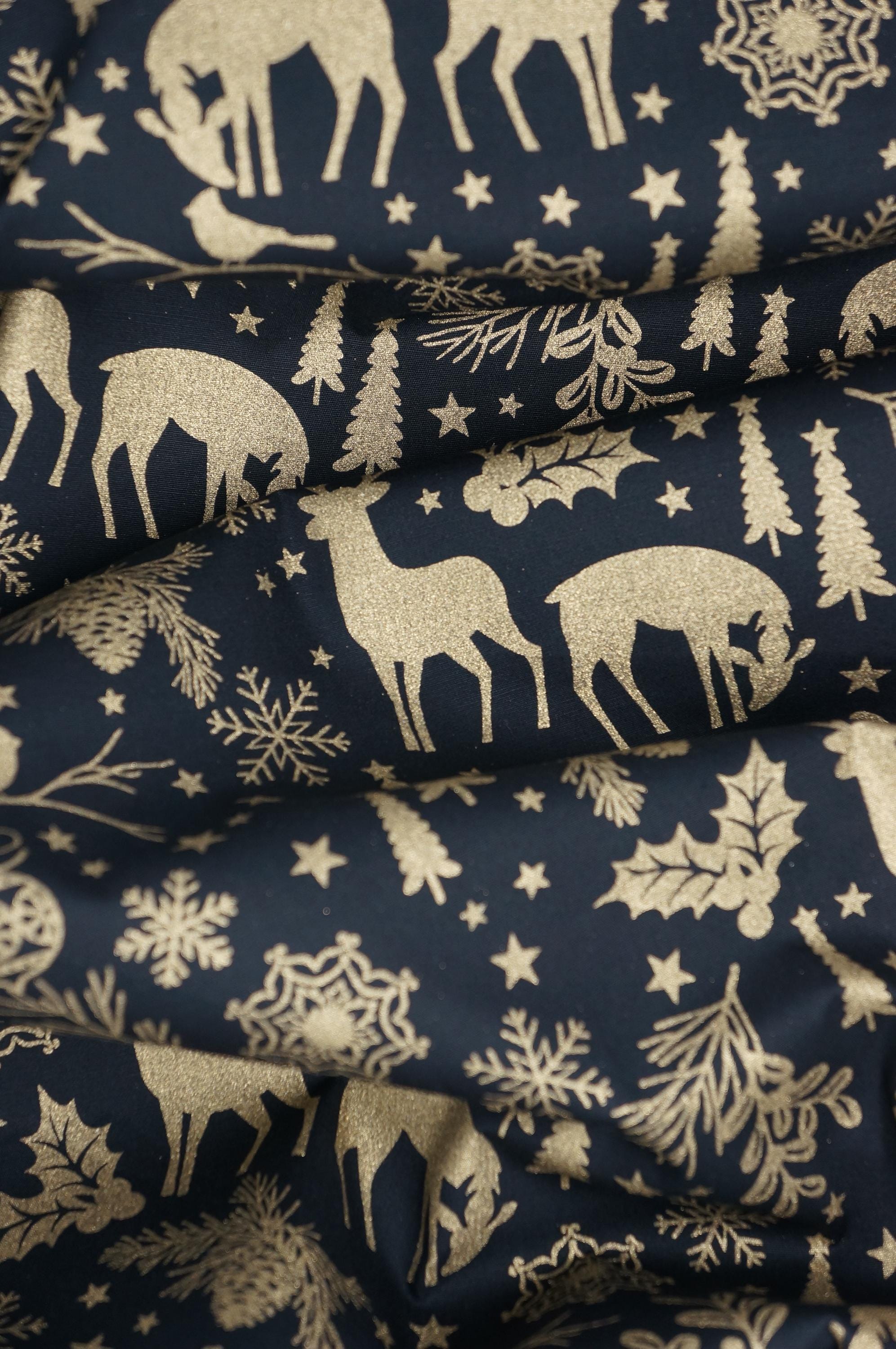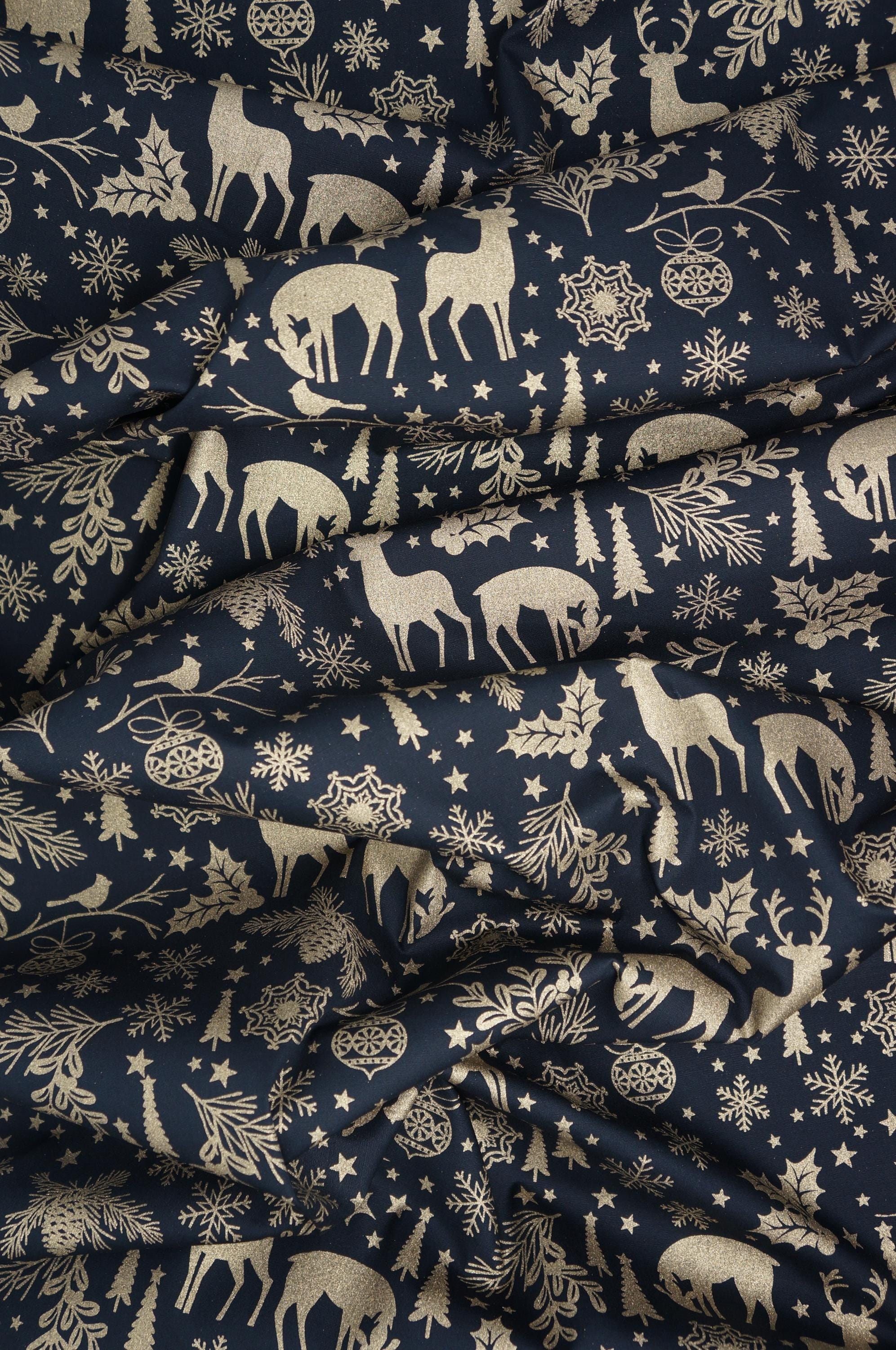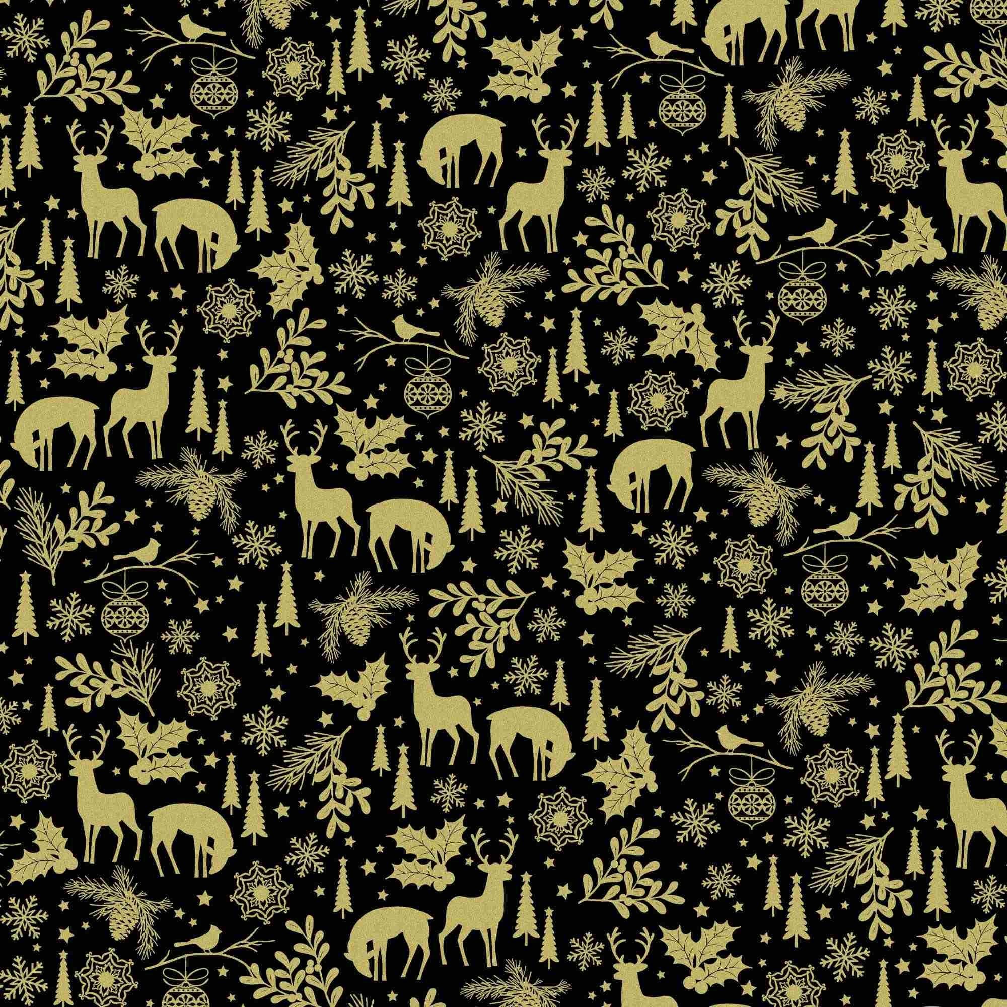 Add a touch of festive elegance to your holiday projects with our stunning Holiday Forest Quilting Cotton Fabric from the Holiday Sparkle Collection by Greta Lynn for Benartex Kanvas Studio. This fabric showcases gold metallic deer, snowflakes holly, tees and stars on a rich black background. The fabric is actually dyed black, so both sides of this fabric are black. Whether you’re crafting a cozy quilt, festive table runner, or holiday décor, this premium cotton fabric promises to bring warmth, joy, and a luxurious shimmer to your creations. Don’t miss out on this beautiful addition to your holiday fabric stash!