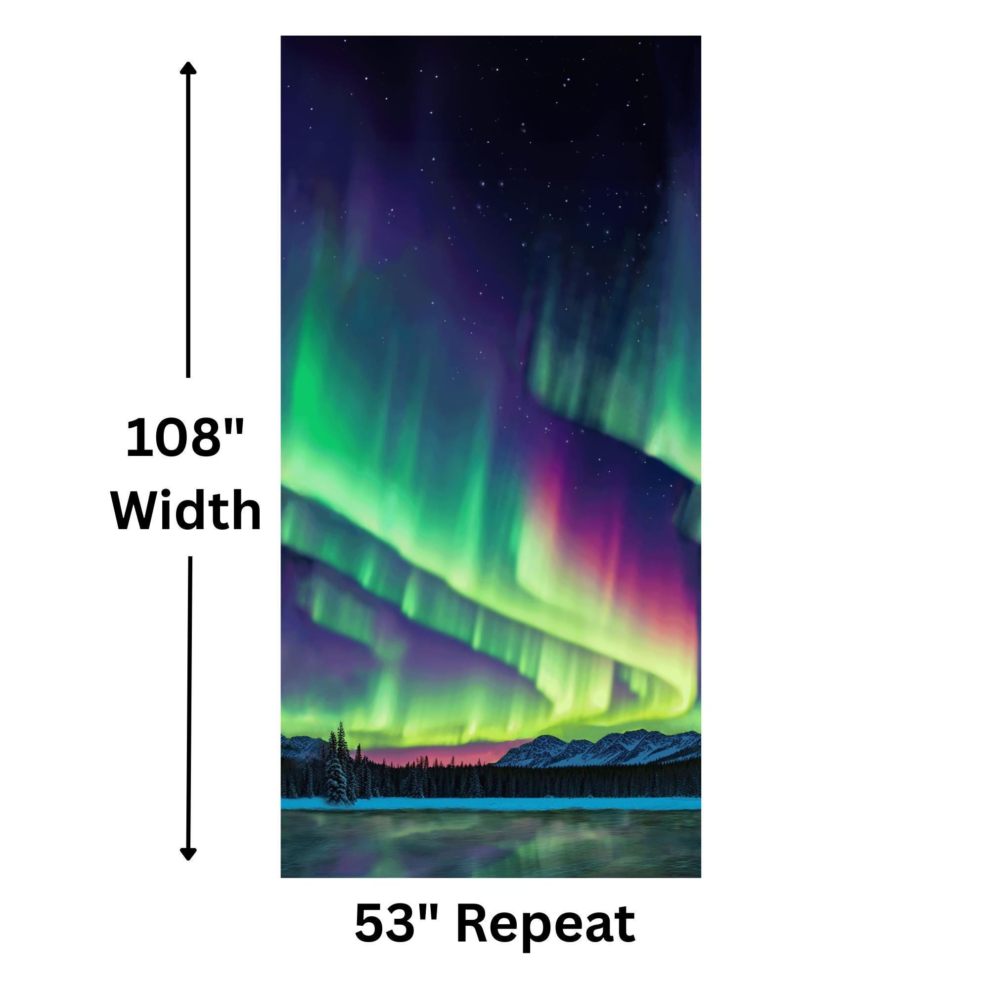 If you love the northern lights, you'll adore this beautiful digitally printed wide back quilting cotton fabric from Studio E's Cosmic Flow collection by Crazy Marie! It features a forest, water and mountain landscape on a background of the most beautiful Aurora or Northern Lights in black, blues, greens and pinks. The design is seamless, with a 53" repeat. So, if you order multiple quantities the fabric will be continuous without any interruption of the pattern. This is not a panel. This fabric is made of 100% cotton and is 108" wide. It is perfect for quilting, crafts, home decor, nurseries and more. You'll have so much fun creating projects with this whimsical and charming fabric!