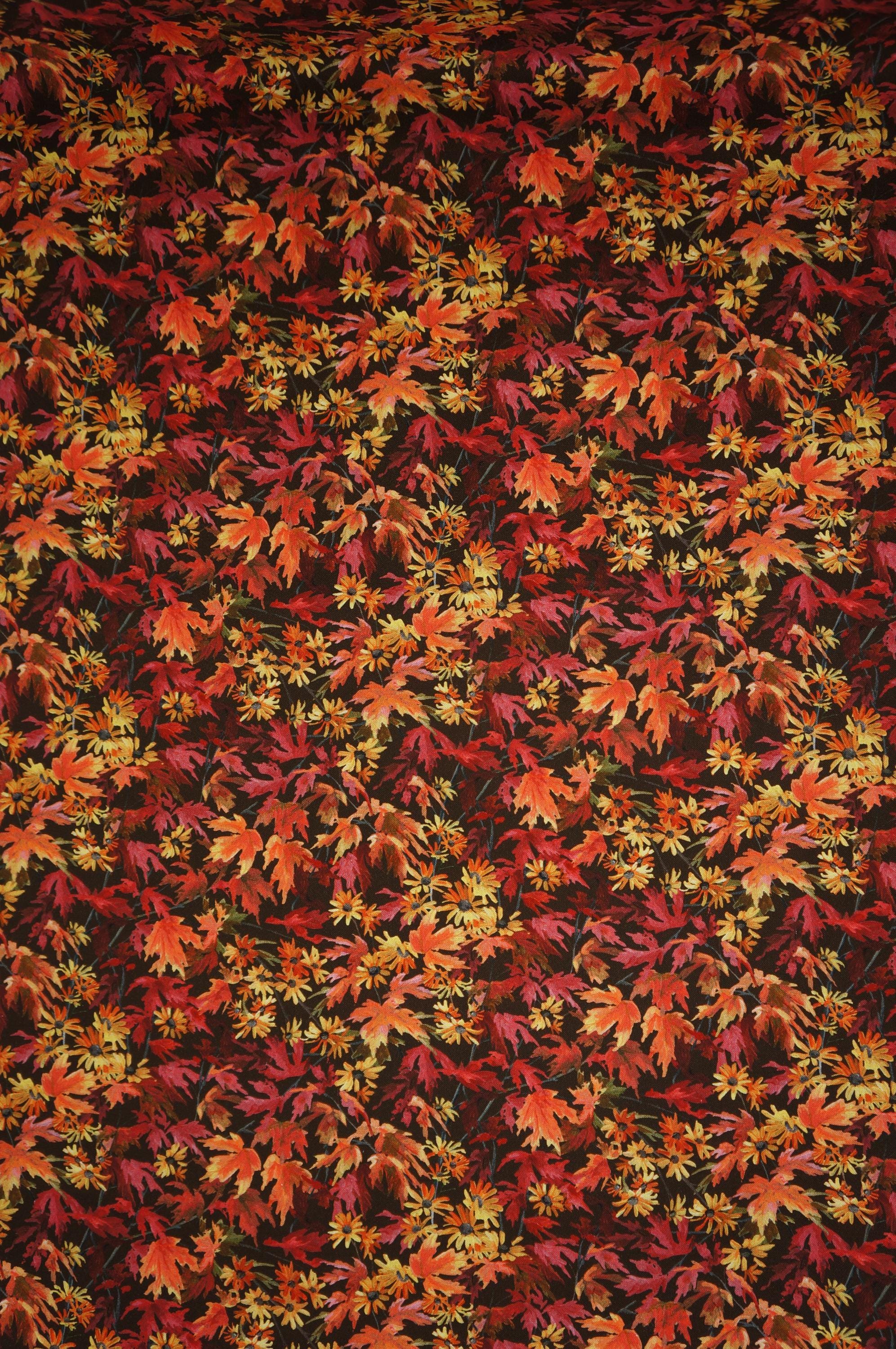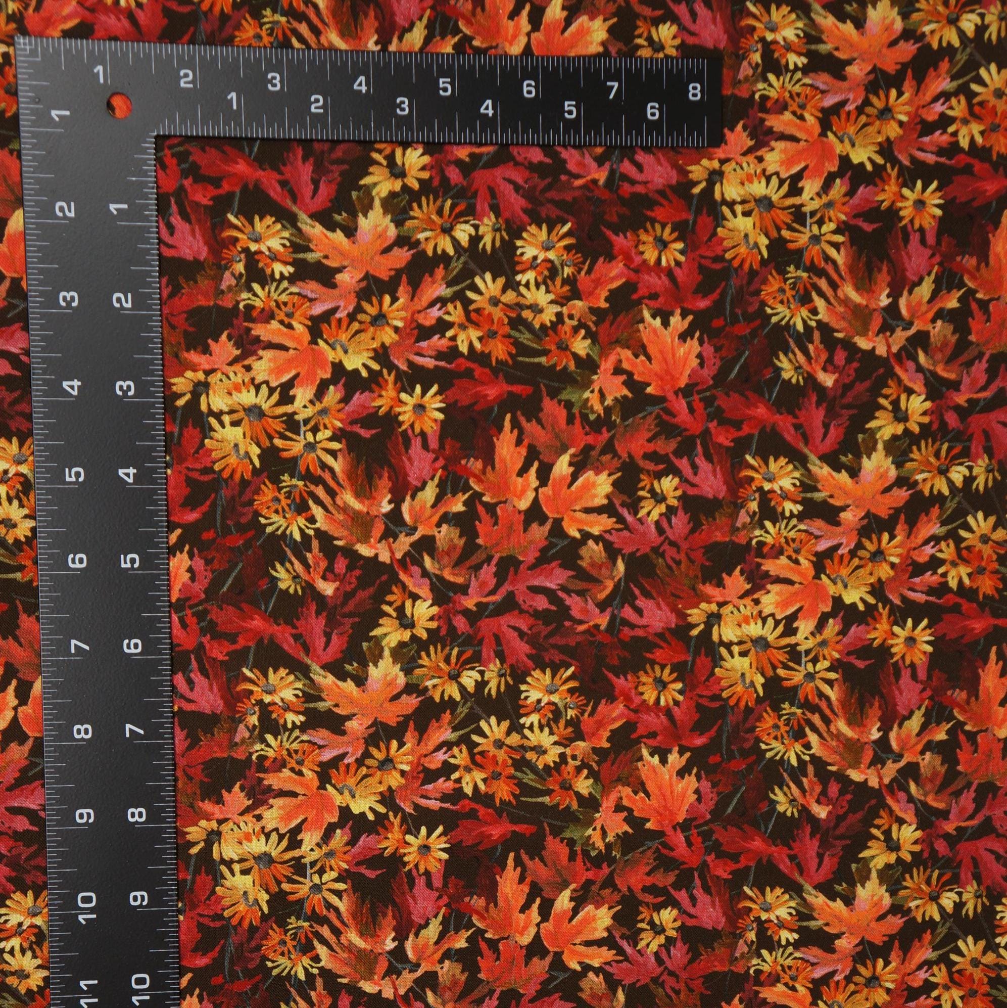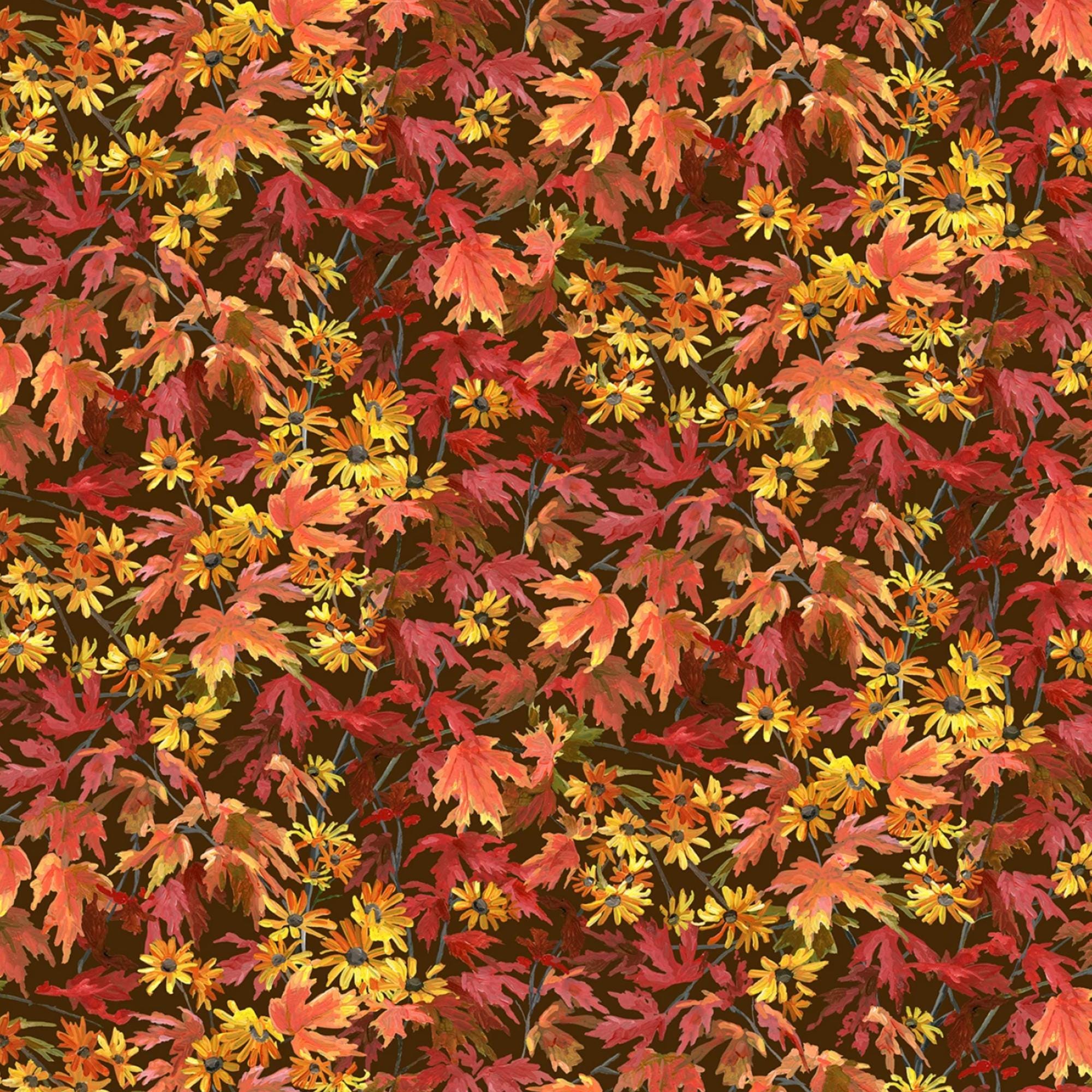 Tossed Leaves Harvest is a stunning quilting cotton fabric from the Autumn Retreat by Abraham Hunter from P & B Textiles. This fabric features a vibrant autumnal design with a rich tapestry of tossed leaves in shades of red, orange, and yellow, interspersed with delicate yellow flowers. The pattern evokes the essence of a fall harvest, bringing the warmth and beauty of the season into any project. The leaves are intricately detailed, providing a realistic and dynamic visual texture that is perfect for seasonal crafts, quilting, or home decor.