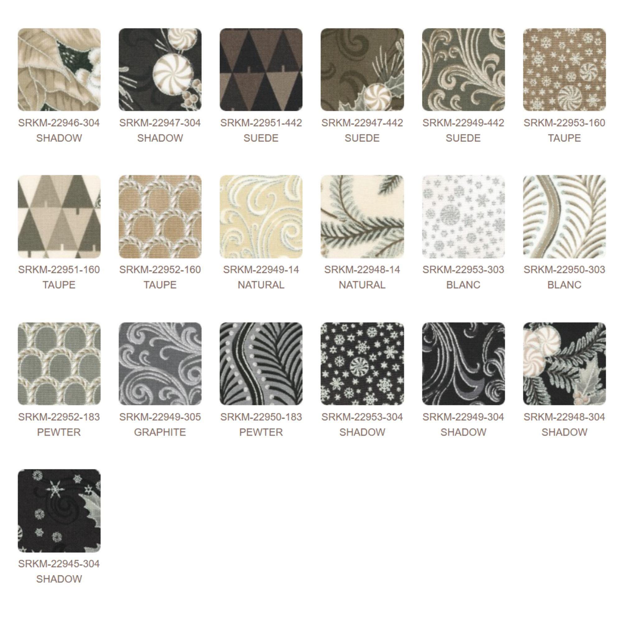 This charming set of 5" fabric squares is perfect for holiday crafting and quilting projects. Featuring a delightful 'Peppermint Twist' design, these 5-inch squares are part of the 'Holiday Flourish' series, offering a festive and intricate pattern that brings a touch of winter magic to your creations with metallic silver accents. Made from 100% cotton, these squares ensure quality and comfort, making them ideal for both traditional and modern sewing projects. The 'Graphite' colorway adds a sophisticated touch, blending seamlessly with various holiday themes!