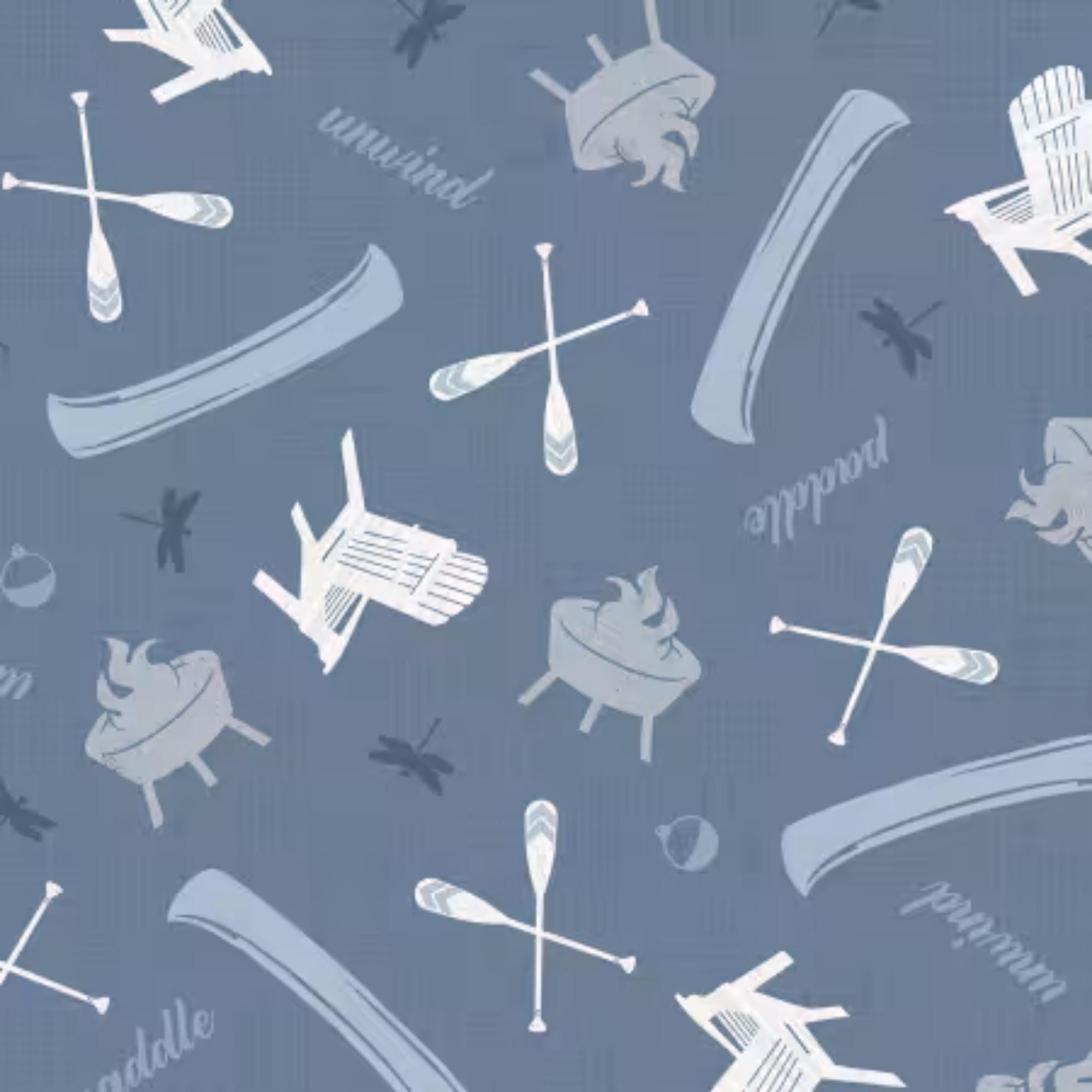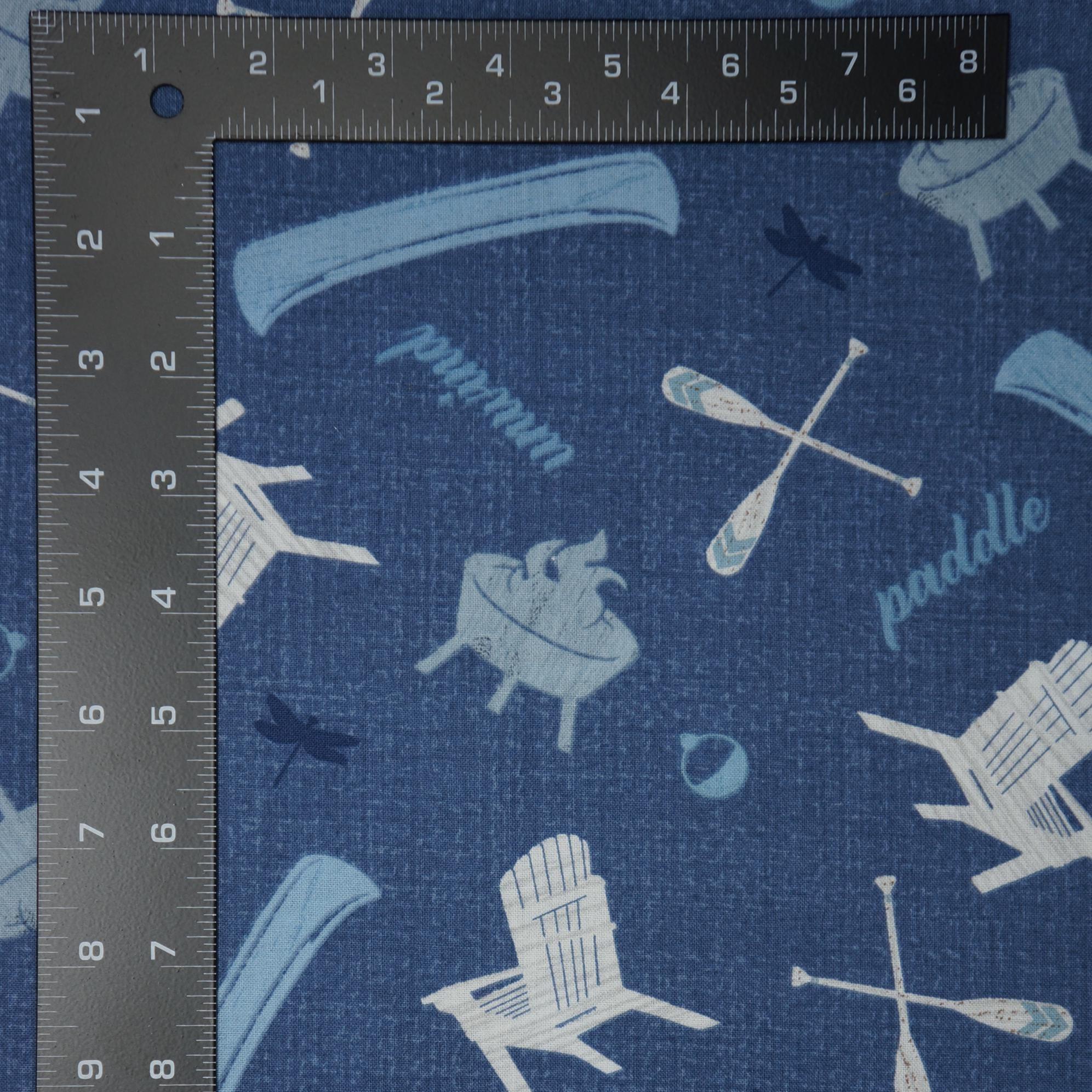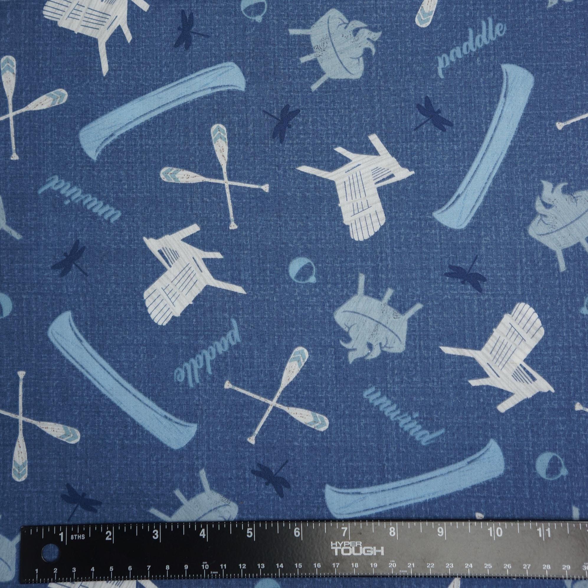 Transform your lake haven into a cozy retreat with our enchanting Denim-Blue Lakeside Toss quilting cotton fabric from the Lake Retreat Collection by PDR LLC for Wilmington Prints. This delightful design features Adirondak Chairs, canoe paddles, canoes, bobbers, dragonflies, campfires and the words "paddle" and "unwind" tossed on a denim-blue background in a color palette of blues, gray, and white. Whether you're stitching up cushions, quilts, or tote bags, this fabric embodies the essence of Lake Life bliss. Dive into creativity and infuse your space with the tranquil vibes of Lake Retreat, making every day feel like a lake getaway.