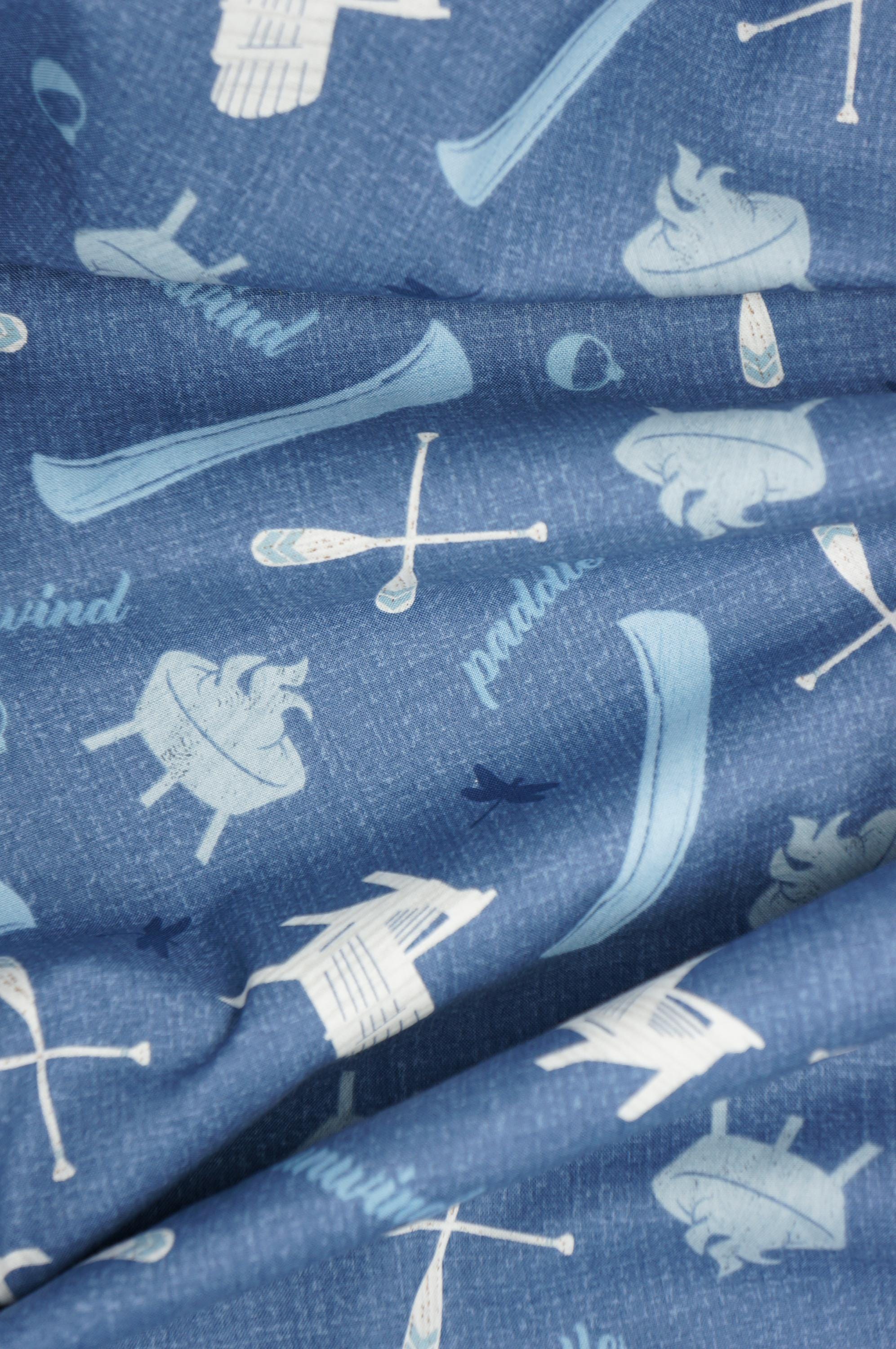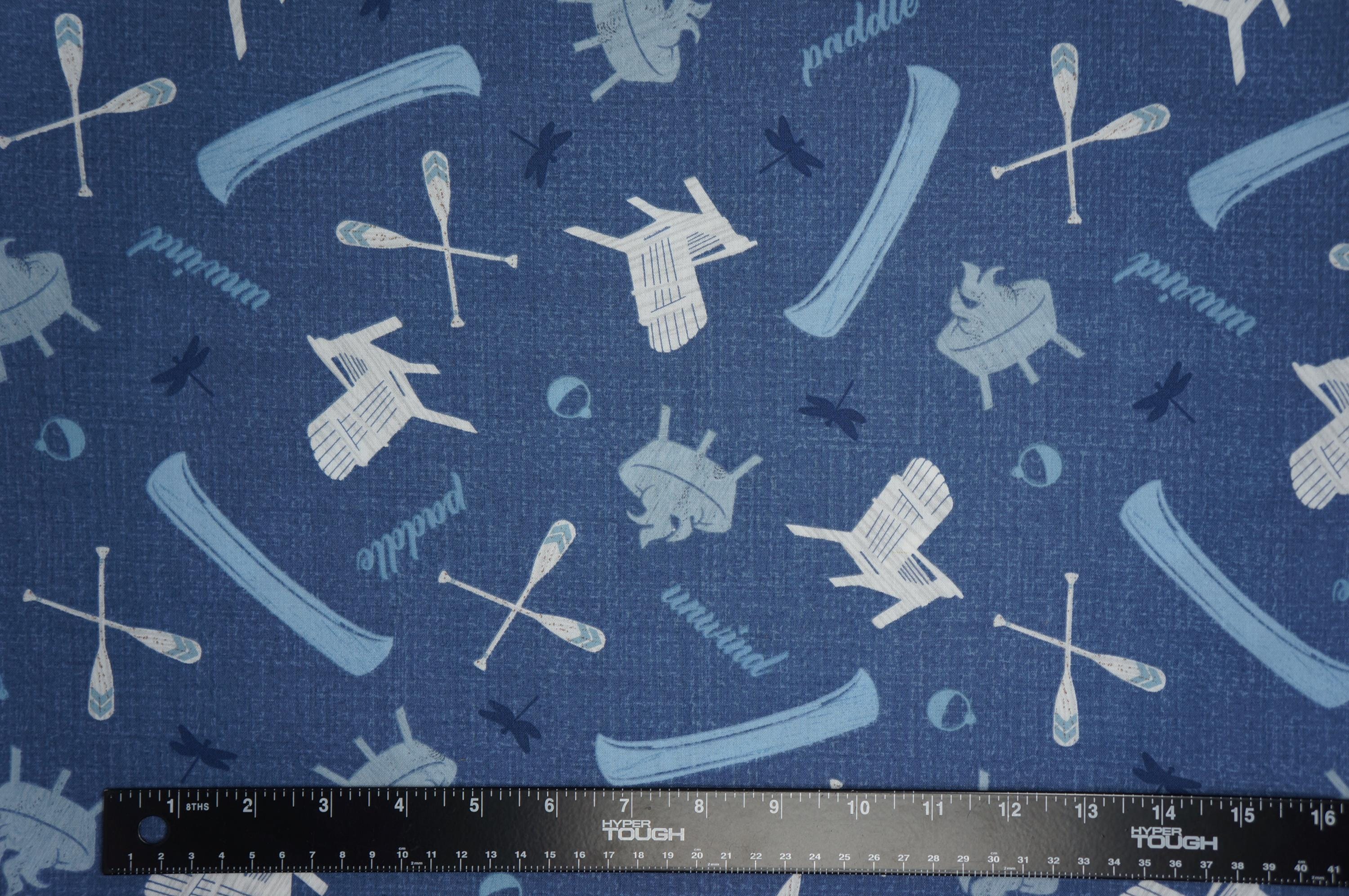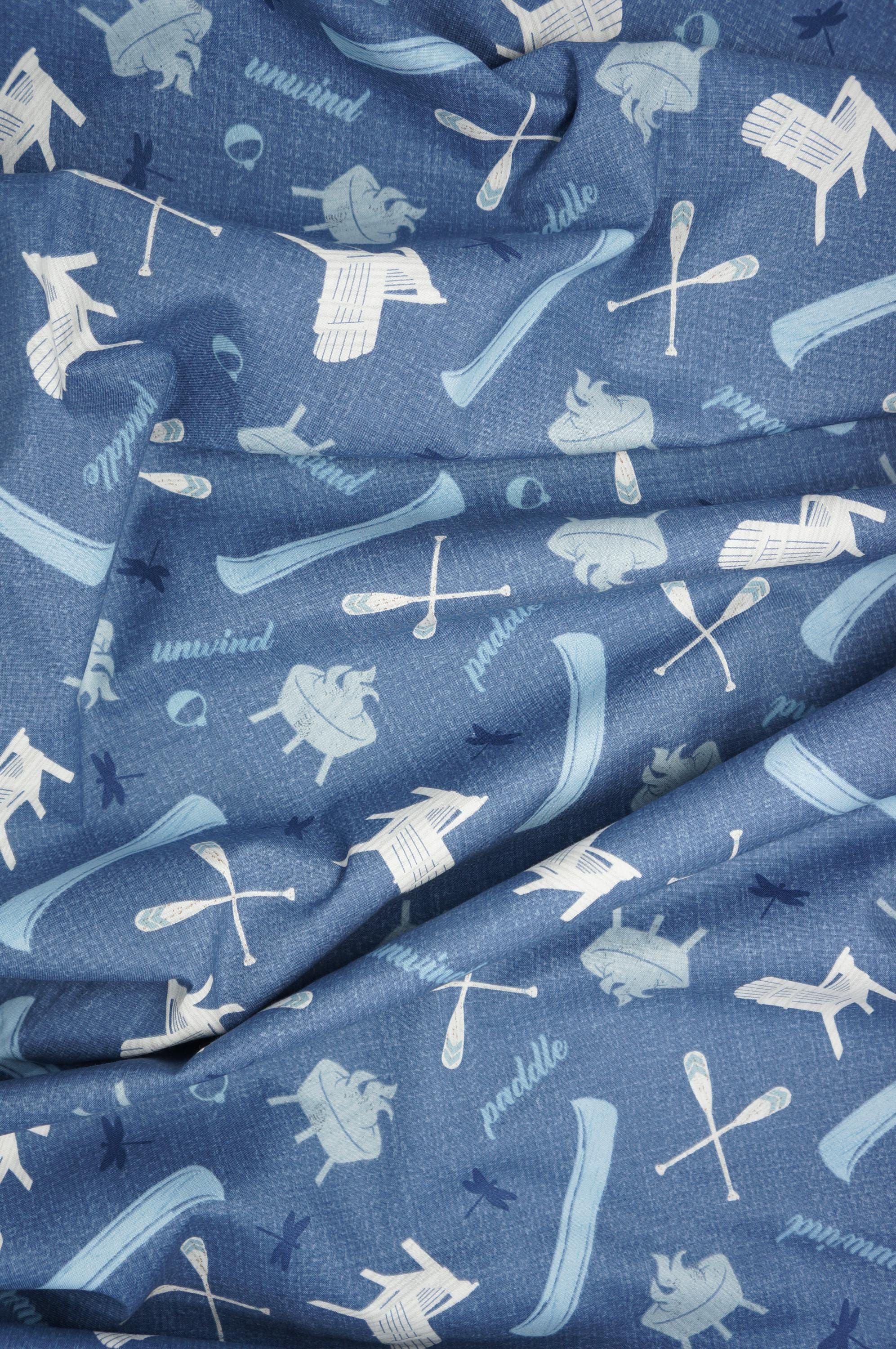 Transform your lake haven into a cozy retreat with our enchanting Denim-Blue Lakeside Toss quilting cotton fabric from the Lake Retreat Collection by PDR LLC for Wilmington Prints. This delightful design features Adirondak Chairs, canoe paddles, canoes, bobbers, dragonflies, campfires and the words "paddle" and "unwind" tossed on a denim-blue background in a color palette of blues, gray, and white. Whether you're stitching up cushions, quilts, or tote bags, this fabric embodies the essence of Lake Life bliss. Dive into creativity and infuse your space with the tranquil vibes of Lake Retreat, making every day feel like a lake getaway.