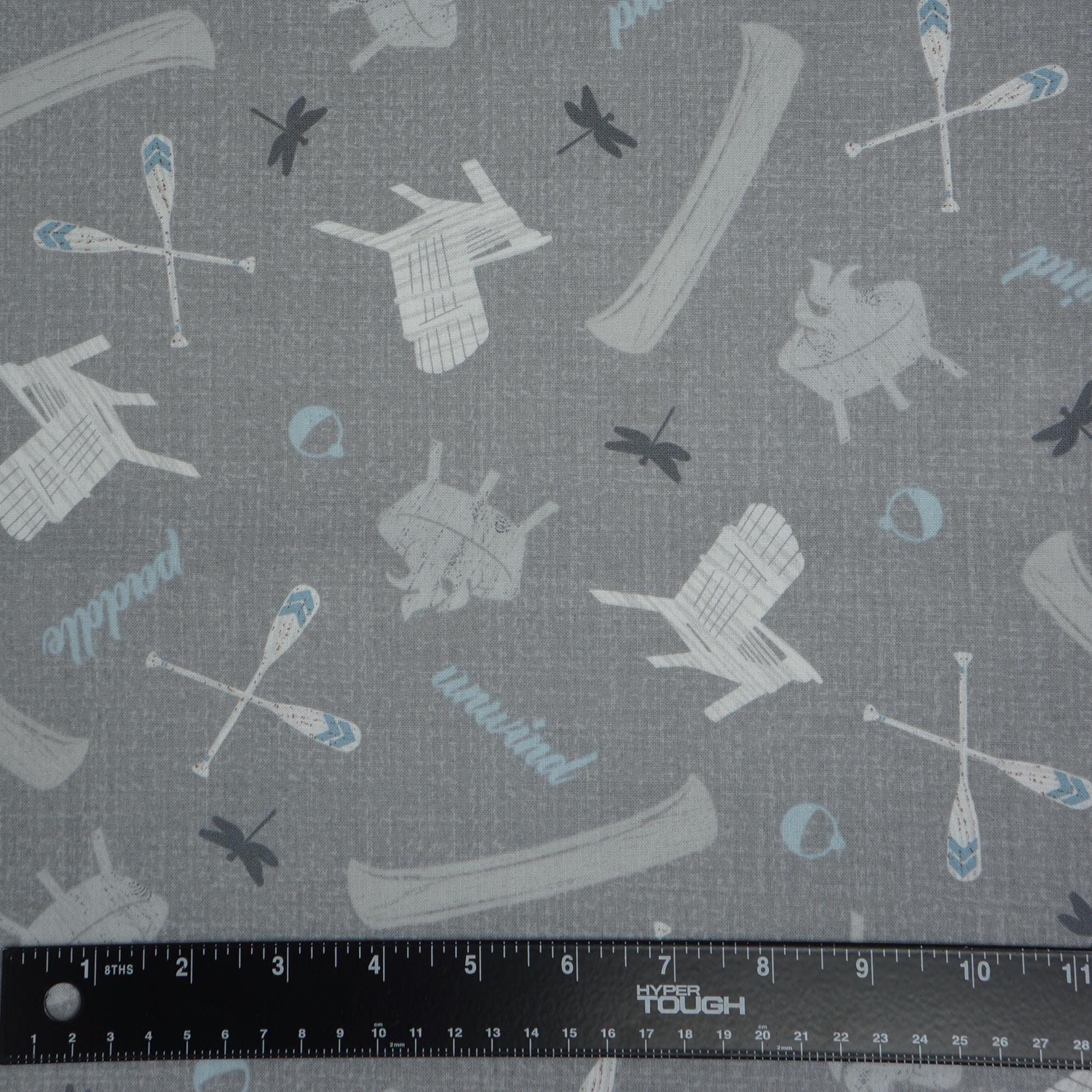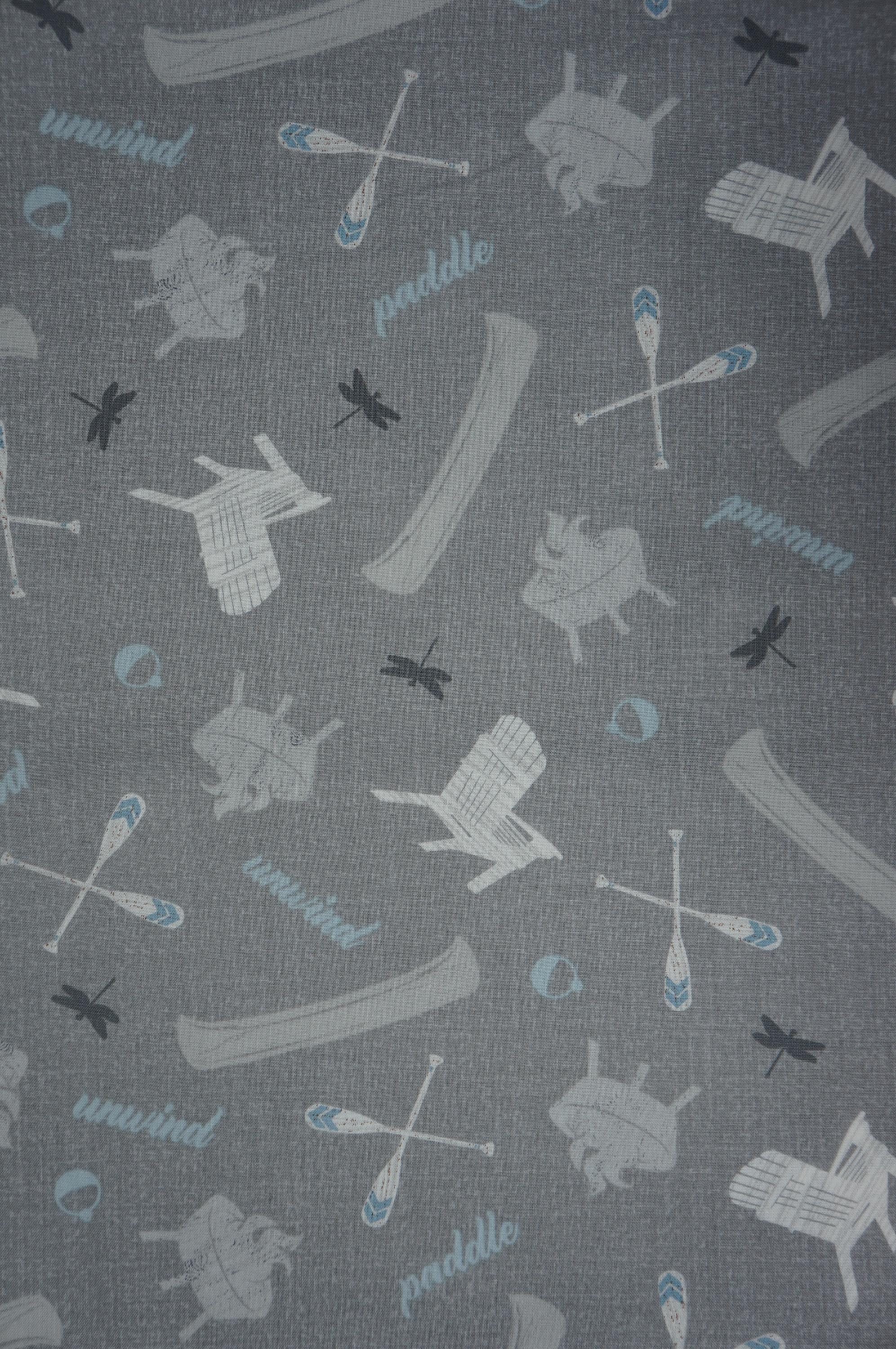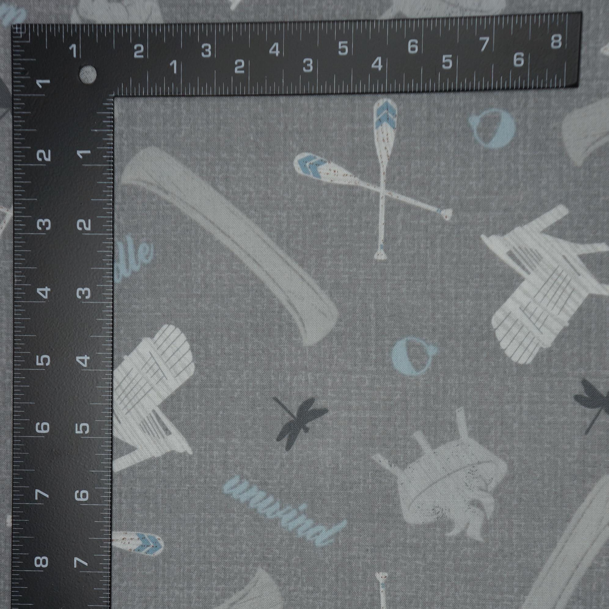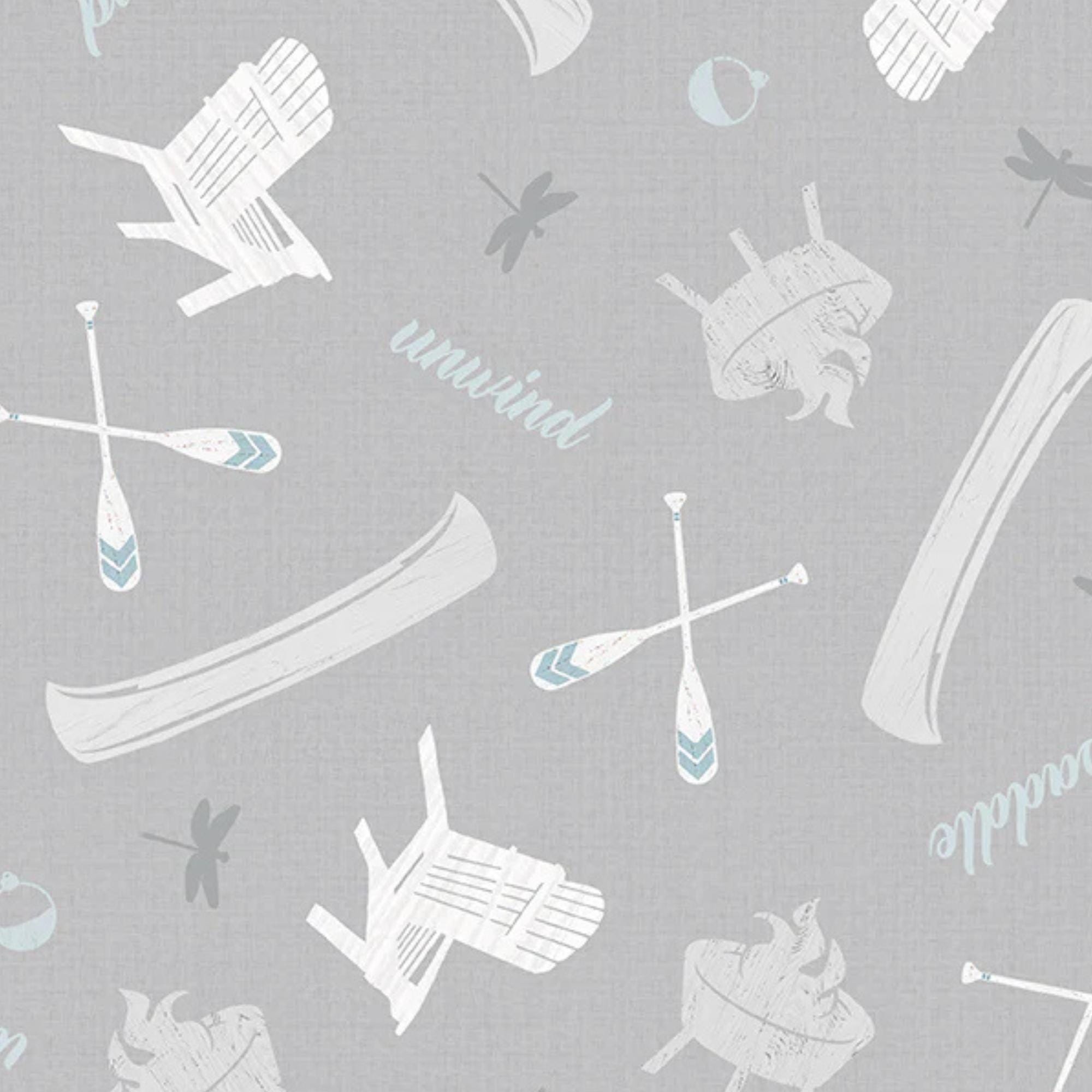 Transform your lake haven into a cozy retreat with our enchanting Gray Lakeside Toss quilting cotton fabric from the Lake Retreat Collection by PDR LLC for Wilmington Prints. This delightful design features Adirondak Chairs, canoe paddles, canoes, bobbers, dragonflies, campfires and the words "paddle" and "unwind" tossed on a gray background in a color palette of grays, blue, and white. Whether you're stitching up cushions, quilts, or tote bags, this fabric embodies the essence of Lake Life bliss. Dive into creativity and infuse your space with the tranquil vibes of Lake Retreat, making every day feel like a lake getaway.