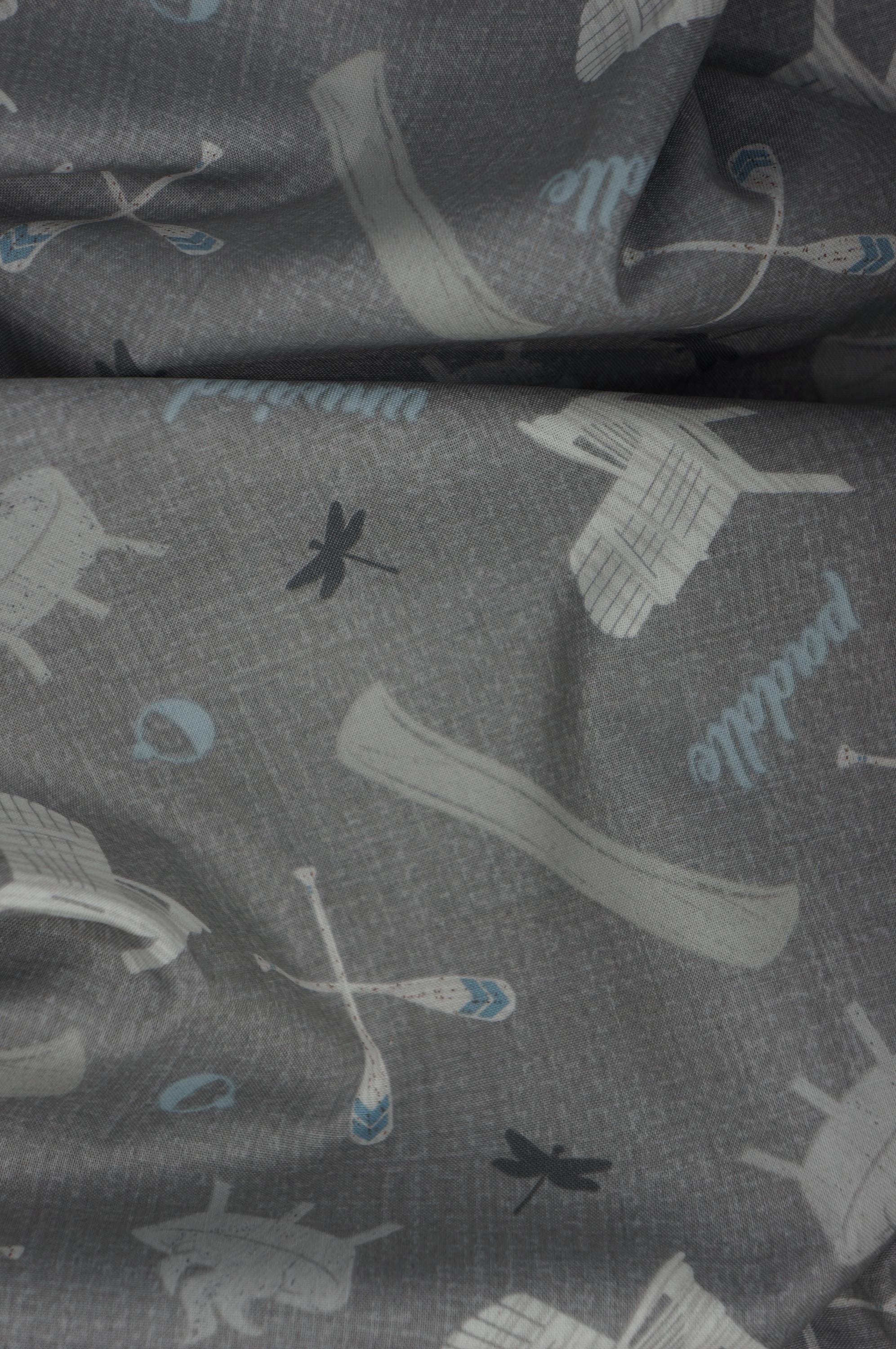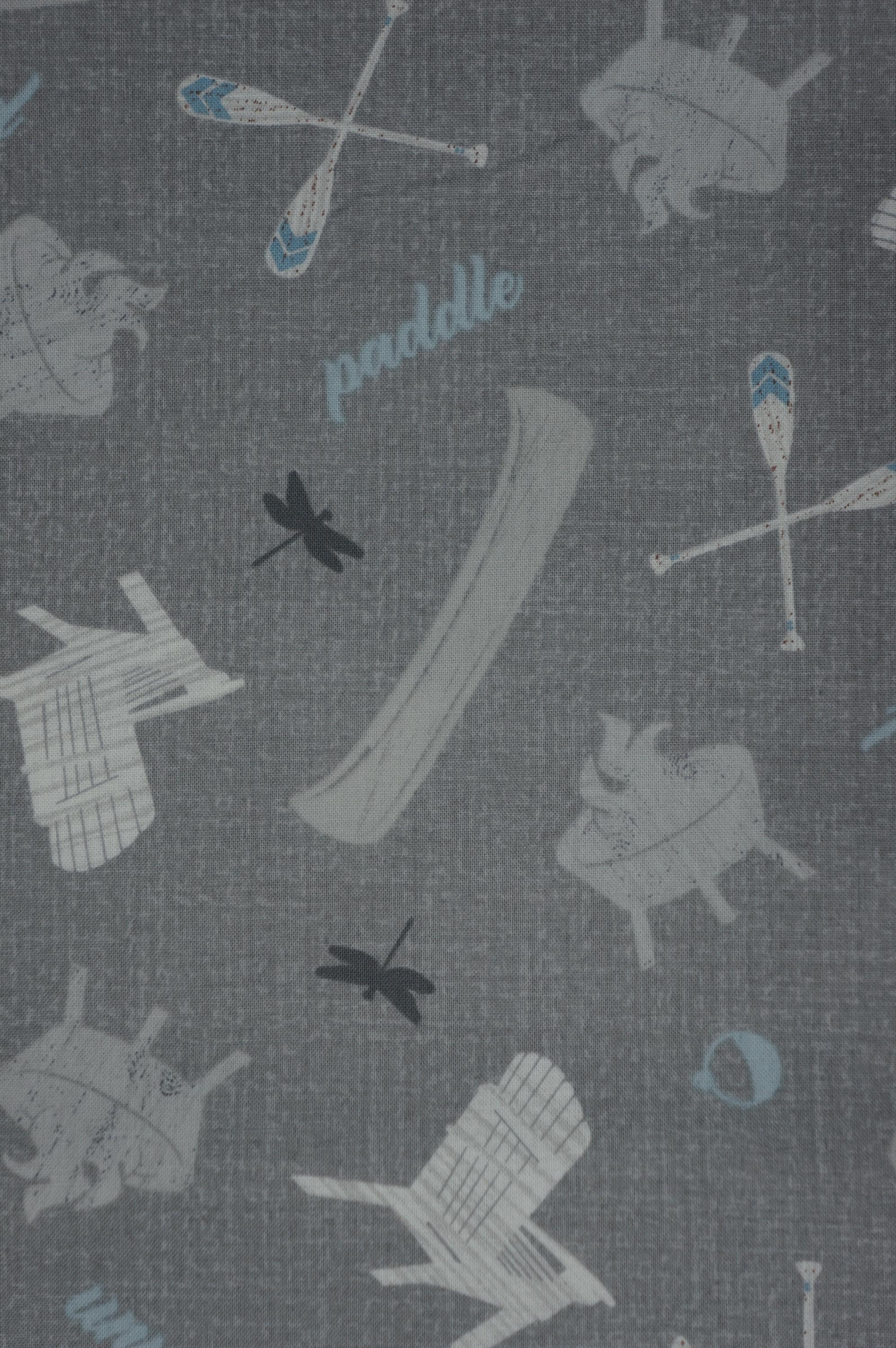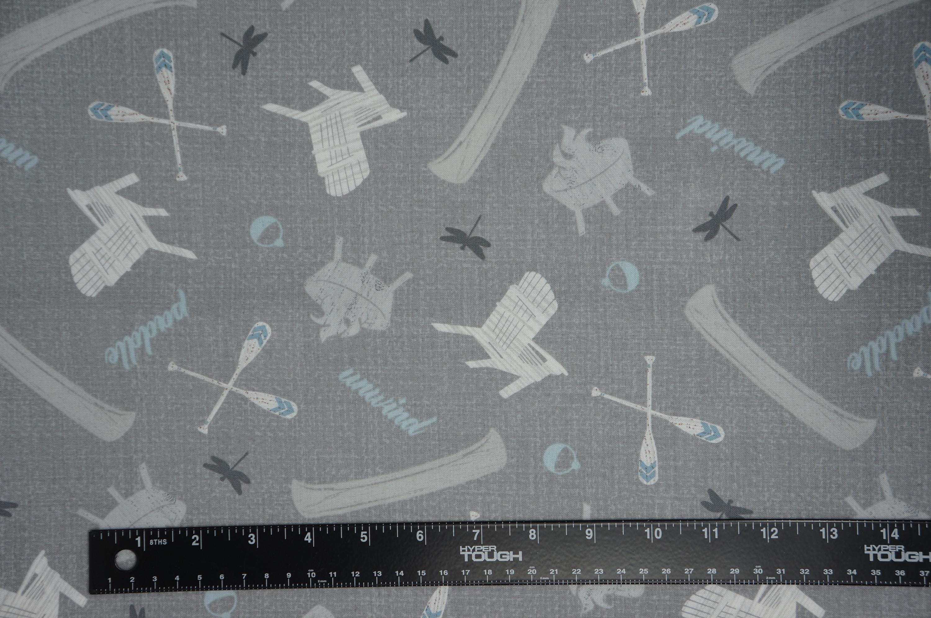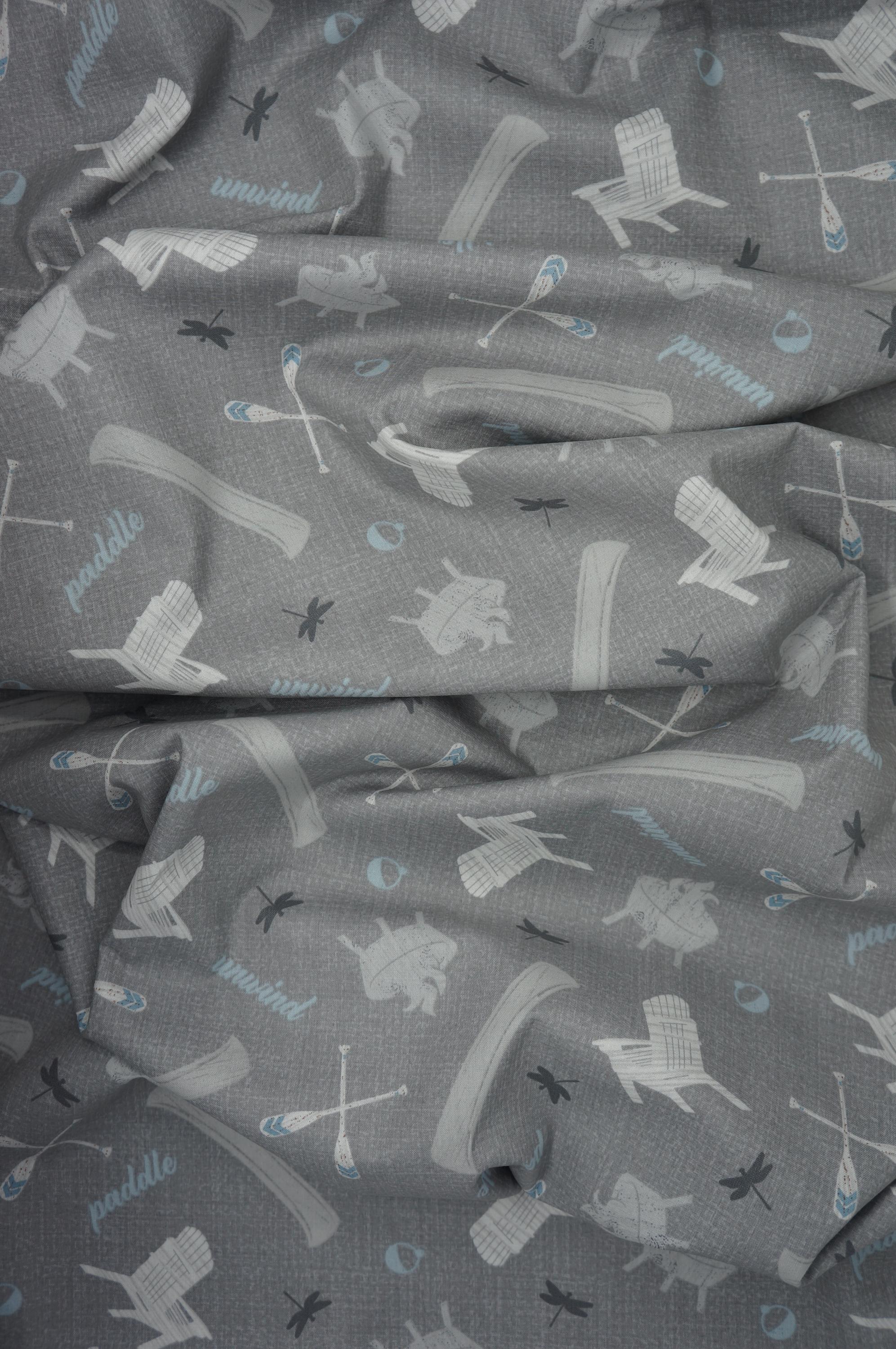 Transform your lake haven into a cozy retreat with our enchanting Gray Lakeside Toss quilting cotton fabric from the Lake Retreat Collection by PDR LLC for Wilmington Prints. This delightful design features Adirondak Chairs, canoe paddles, canoes, bobbers, dragonflies, campfires and the words "paddle" and "unwind" tossed on a gray background in a color palette of grays, blue, and white. Whether you're stitching up cushions, quilts, or tote bags, this fabric embodies the essence of Lake Life bliss. Dive into creativity and infuse your space with the tranquil vibes of Lake Retreat, making every day feel like a lake getaway.