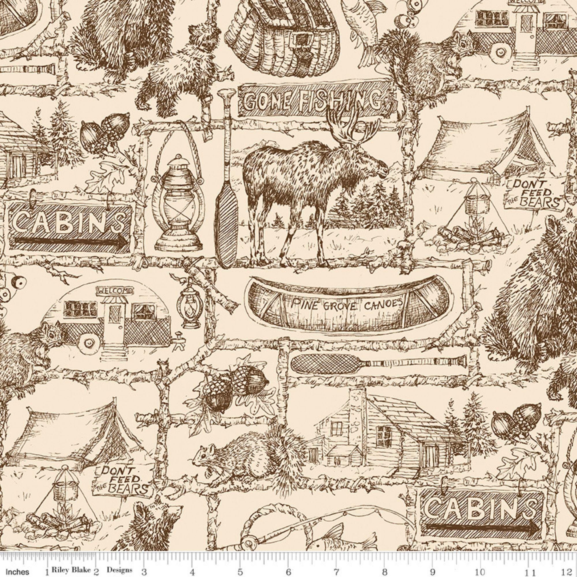 If you love camping and woodland animals, you'll adore this wide back print from the Pine Grove Collection by Riley Blake Designs! This 108" wide quilting cotton Fabric features brown outlines of outdoor-themed text and icons, such as moose, tents, bears, canoes, lanterns, cabins, racoons, and more on a putty cream background. This high-quality fabric is made of 100% cotton and is perfect for backing a quilt, crafts, home decor, nurseries and more. You'll have so much fun creating projects with this whimsical and charming fabric. Order yours today and get ready for some woodland camping adventures!