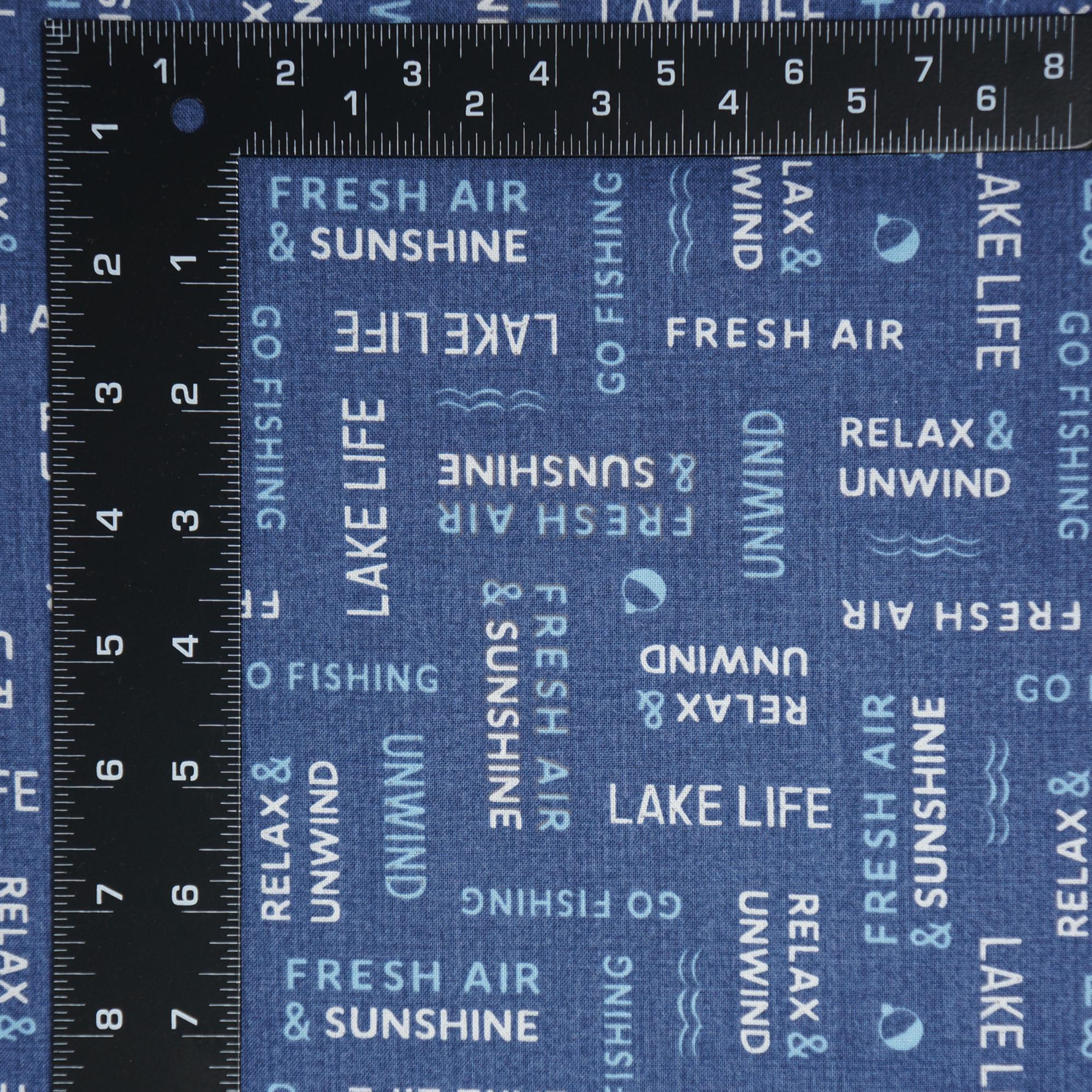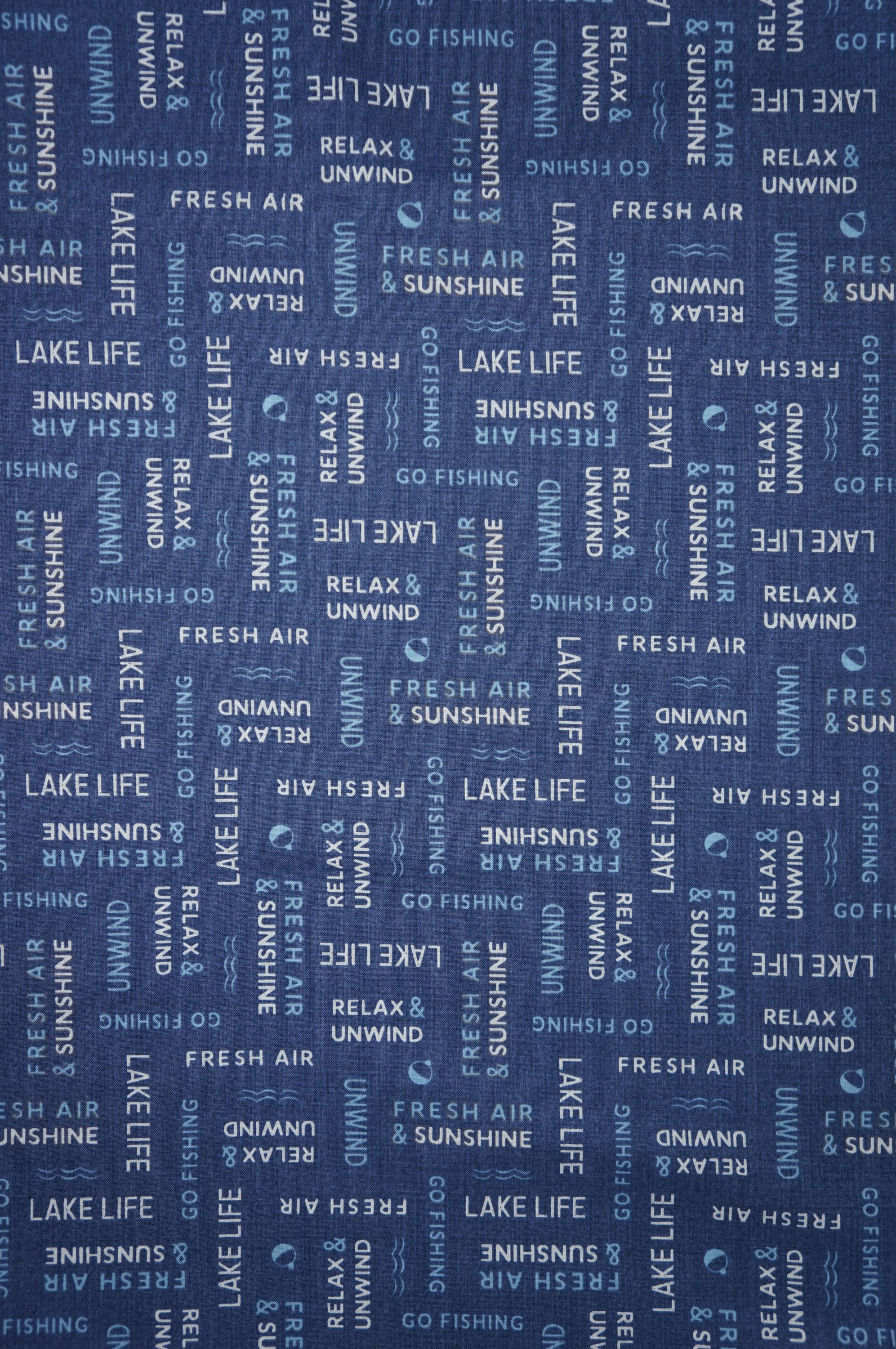 Transform your lake haven into a cozy retreat with our enchanting Denim Blue Lake Words quilting cotton fabric from the Lake Retreat Collection by PDR LLC for Wilmington Prints. This delightful design features words such as "Lake Life", "Fresh Air and Sunshine", "Relax and Unwind", and "Go Fishing" tossed vertically and horizontally with waves and bobbers on a textured gray background in a color palette of grays and white. Whether you're stitching up cushions, quilts, or tote bags, this fabric embodies the essence of Lake Life bliss. Dive into creativity and infuse your space with the tranquil vibes of Lake Retreat, making every day feel like a lake getaway.