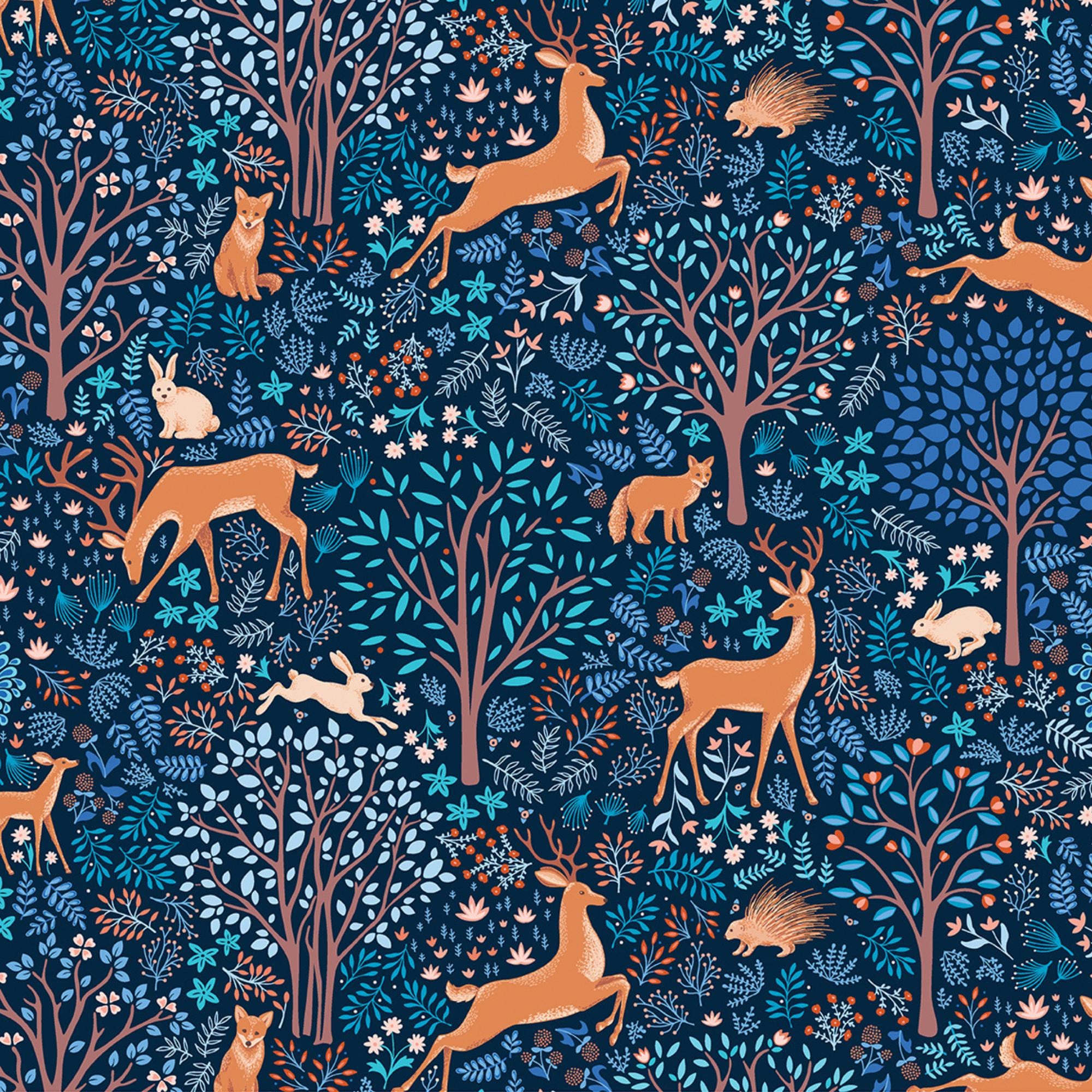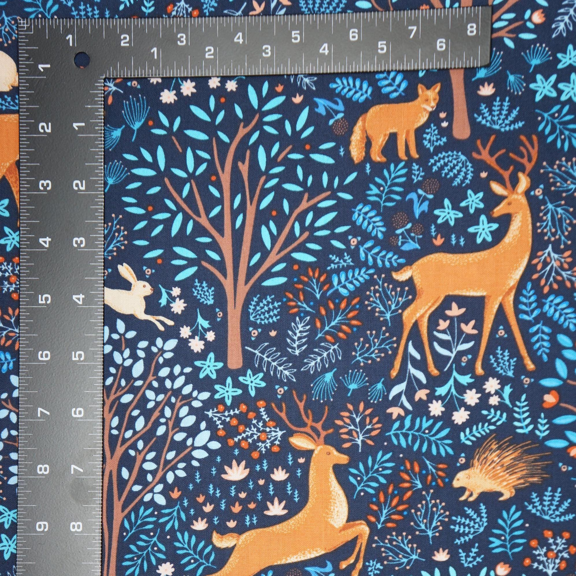 This enchanting quilting cotton fabric designed by Amanda Murphy for Benartex Contempo for the Flora and Fauna Midnight collection transports you into a mystical forest at night, where the magic of nature comes alive. The scene is filled with a variety of woodland creatures including foxes, deer, rabbits and porcupines, all set against a backdrop of lush trees, blooming flowers. The rich, deep sapphire blue background contrasts beautifully with the vibrant colors of the flora and fauna, creating a captivating and serene atmosphere perfect for any project that seeks to bring a touch of enchantment. The fabric is made of 100% high quality quilting cotton and is perfect for quilting, apparel, home decor, and more. You can create beautiful projects with this fabric that will bring joy and warmth to your home or as a gift.