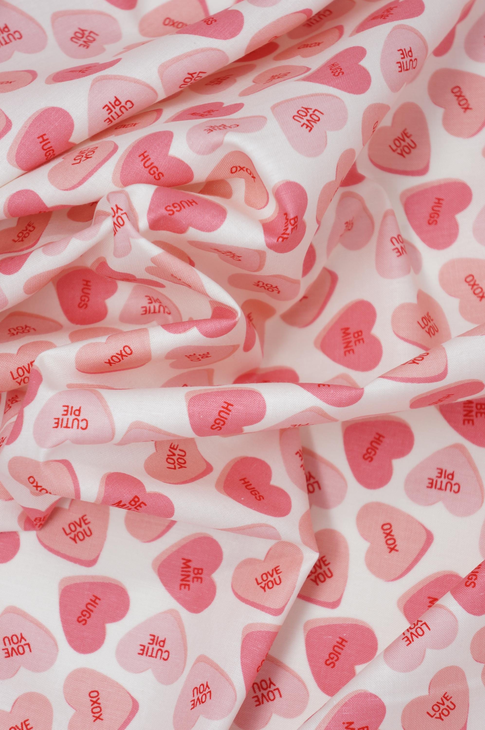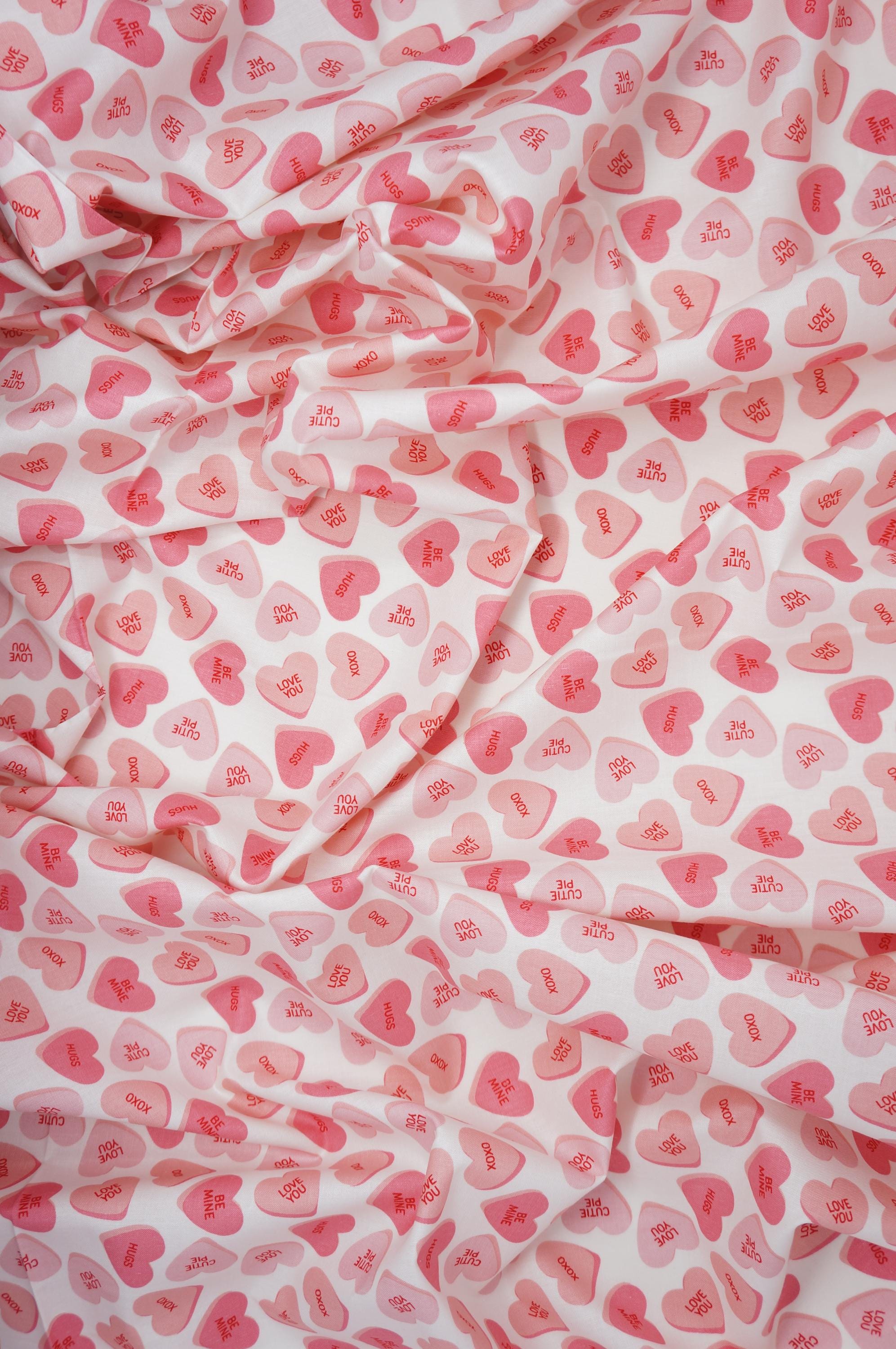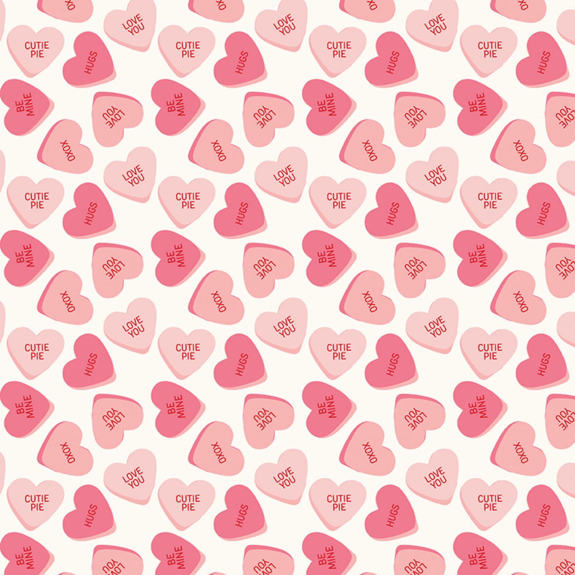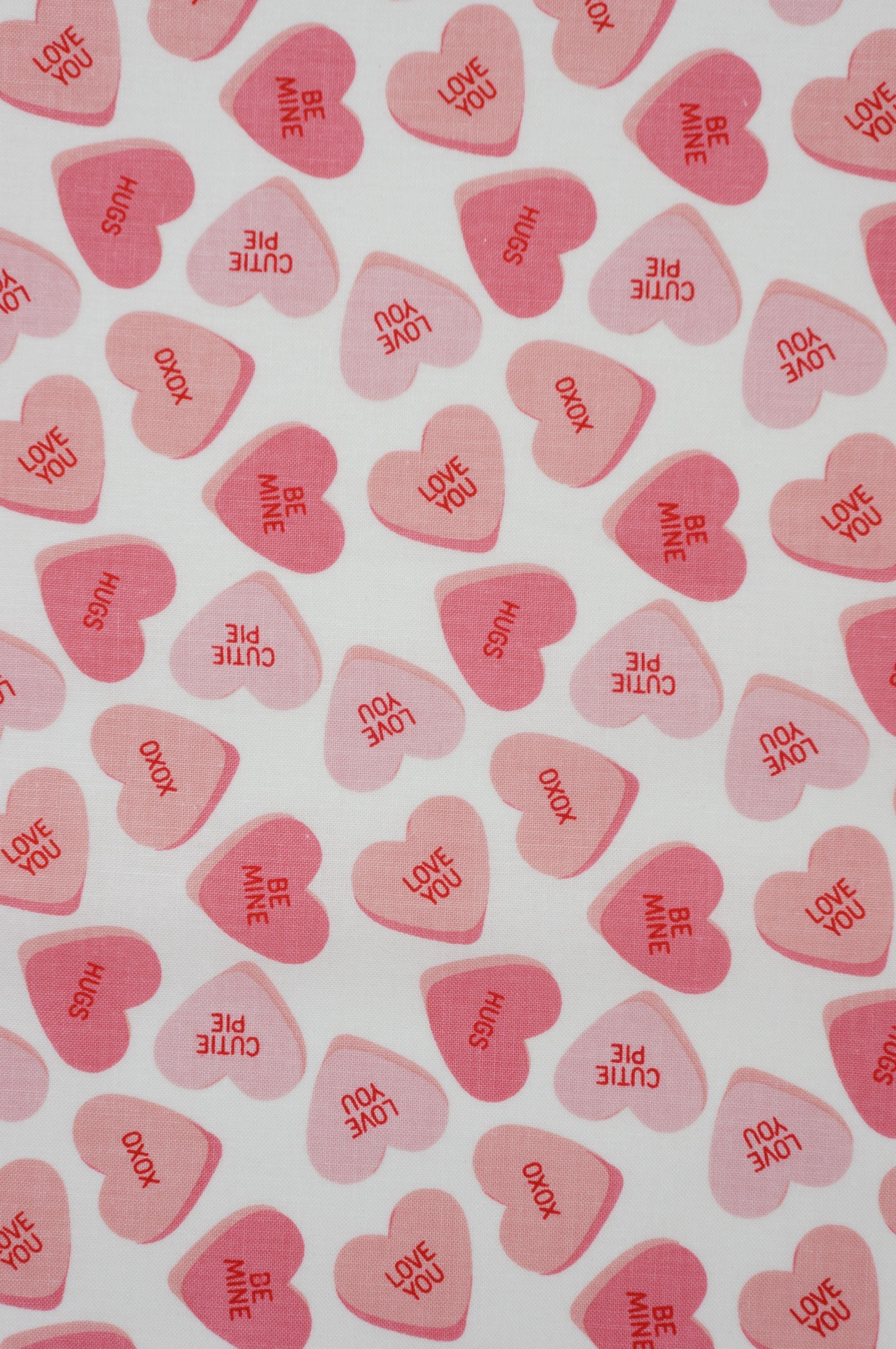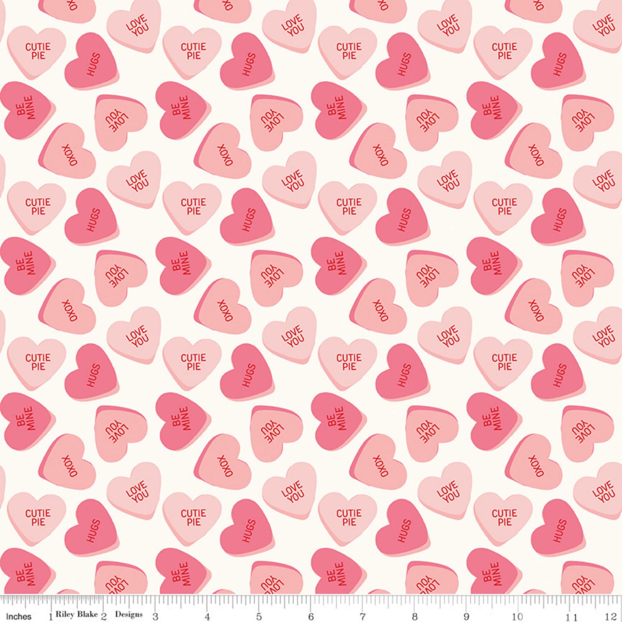 If you love candy hearts and Valentine's Day, you will adore this fabric! This Candy Heart quilting cotton fabric is designed by My Mind's Eye for the Sweetheart Collection by Riley Blake Designs. This fabric features a sweet and colorful print that features 3 different tones of pink conversation hearts with cute messages like "XOXO", "Cutie Pie", "Hugs", "Be Mine" and "Love You" on a cream background. This Riley Blake fabric is high quality, easy to sew with and is perfect for making quilts, pillows, bags, and more for your loved ones. Show them how much you care with this candy hearts fabric!