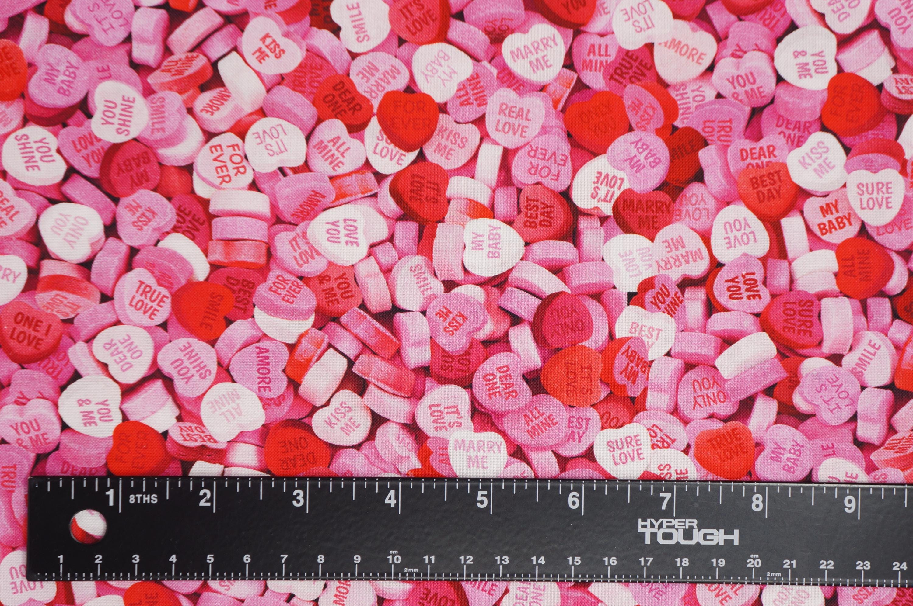 If you love candy hearts and Valentine's Day, you will adore this fabric! This Candy Heart quilting cotton fabric is designed and manufactured by Timeless Treasures. This fabric features a realistic and colorful print that features different tones of pink and red conversation hearts with cute messages like "For Ever", "Its Love", "Only You", "Be Mine", "Marry Me" and so many more packed onto the fabric. This Timeless Treasures fabric is high quality, easy to sew with and is perfect for making quilts, pillows, bags, and more for your loved ones. Show them how much you care with this candy hearts fabric!