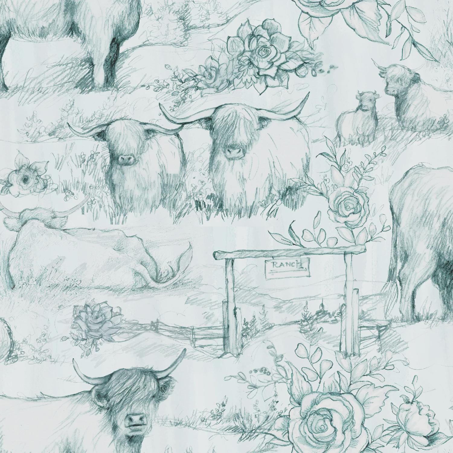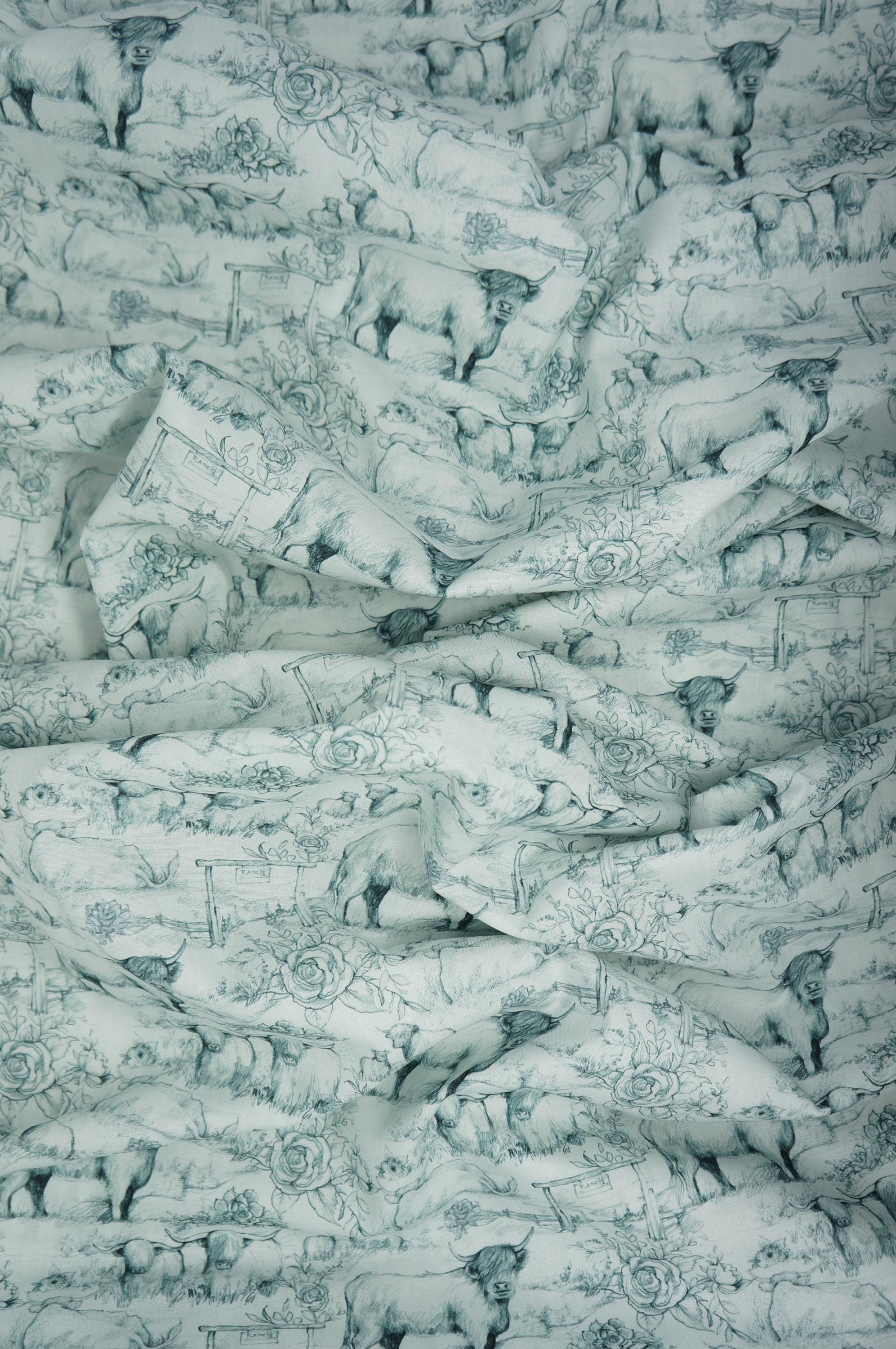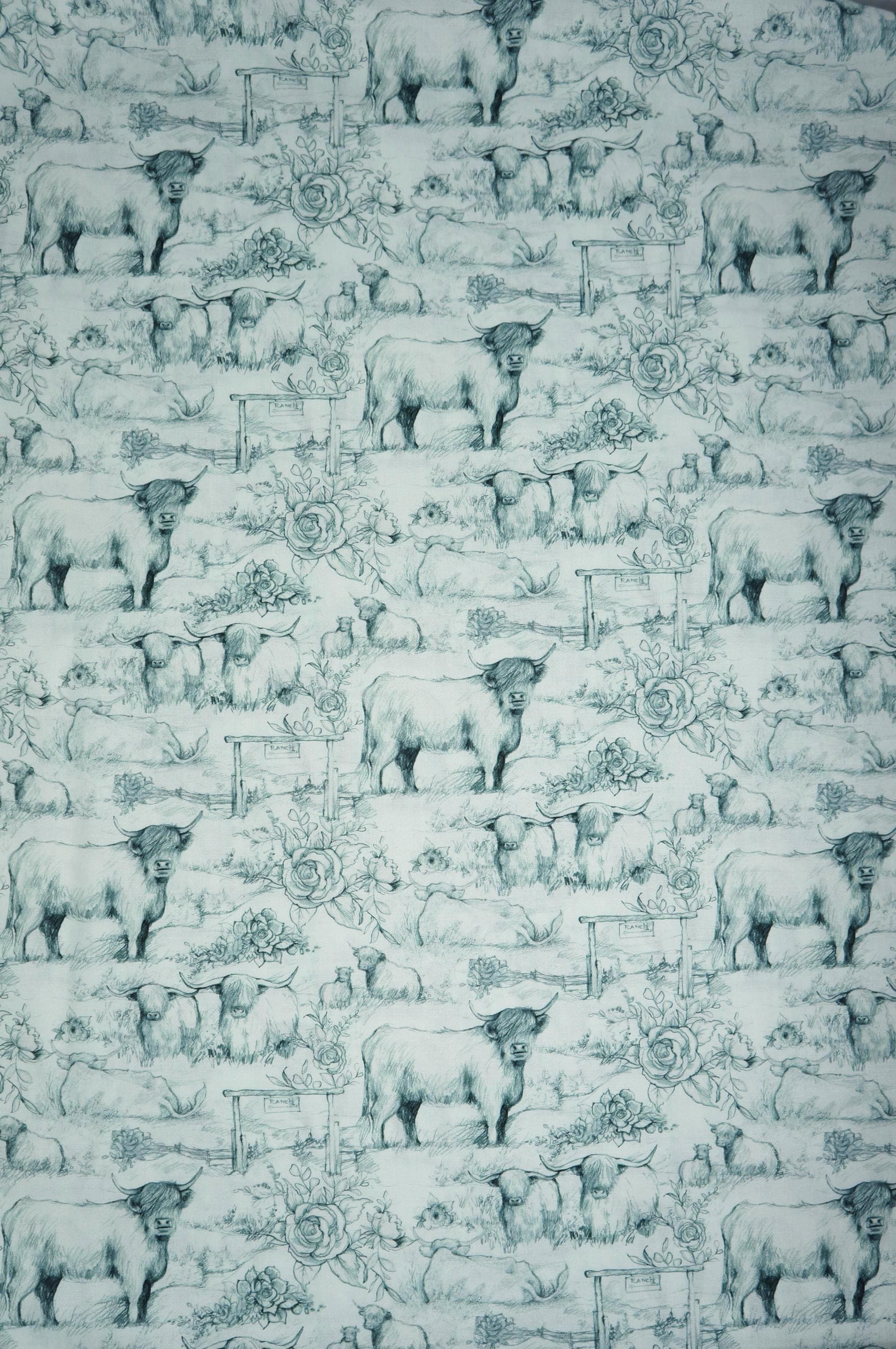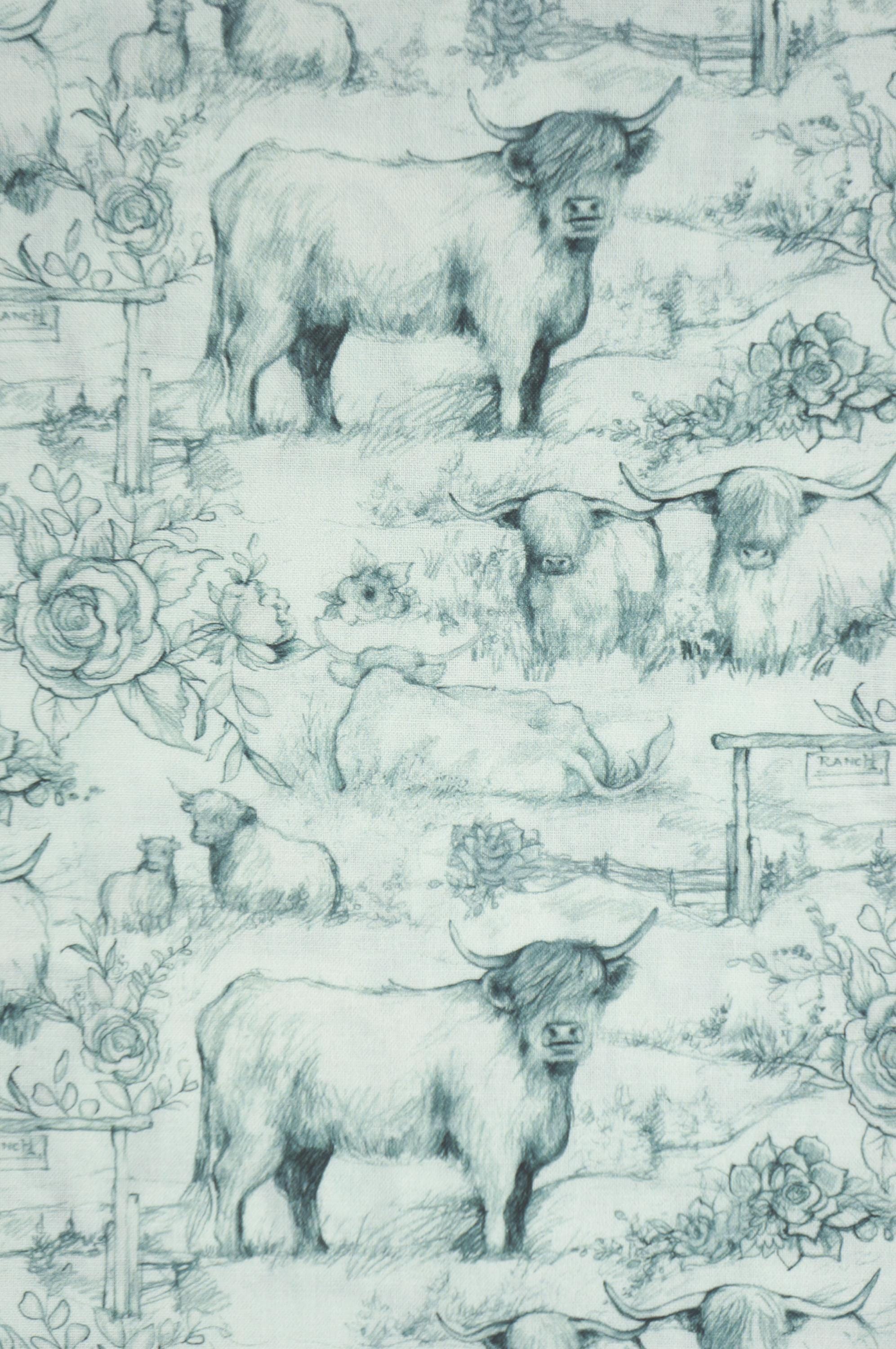Wrap yourself in the cozy embrace of the Scottish Highlands with this highland ranch toile novelty cotton fabric designed by Susan Winget for Springs Creative! This fabric features intricate sketches of shaggy highland cows grazing amid blooming roses and wildflowers, complete with a quaint ranch sign and wooden fences that evoke a serene countryside escape. The monochromatic blue-gray illustrations on a soft white background create a timeless toile pattern that's perfect for adding a touch of whimsical farmstead elegance to your projects. Ideal for crafting cozy quilts, decorative pillows, or unique apparel, this versatile cotton material brings a vintage pastoral vibe to any creation, blending the majesty of Scottish highland cattle with delicate floral motifs for an enchanting, storybook appeal. Embrace the spirit of the Highlands and let your imagination run wild with this Highland Cow novelty cotton fabric!