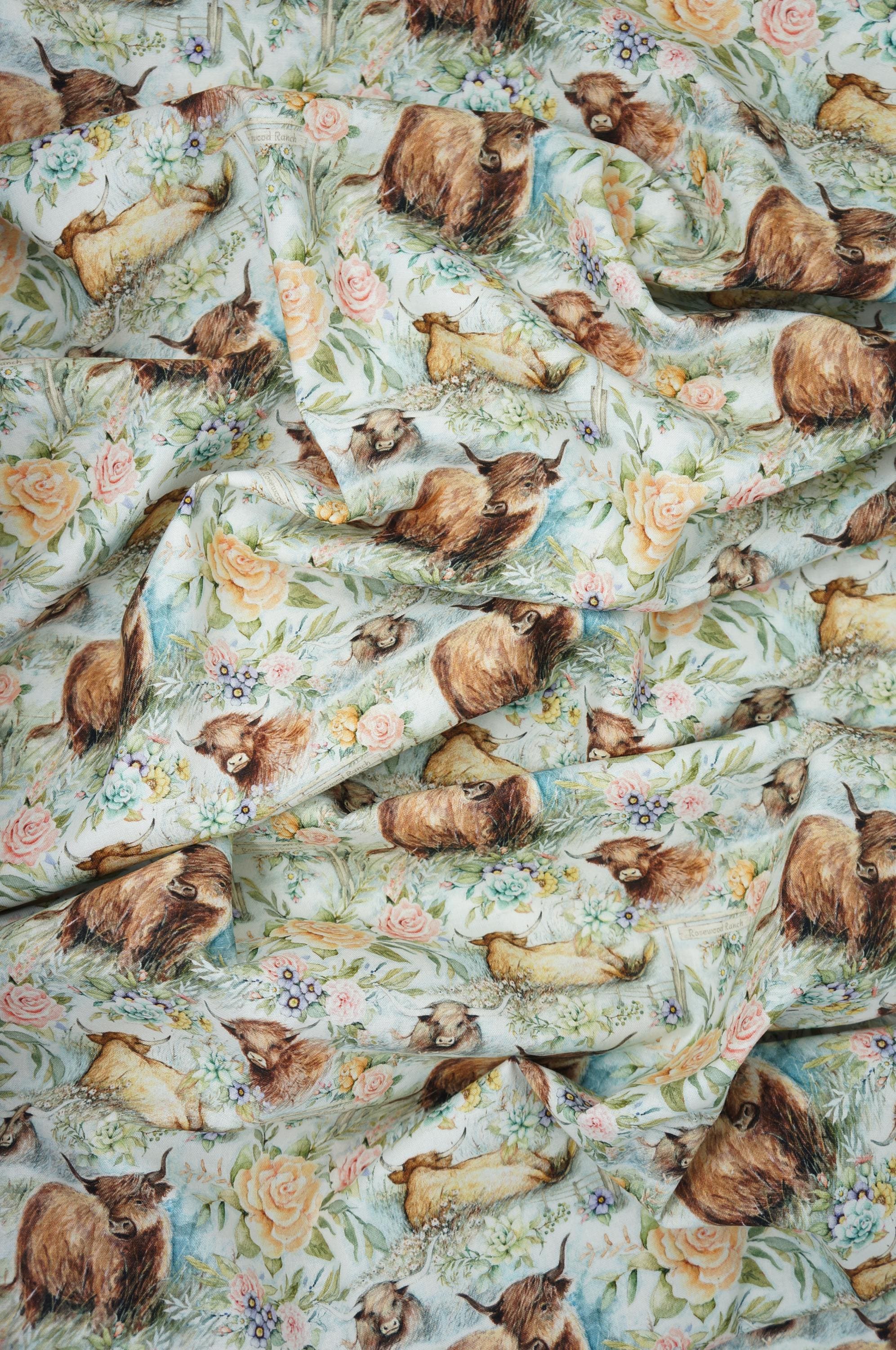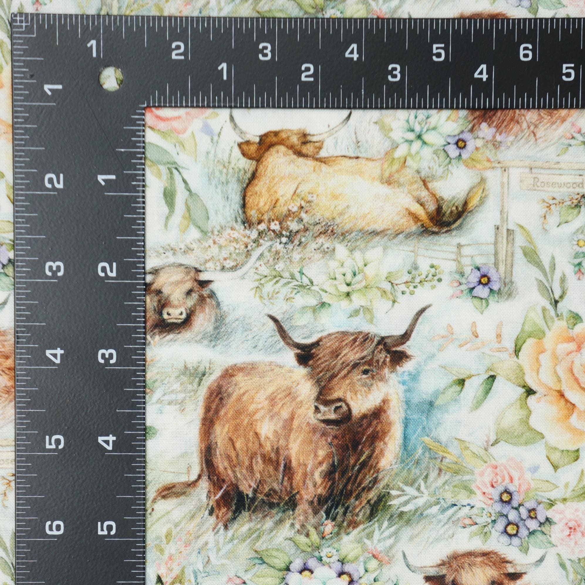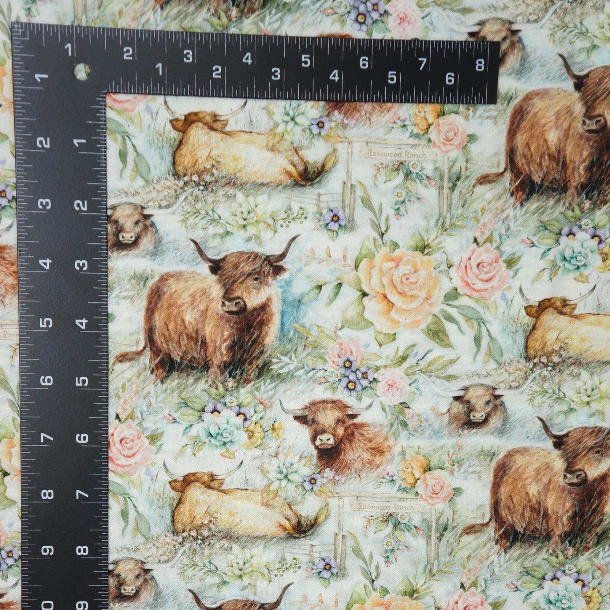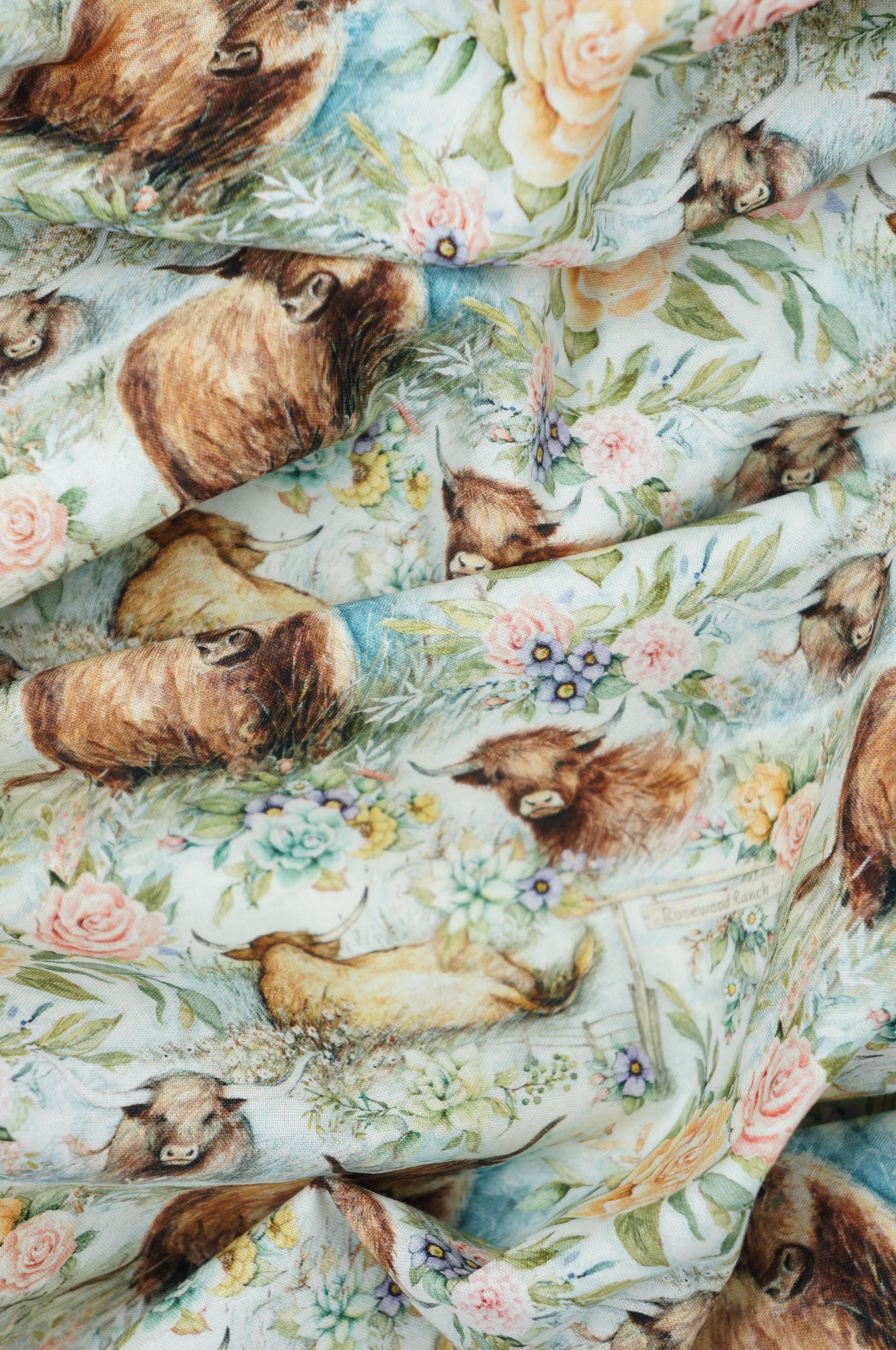 Wrap yourself in the cozy embrace of the Scottish Highlands with this highland cow ranch novelty cotton fabric designed by Susan Winget for Springs Creative! This fabric features shaggy-haired cattle roaming amidst blooming roses in soft pink and peach tones, accented by delicate succulents and wildflowers on a serene pastel blue background. The watercolor-style illustration captures a whimsical ranch vibe, complete with a quaint "Rosewood Ranch" sign, blending adorable animal motifs with floral elegance for a truly enchanting design. Perfect for crafting cozy quilts, throw pillows, or apparel that evokes countryside charm, this soft cotton material offers a smooth texture and vibrant colors that inspire creativity in home decor or DIY projects. Embrace the spirit of the Highlands and let your imagination run wild with this Highland Cow novelty cotton fabric!