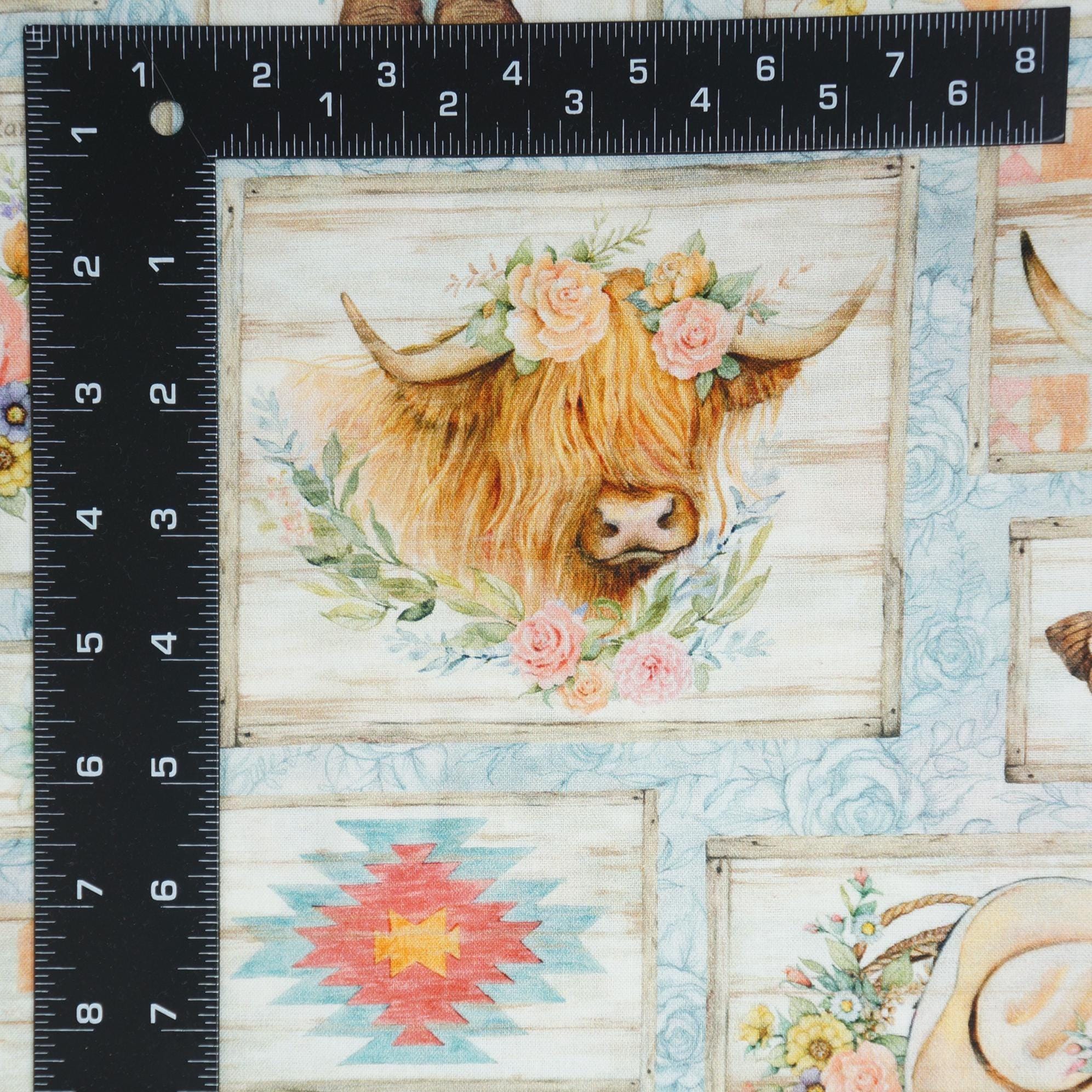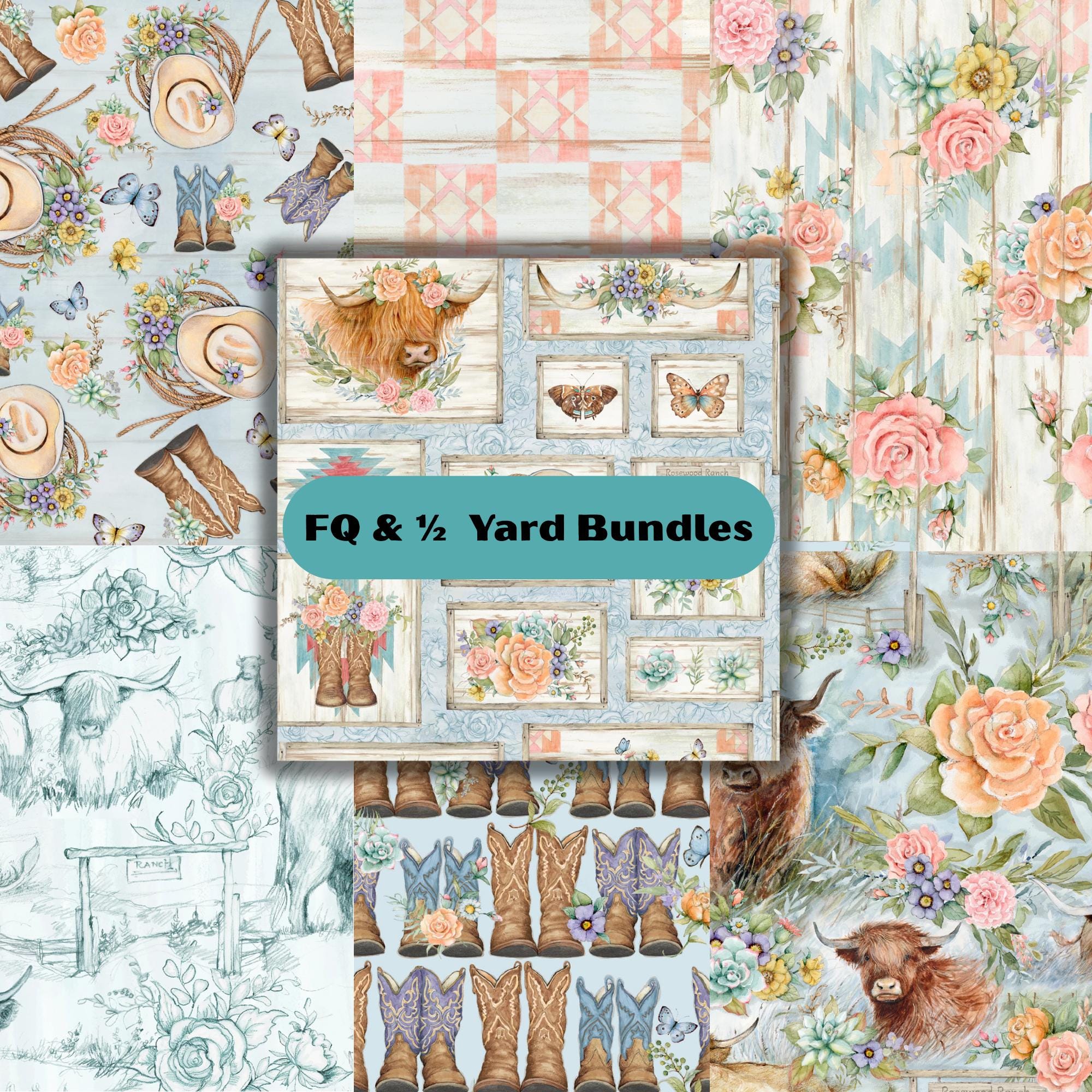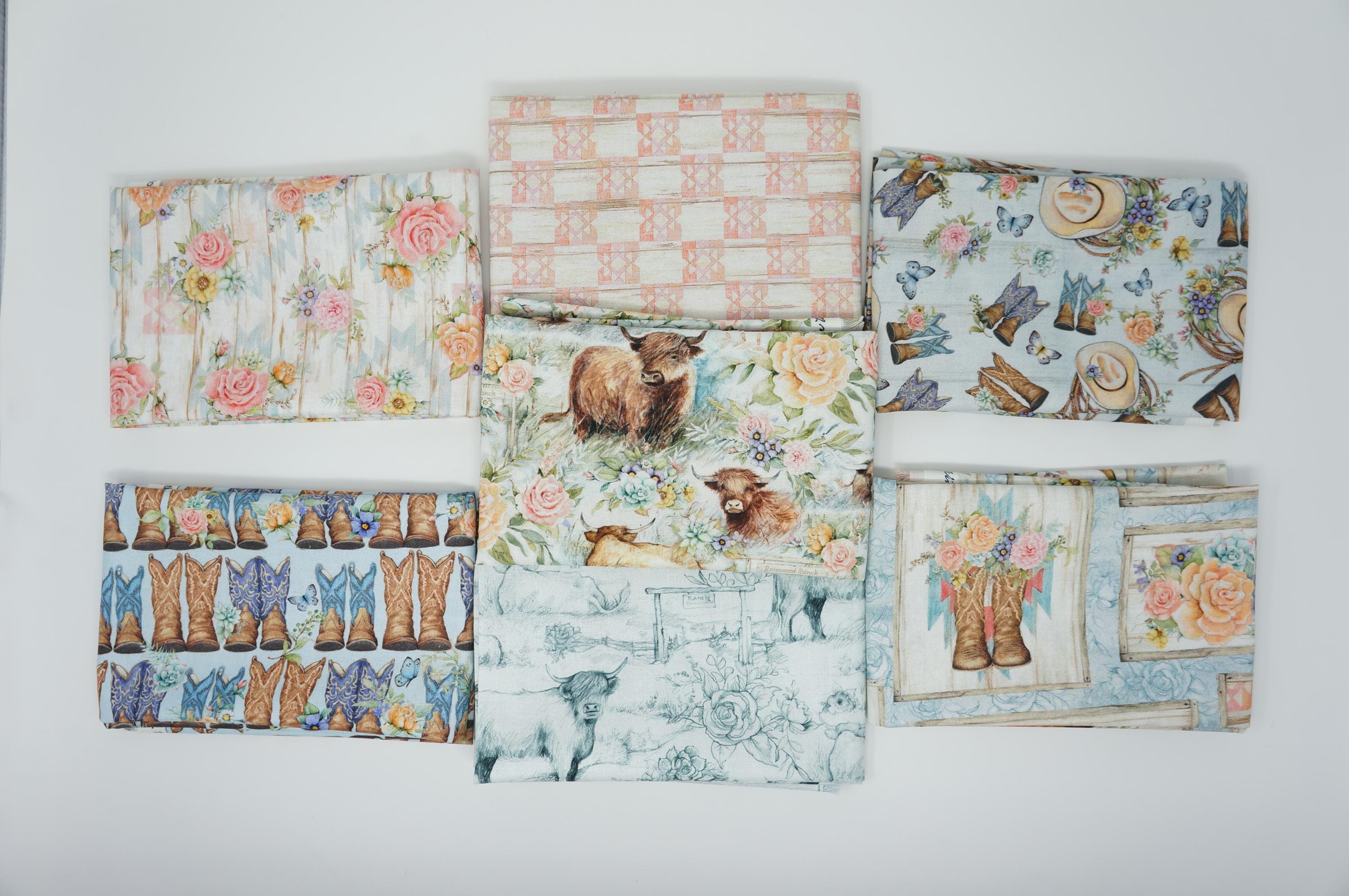 Wrap yourself in the cozy embrace of the Scottish Highlands with this highland ranch collection novelty cotton fabric designed by Susan Winget for Springs Creative! This 7 piece fabric bundle features shaggy-haired cattle roaming amidst blooming roses in soft pink and peach tones, accented by delicate succulents and wildflowers on a serene pastel blue background. The watercolor-style illustration captures a whimsical southwest ranch vibe, blending adorable animal motifs with floral elegance for a truly enchanting design. Perfect for crafting cozy quilts, throw pillows, or apparel that evokes countryside charm, this soft cotton material offers a smooth texture and vibrant colors that inspire creativity in home decor or DIY projects. Embrace the spirit of the Highlands and let your imagination run wild with this Highland Cow novelty cotton fabric!