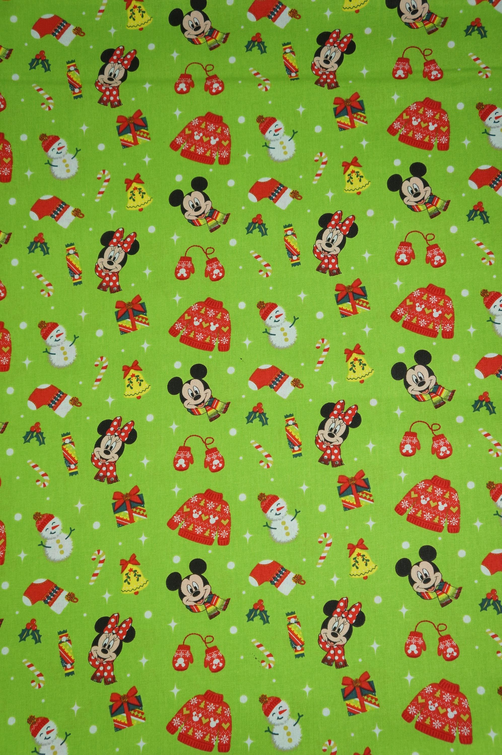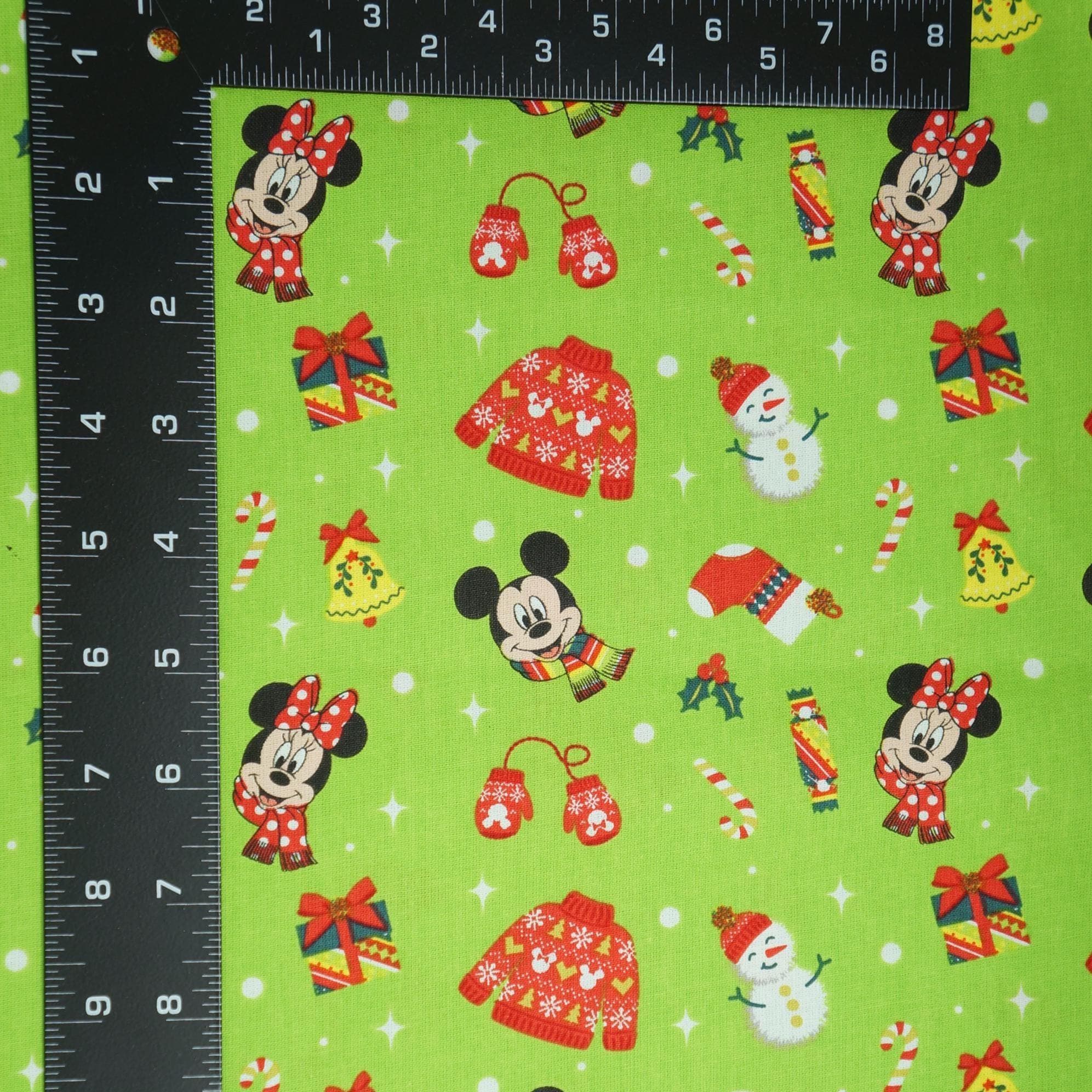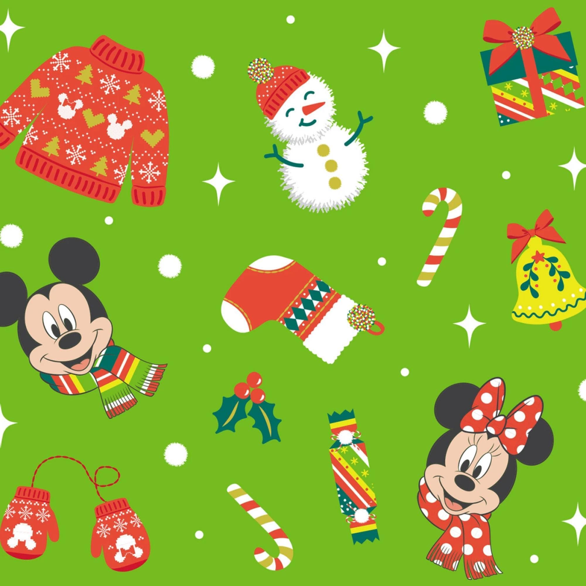 Celebrate the holiday season with this enchanting 100% cotton fabric featuring a whimsical Disney Christmas print that's perfect for crafting joyful decorations, sewing festive apparel, or upholstering cozy home accents. The vibrant green background bursts with beloved characters like Mickey and Minnie Mouse dressed in colorful scarves, mittens, and sweaters, surrounded by classic holiday motifs including cheerful snowmen, wrapped gifts adorned with bows, striped candy canes, jingle bells, holly branches, and cozy stockings. Delicate white stars add a magical sparkle, while the soft woven texture ensures comfort and durability for your creative projects. This licensed fabric brings Disney magic to your winter wonderland designs, ideal for pillows, table runners, or personalized gifts that capture the spirit of the season in every stitch.