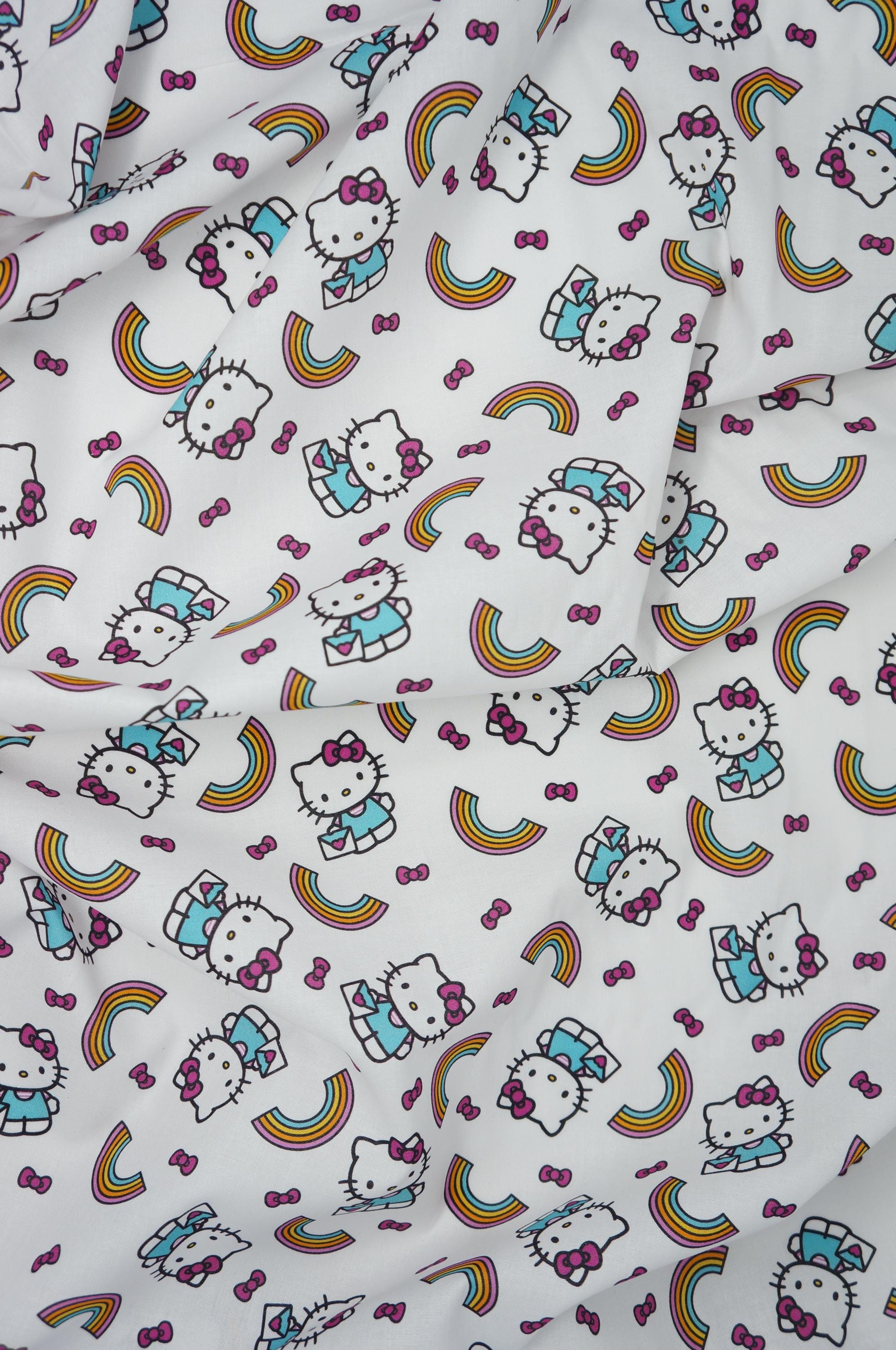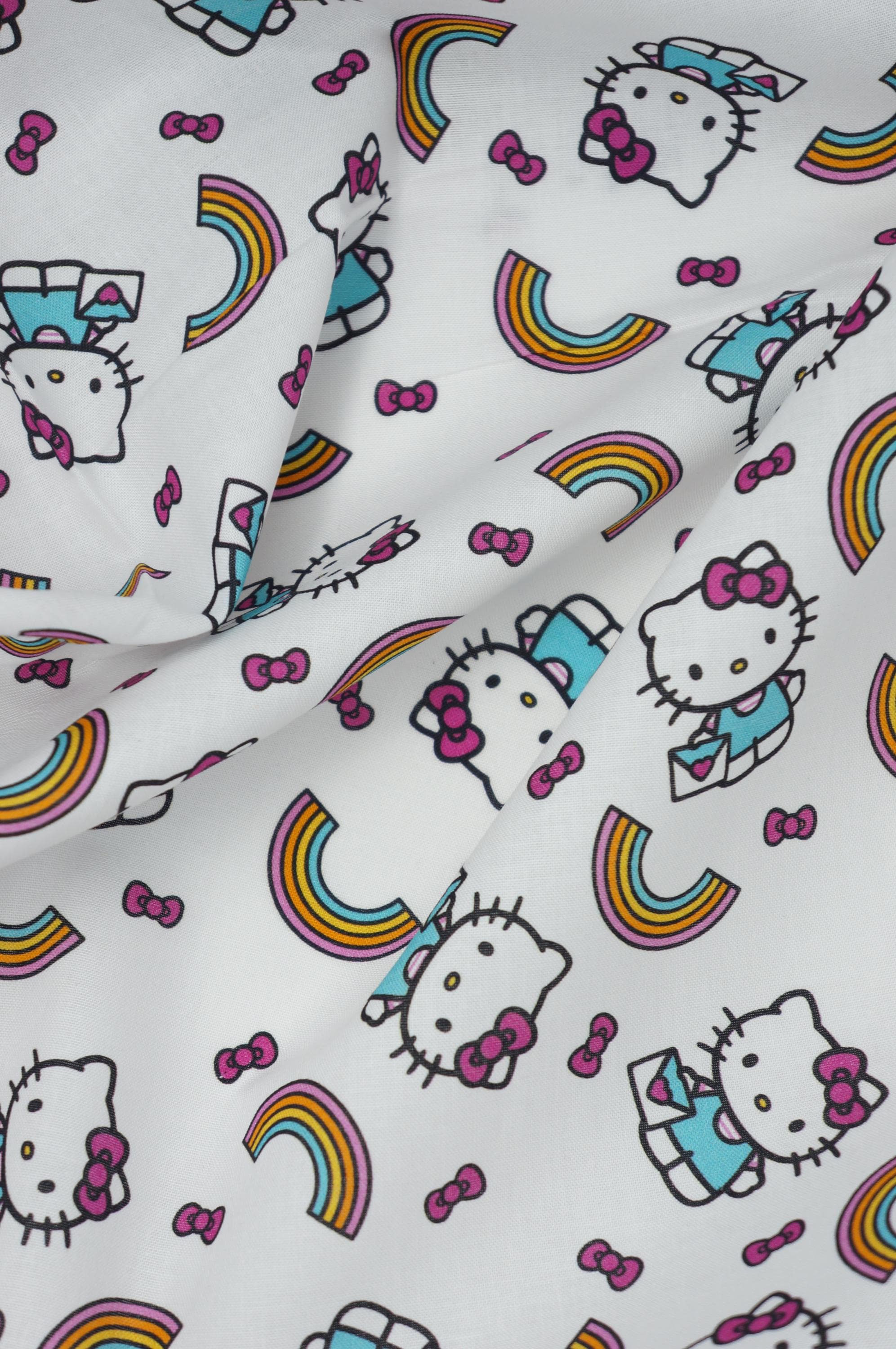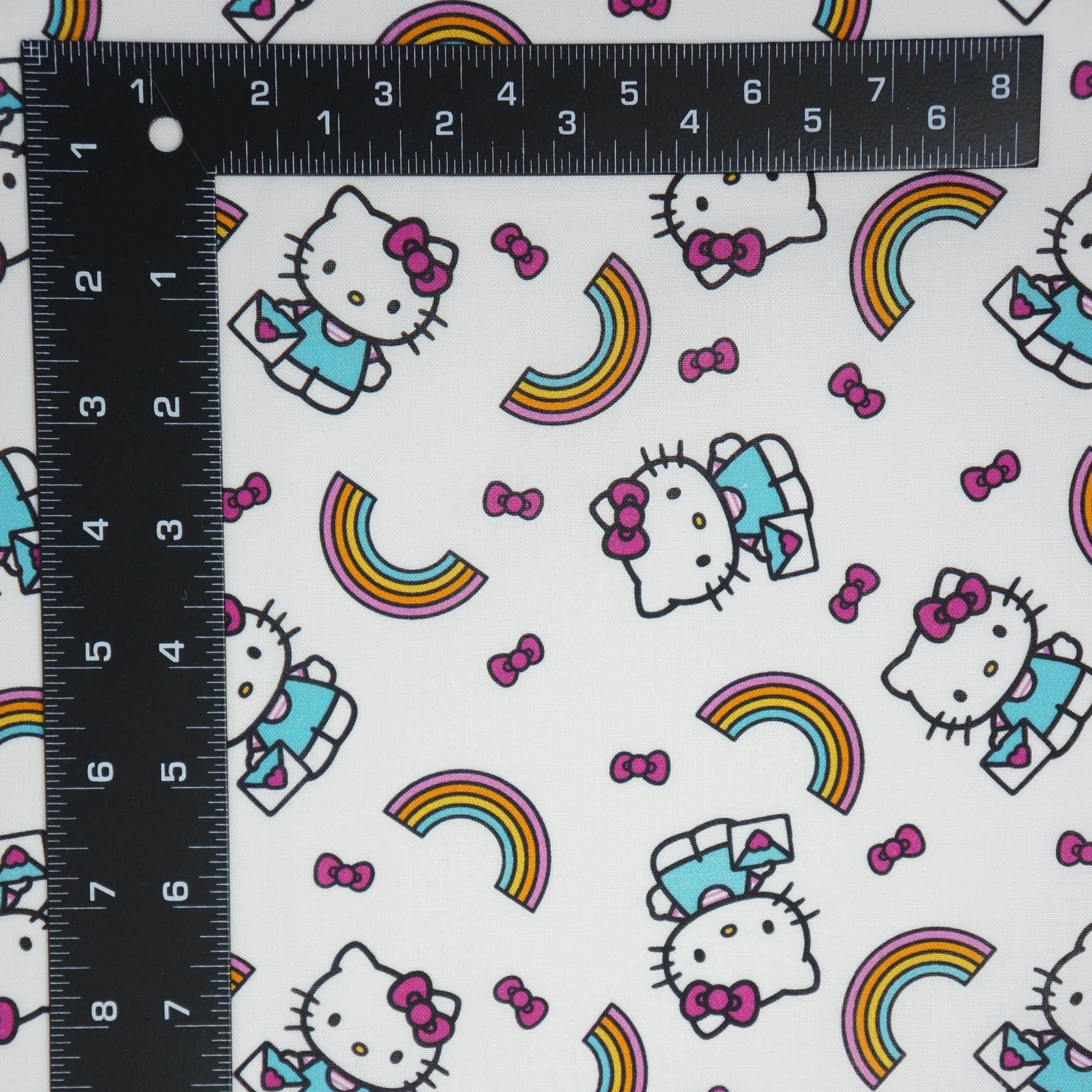 Bring a burst of joy and whimsy to your crafting projects with this delightful Hello Kitty rainbow toss fabric, featuring adorable Hello Kitty characters playfully scattered across a crisp white background. Each cute feline is dressed in a turquoise outfit with her signature pink bow, tumbling alongside vibrant multicolored rainbows in shades of yellow, orange, pink, and blue, along with floating pink bows for an extra touch of charm. The tossed pattern creates a fun, dynamic design that's perfect for sewing children's apparel, quilts, home decor accents, or upholstery for playful furniture pieces. Made from soft, high-quality cotton, this fabric offers a smooth texture that's easy to work with, ensuring your creations are both comfortable and eye-catching. Ideal for Hello Kitty enthusiasts, this licensed print sparks creativity and adds a rainbow of happiness to any handmade item, making it a must-have for DIY crafters and hobbyists alike.