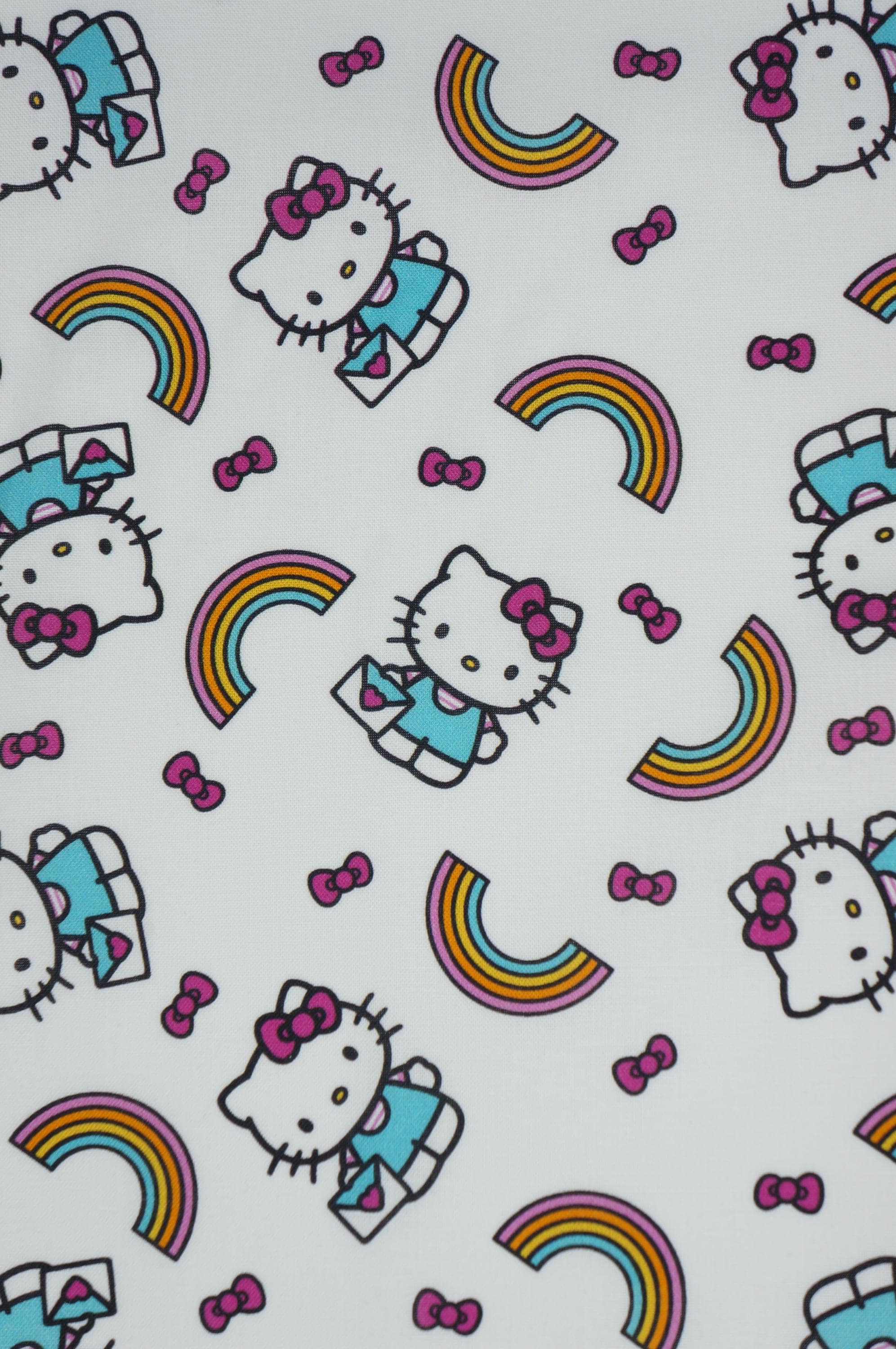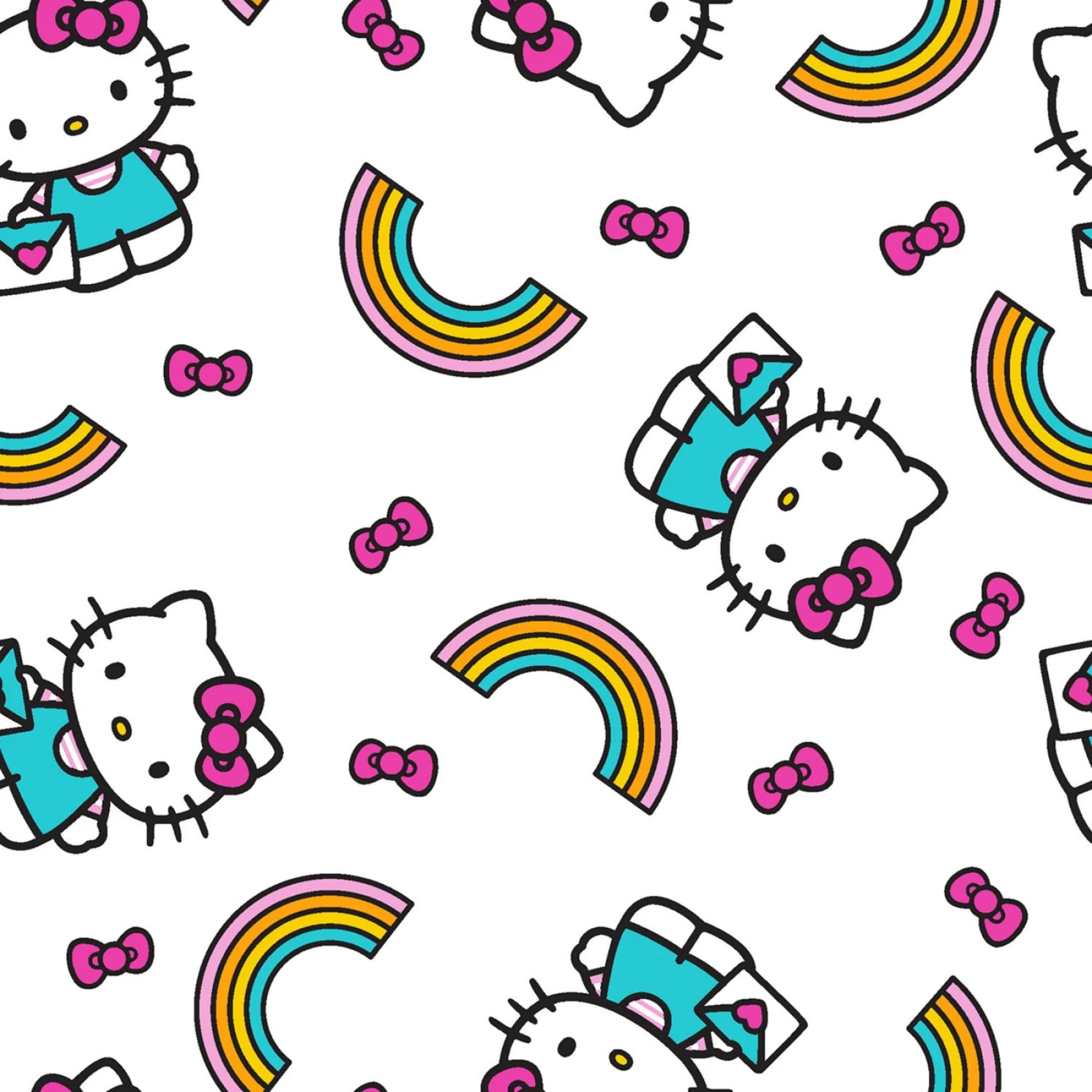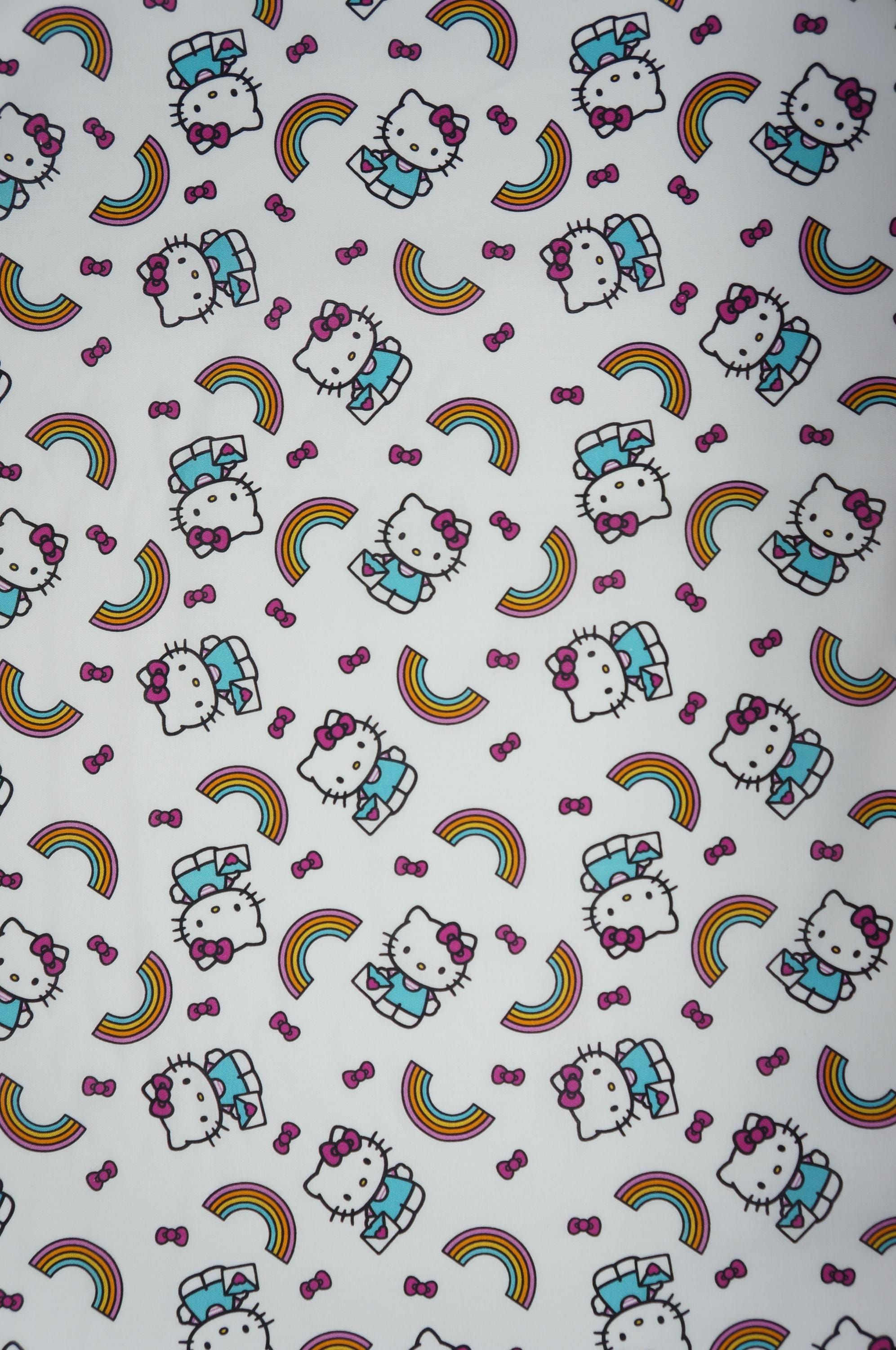 Bring a burst of joy and whimsy to your crafting projects with this delightful Hello Kitty rainbow toss fabric, featuring adorable Hello Kitty characters playfully scattered across a crisp white background. Each cute feline is dressed in a turquoise outfit with her signature pink bow, tumbling alongside vibrant multicolored rainbows in shades of yellow, orange, pink, and blue, along with floating pink bows for an extra touch of charm. The tossed pattern creates a fun, dynamic design that's perfect for sewing children's apparel, quilts, home decor accents, or upholstery for playful furniture pieces. Made from soft, high-quality cotton, this fabric offers a smooth texture that's easy to work with, ensuring your creations are both comfortable and eye-catching. Ideal for Hello Kitty enthusiasts, this licensed print sparks creativity and adds a rainbow of happiness to any handmade item, making it a must-have for DIY crafters and hobbyists alike.