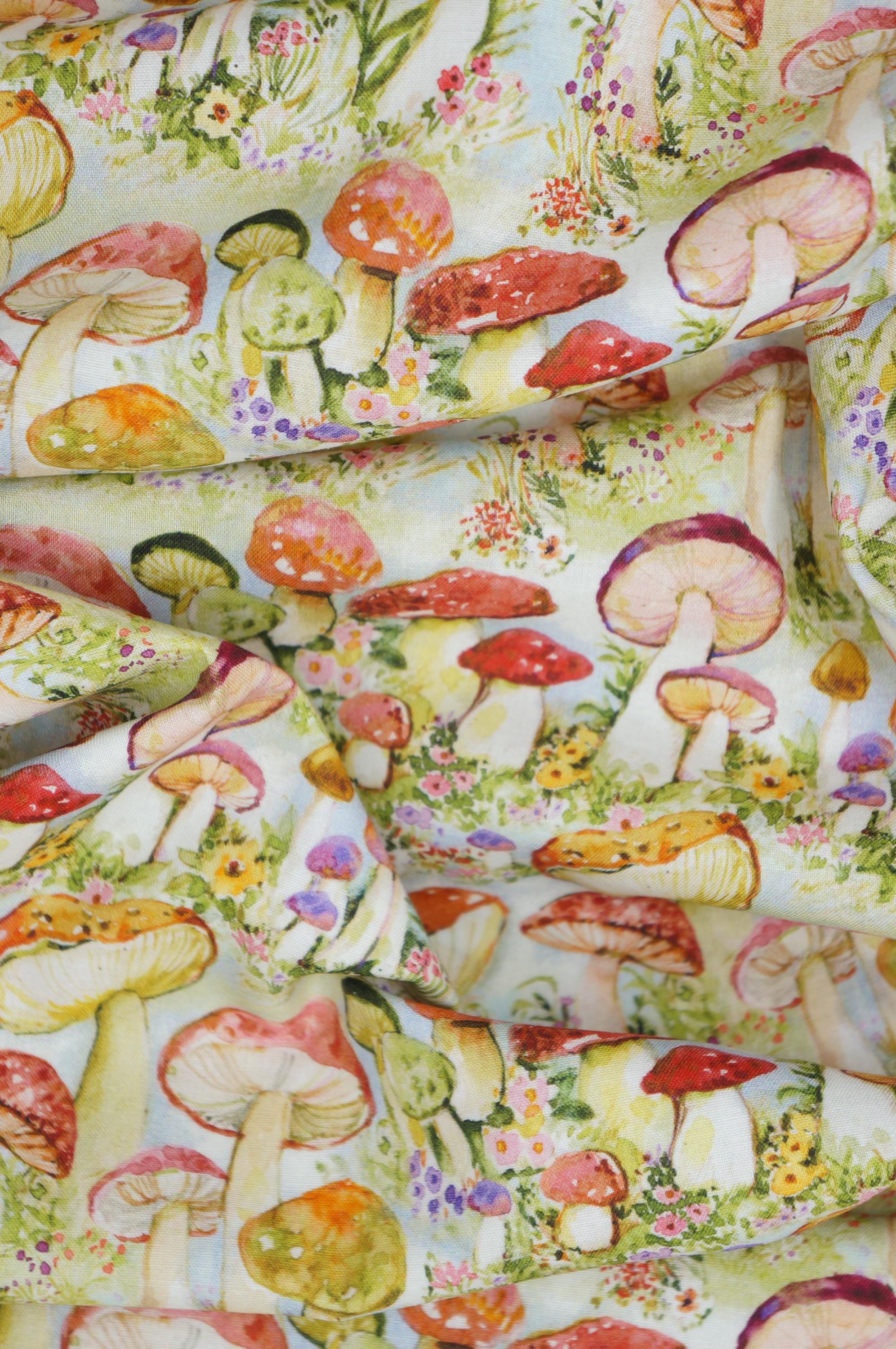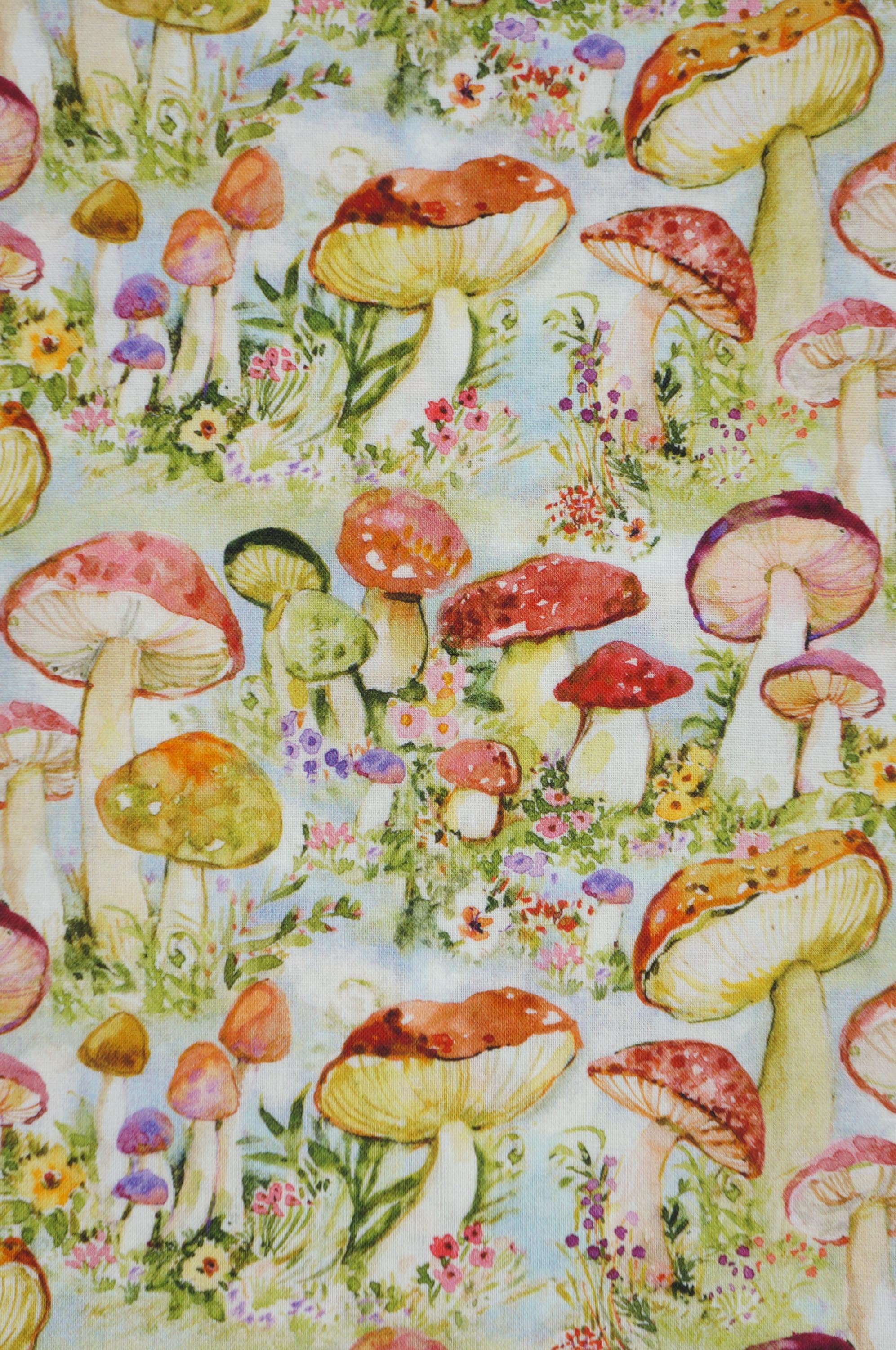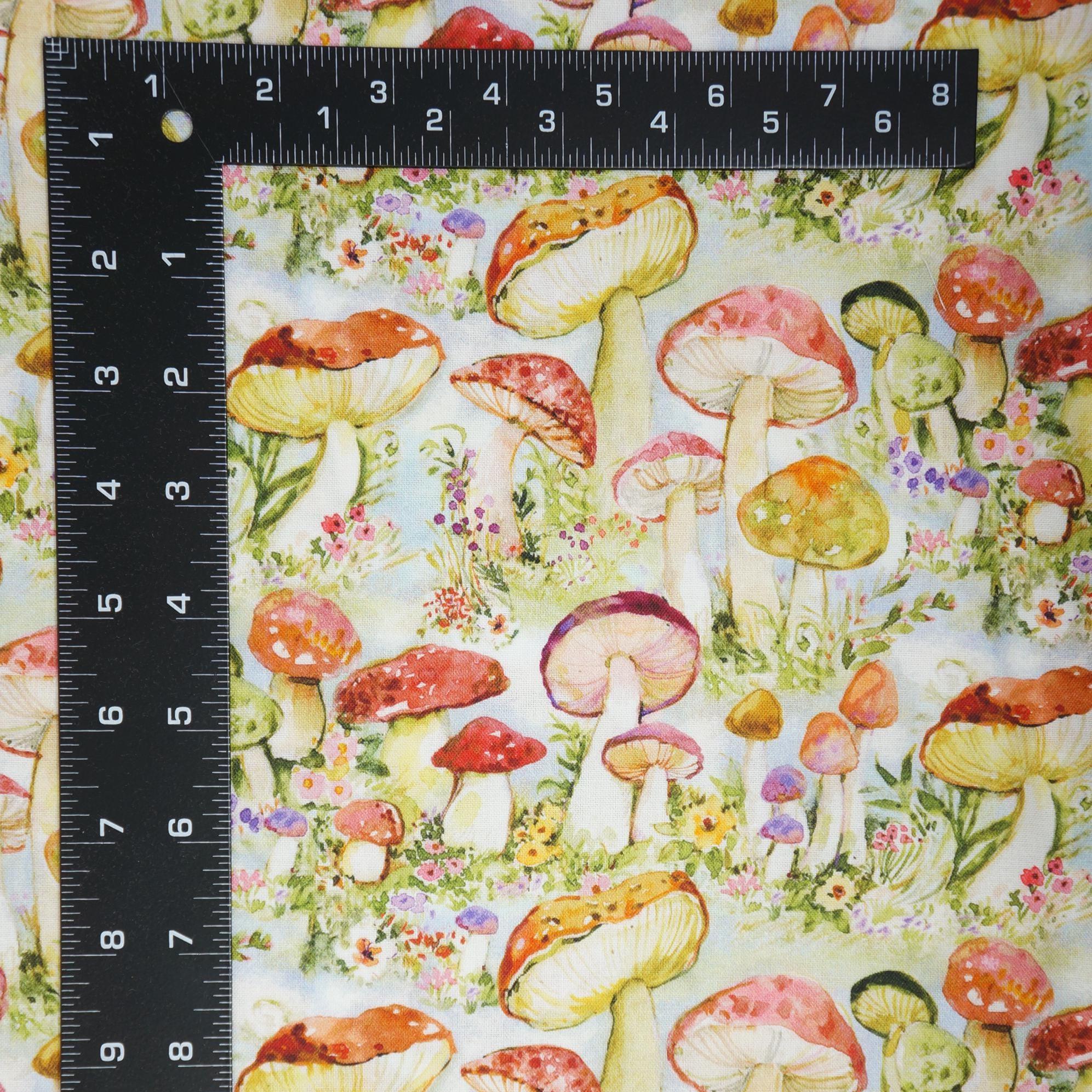 Dive into a whimsical world of enchantment with this delightful novelty cotton fabric by Susan Winget for Springs Creative. This fabric features a vibrant array of colorful mushrooms in shades of red, orange, green, purple, and yellow, artfully scattered across a soft pastel blue background like a fairy-tale forest come to life. The watercolor-style print captures the magic of nature with intricate details on each mushroom cap, from speckled textures to smooth gradients, intertwined with blooming flowers in pinks, yellows, and purples, plus delicate green foliage and grassy accents for a truly immersive design. Perfect for sparking creativity in crafting projects such as quilts, apparel, or whimsical home decor. This soft woven cotton fabric offers a playful yet sophisticated appeal that adds a touch of fantasy to upholstery or DIY accessories. Its high-quality weave ensures durability and ease of use, making it ideal for sewists and hobbyists seeking to infuse their creations with vibrant mushroom print charm and floral whimsy.