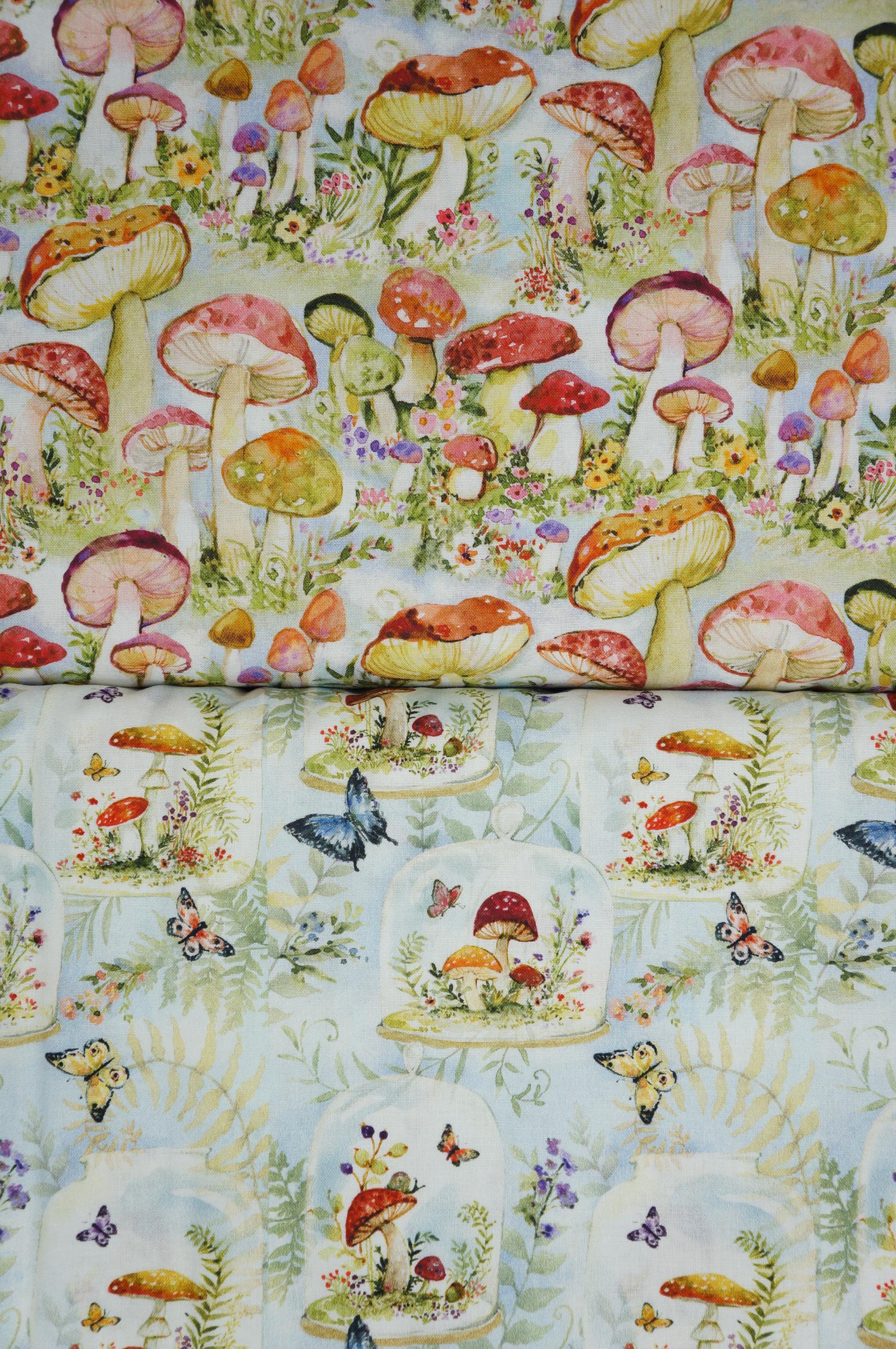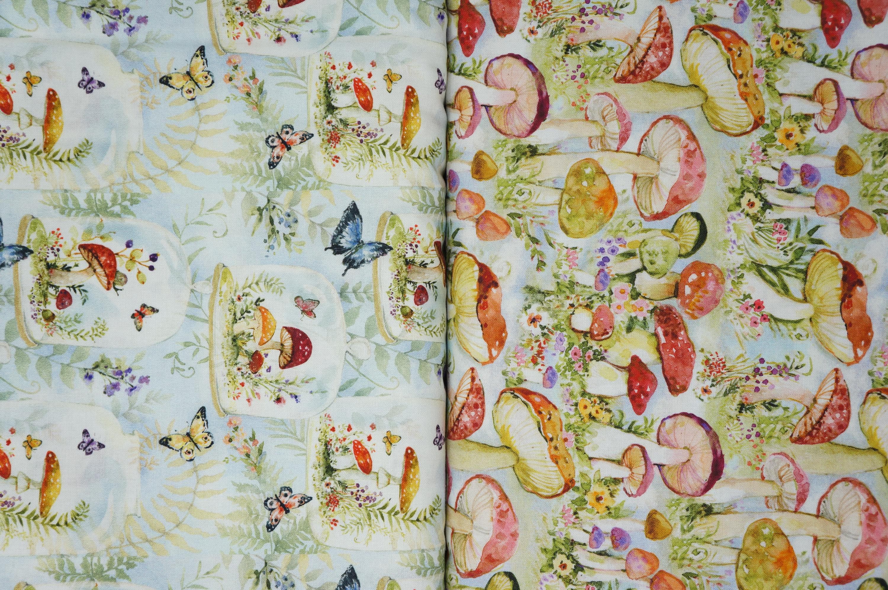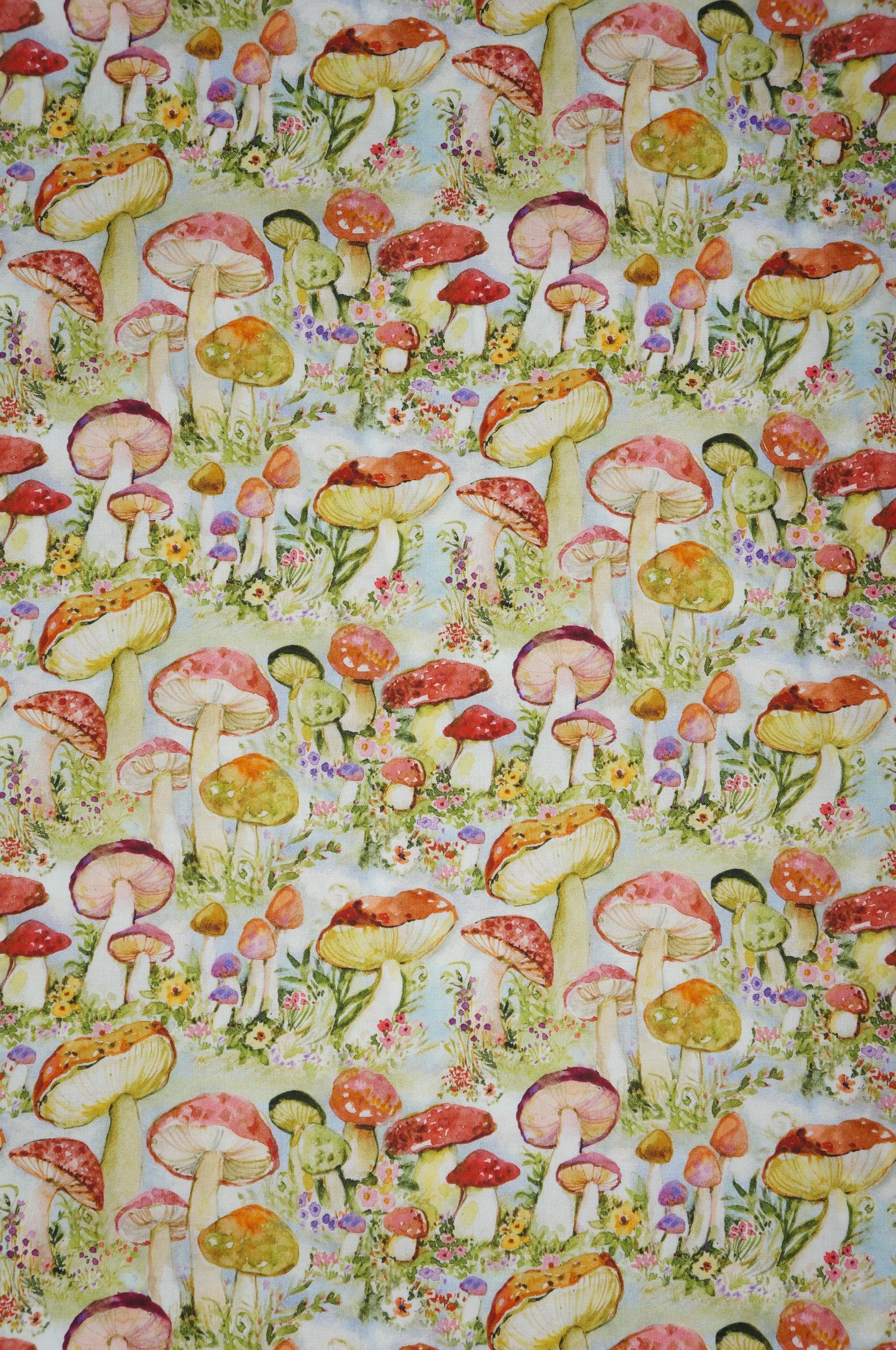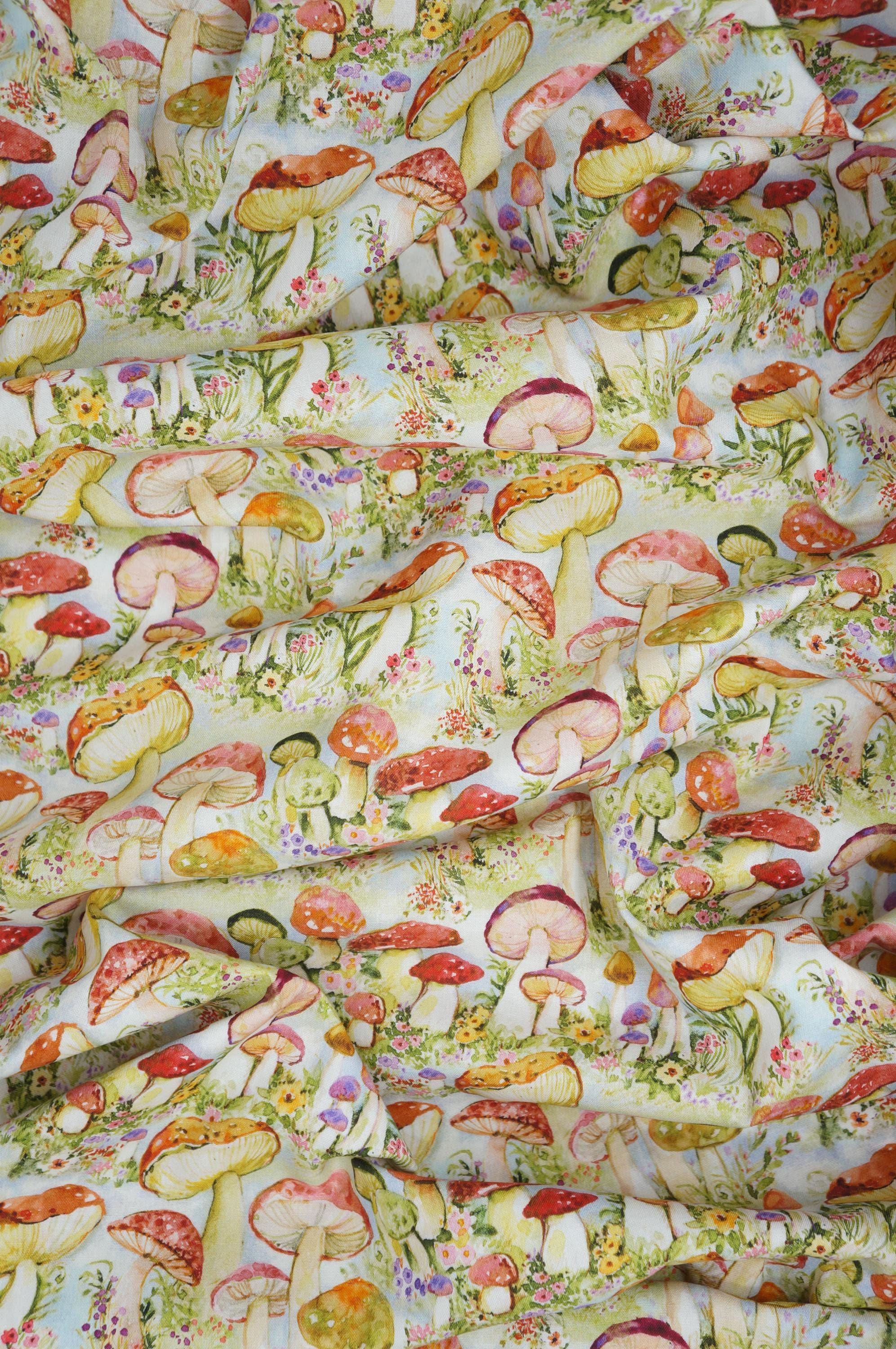 Dive into a whimsical world of enchantment with this delightful novelty cotton fabric by Susan Winget for Springs Creative. This fabric features a vibrant array of colorful mushrooms in shades of red, orange, green, purple, and yellow, artfully scattered across a soft pastel blue background like a fairy-tale forest come to life. The watercolor-style print captures the magic of nature with intricate details on each mushroom cap, from speckled textures to smooth gradients, intertwined with blooming flowers in pinks, yellows, and purples, plus delicate green foliage and grassy accents for a truly immersive design. Perfect for sparking creativity in crafting projects such as quilts, apparel, or whimsical home decor. This soft woven cotton fabric offers a playful yet sophisticated appeal that adds a touch of fantasy to upholstery or DIY accessories. Its high-quality weave ensures durability and ease of use, making it ideal for sewists and hobbyists seeking to infuse their creations with vibrant mushroom print charm and floral whimsy.