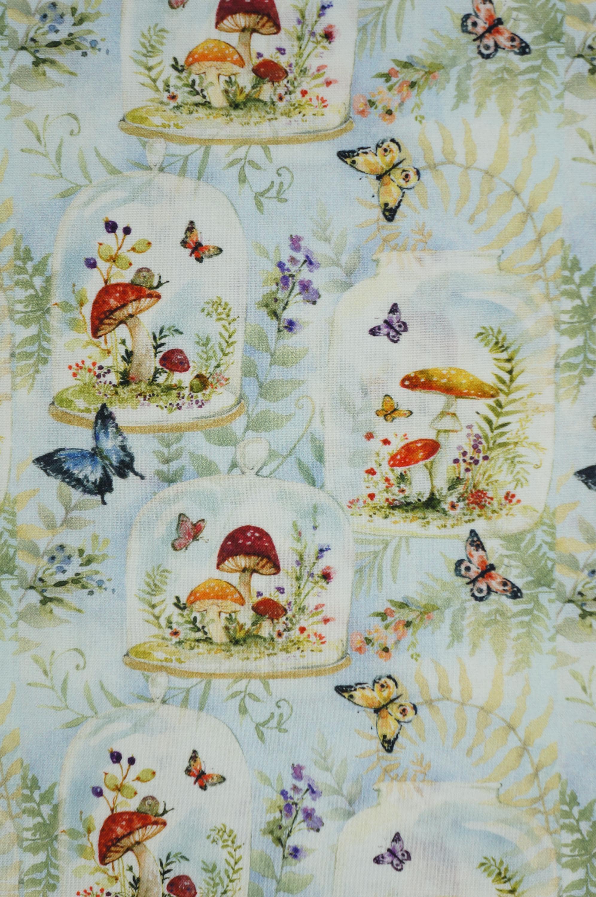 Dive into a whimsical world of enchantment with this delightful novelty cotton fabric by Susan Winget for Springs Creative. This fabric features delicate glass jars brimming with vibrant mushrooms in shades of red, orange, and white, accompanied by playful snails, fluttering butterflies in blue, orange, and red hues, and lush ferns and purple wildflowers. Set against a soft pastel blue background, the watercolor-style illustrations create a magical, fairy-tale atmosphere that's perfect for sparking creativity in quilting projects, crafting adorable children's apparel, or adding a touch of woodland wonder to home decor like pillows and curtains. The intricate details of each terrarium scene, with swirling vines and blooming botanicals, make this fabric a delightful choice for DIY enthusiasts seeking to infuse their creations with nature-inspired charm and vibrant colors, ensuring every piece stands out with its soft, breathable texture and eye-catching design.