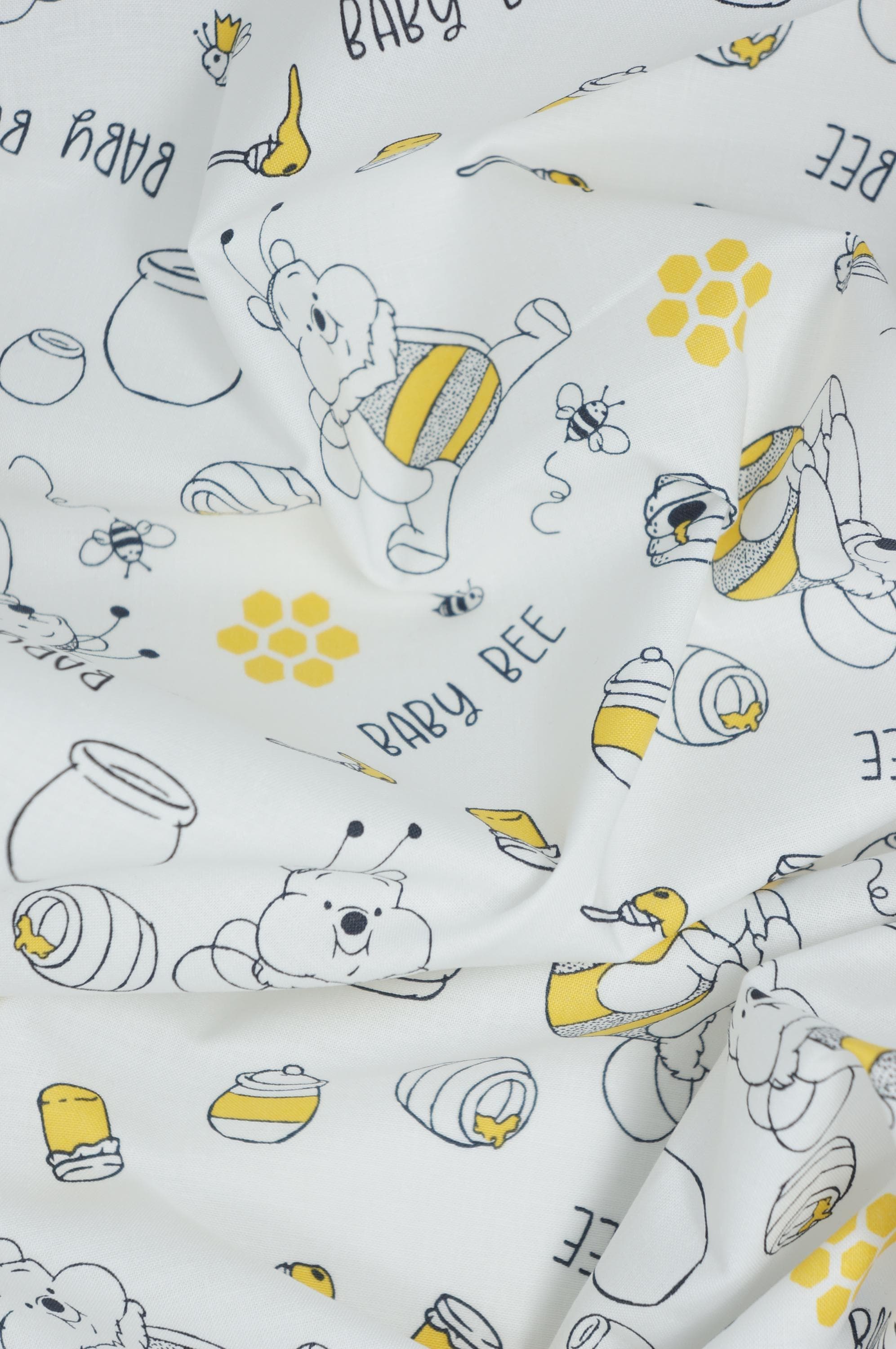 Delight in the whimsical charm of this 100% novelty cotton fabric by Springs Creative featuring an enchanting Winnie the Pooh bee motif, perfect for crafting adorable baby quilts, nursery decor, or playful upholstery accents. The playful design bursts with black-line illustrations of buzzing bees—some adorned with tiny crowns—honeycombs, golden honey pots, and the beloved Pooh Bear himself, dressed in a striped bee costume while reaching for treats. Subtle yellow accents add a pop of sweetness against the crisp white background, creating a lighthearted pattern that's ideal for sewing soft blankets, bibs, or curtains that spark joy in little ones' spaces. This licensed fabric offers a soft, breathable weave that's easy to work with, ensuring your DIY projects turn out as cute and cuddly as Pooh's honey adventures. Embrace the buzz of creativity with this endearing print that captures the magic of childhood imagination.