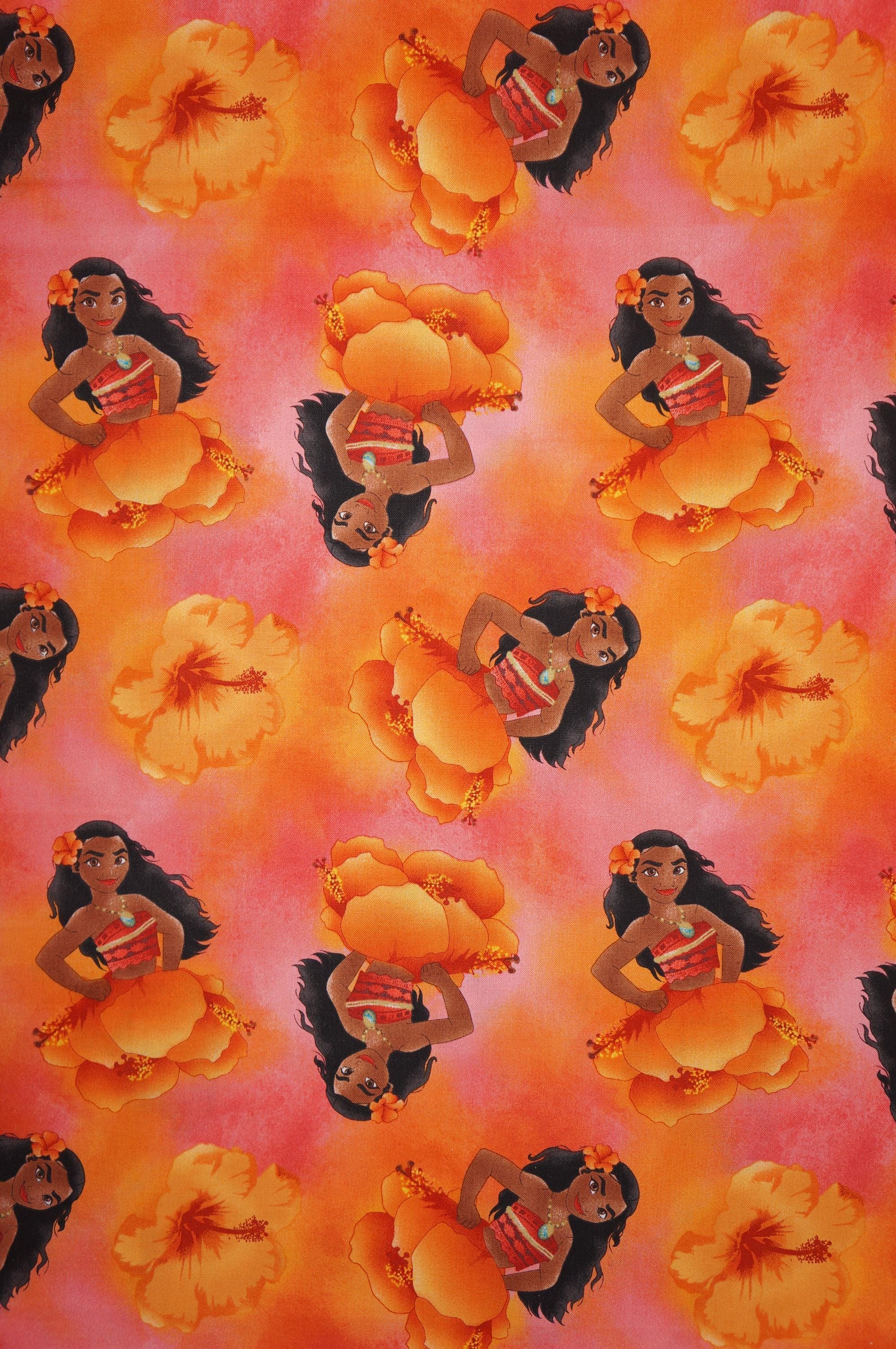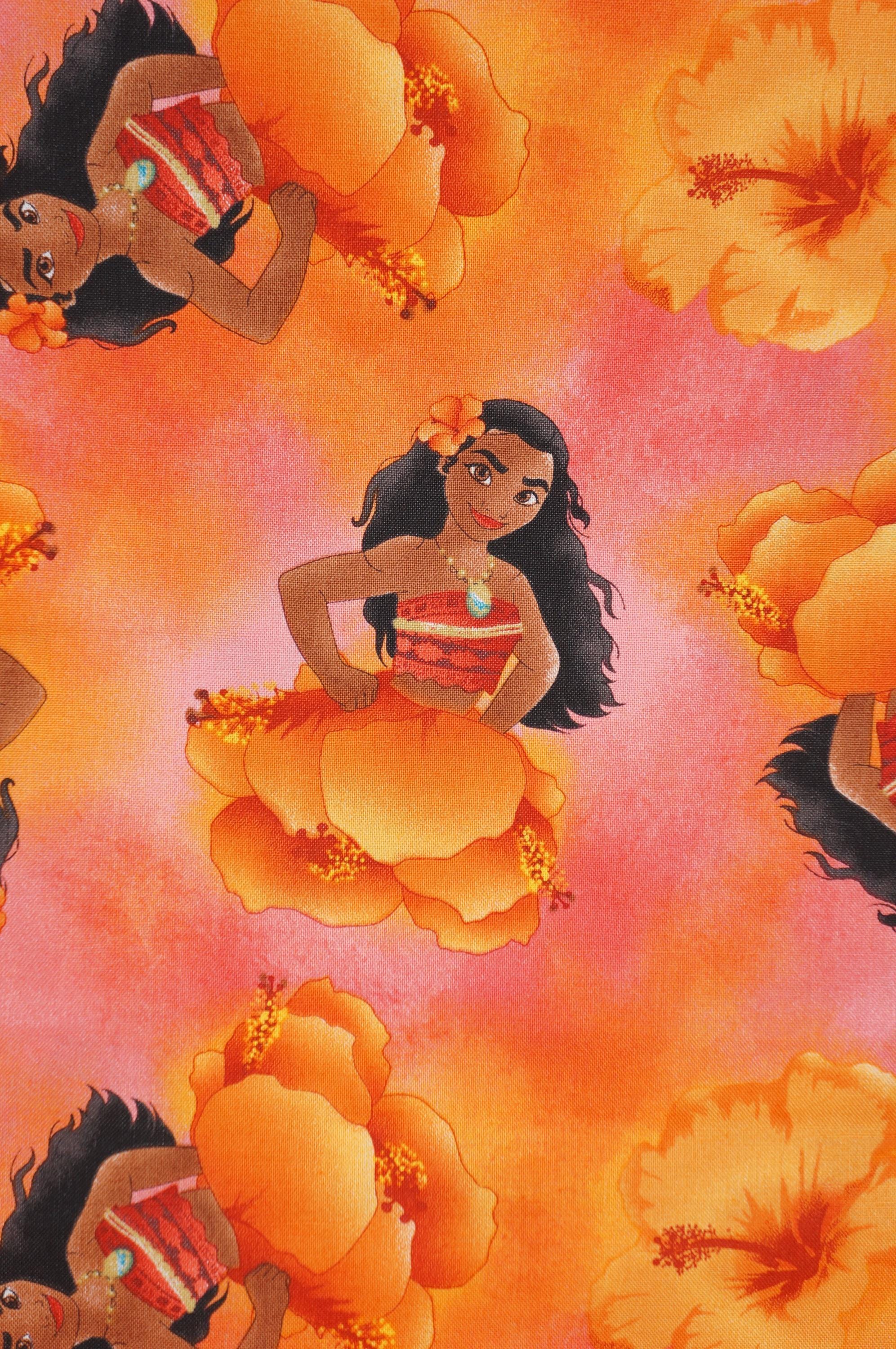 Bring the magic of Disney's Moana to your creative projects with this captivating novelty cotton fabric licensed by Springs Creative. This fabric features a lively all-over print of the adventurous heroine surrounded by bold orange hibiscus flowers. The soft pink background enhances the tropical vibe, with Moana in dynamic poses—holding vibrant blooms and flowing skirts—creating a whimsical, oceanic-inspired pattern perfect for sewing enthusiasts. Ideal for crafting quilts, pillow covers, tote bags, or upholstery accents that add a splash of island paradise to home decor, this woven texture offers comfort and durability for everyday use. Its rich colors and detailed motifs ensure eye-catching results in apparel, accessories, or decorative pieces, evoking the spirit of exploration and joy.