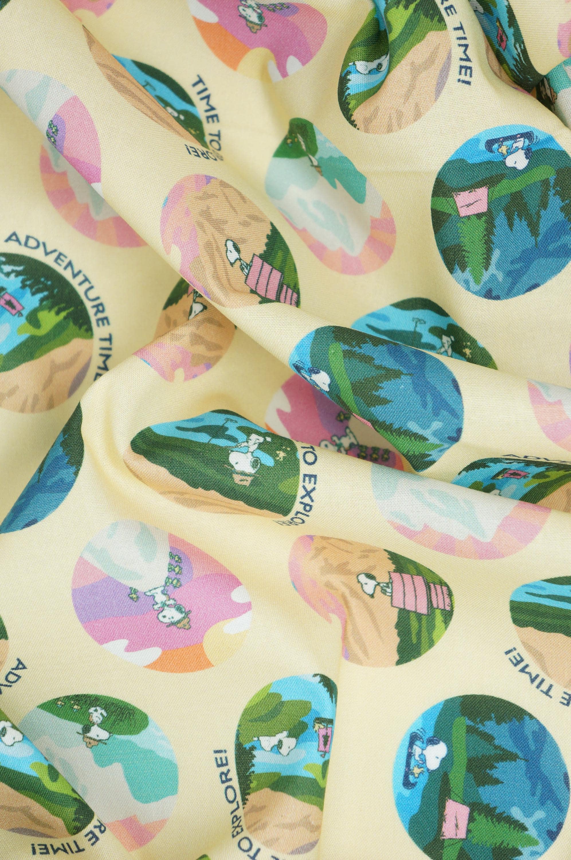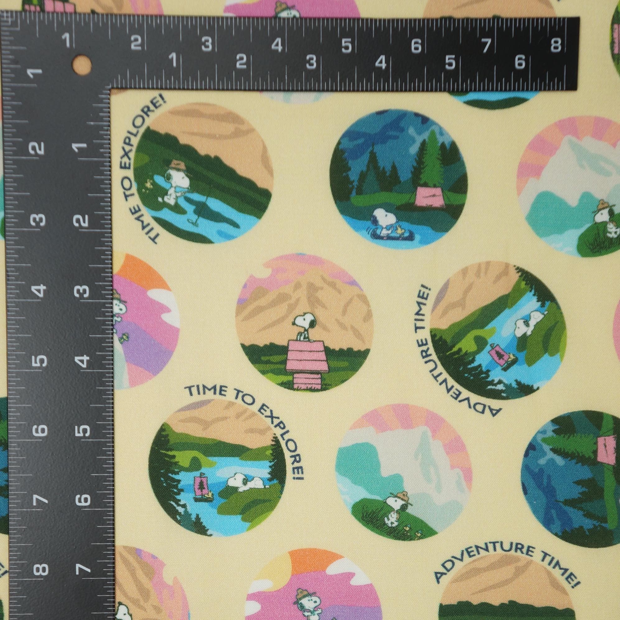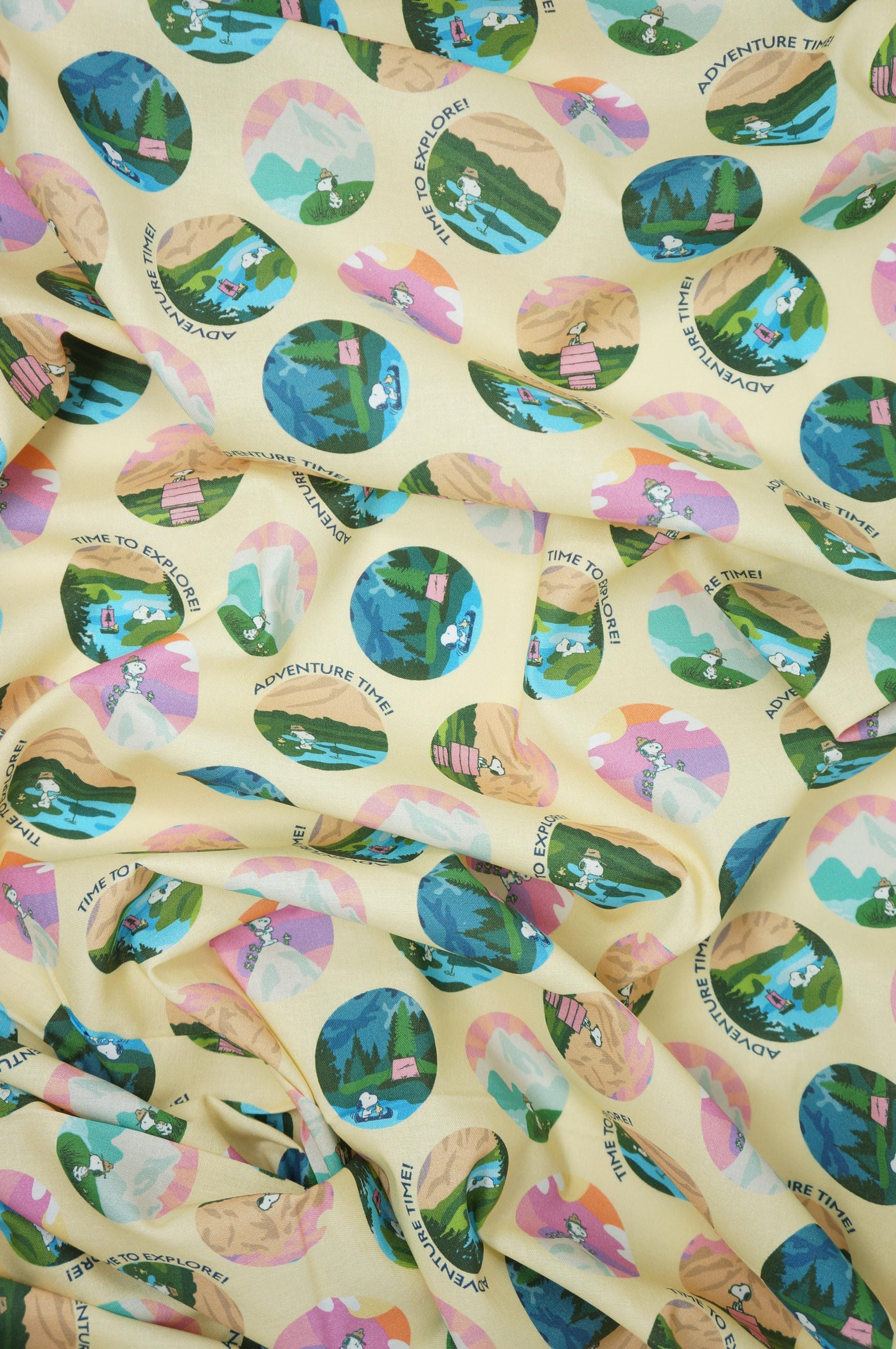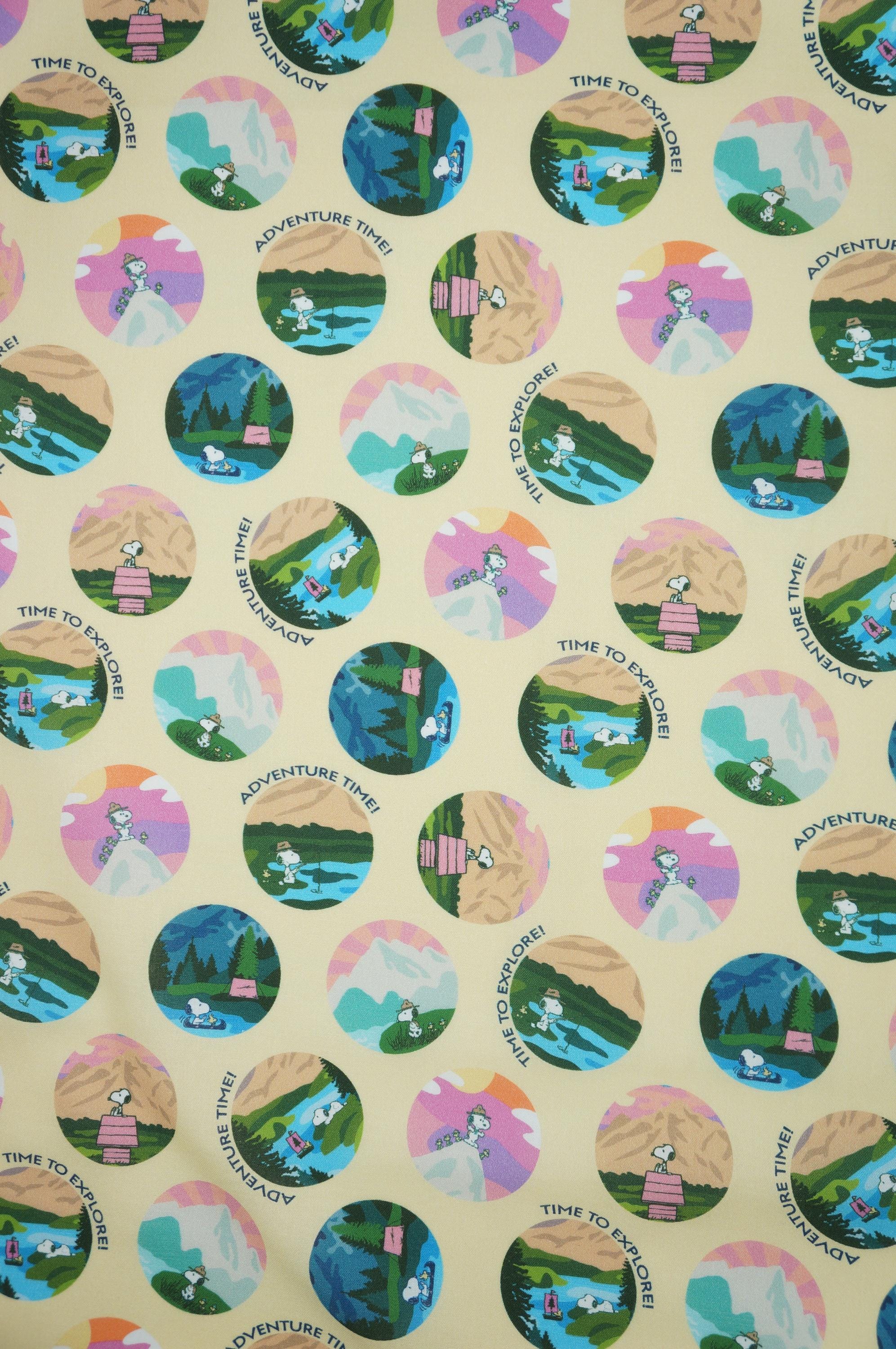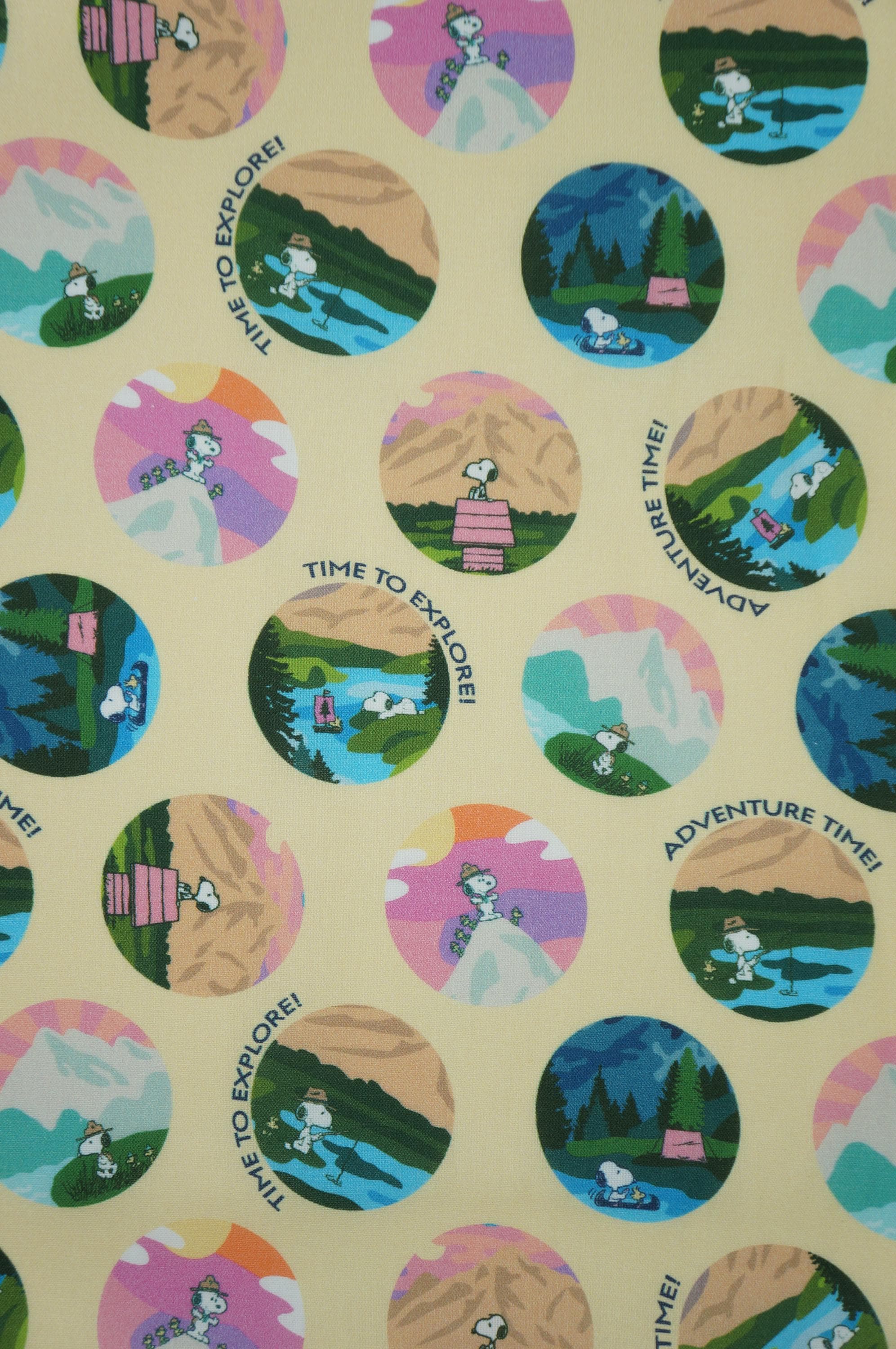 Embark on a whimsical journey with this delightful Snoopy adventure print fabric licensed by Springs Creative, featuring the beloved cartoon beagle in a series of charming circular motifs set against a soft yellow background. Each vibrant circle captures Snoopy exploring nature's wonders—hiking majestic mountains at sunset, camping by serene lakes, fishing in tranquil streams, and more—infused with playful phrases like "Time to Explore!" and "Adventure Time!" in cheerful fonts. The design bursts with a harmonious palette of pinks, blues, greens, and yellows, creating a fun, nostalgic vibe perfect for sparking creativity in crafting projects or adding a touch of Peanuts charm to upholstery. Ideal for quilts, apparel, home decor, or DIY accessories, this soft woven cotton fabric invites endless imaginative possibilities, blending iconic character appeal with outdoor adventure themes to inspire both kids and adults alike.