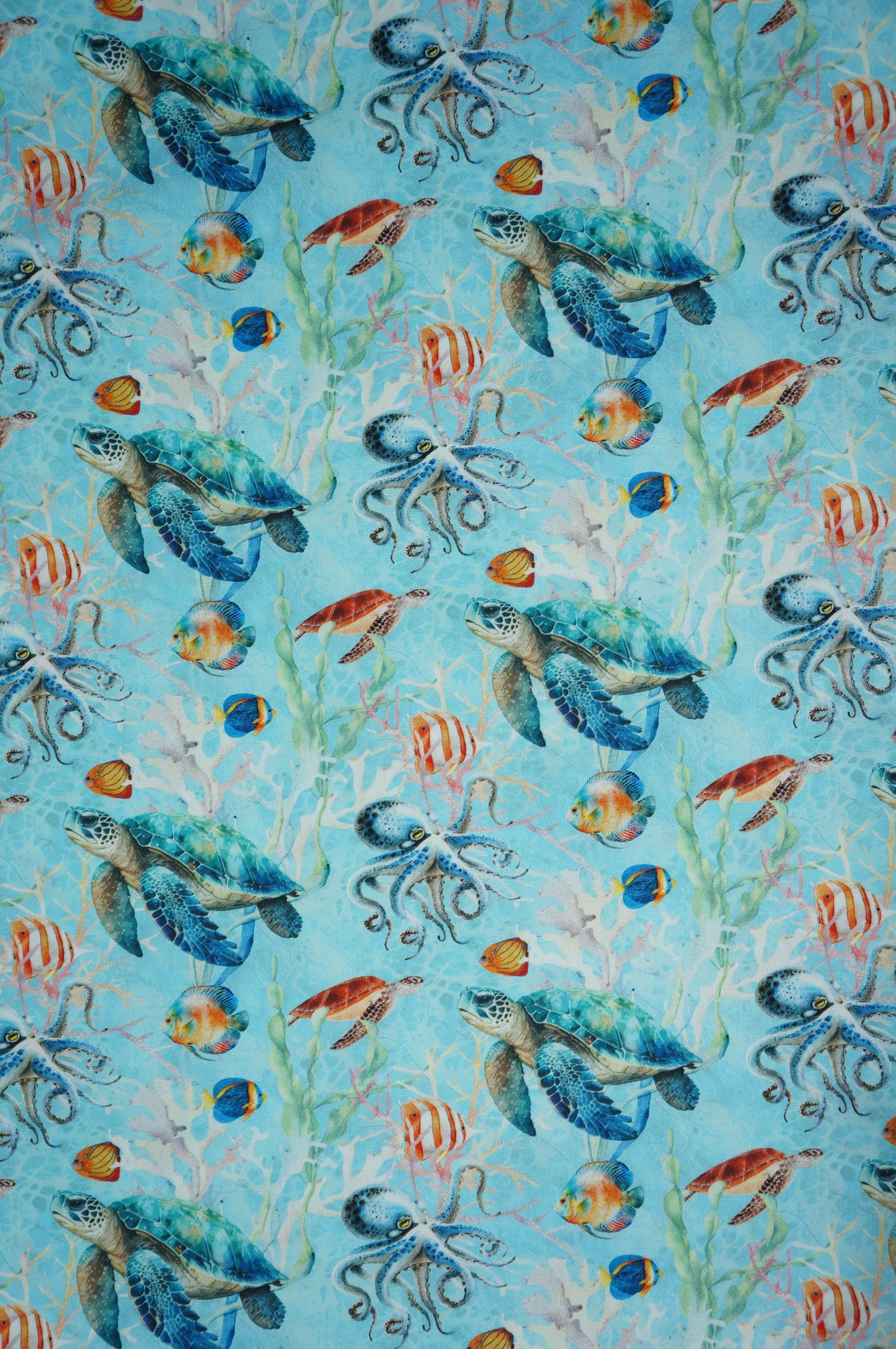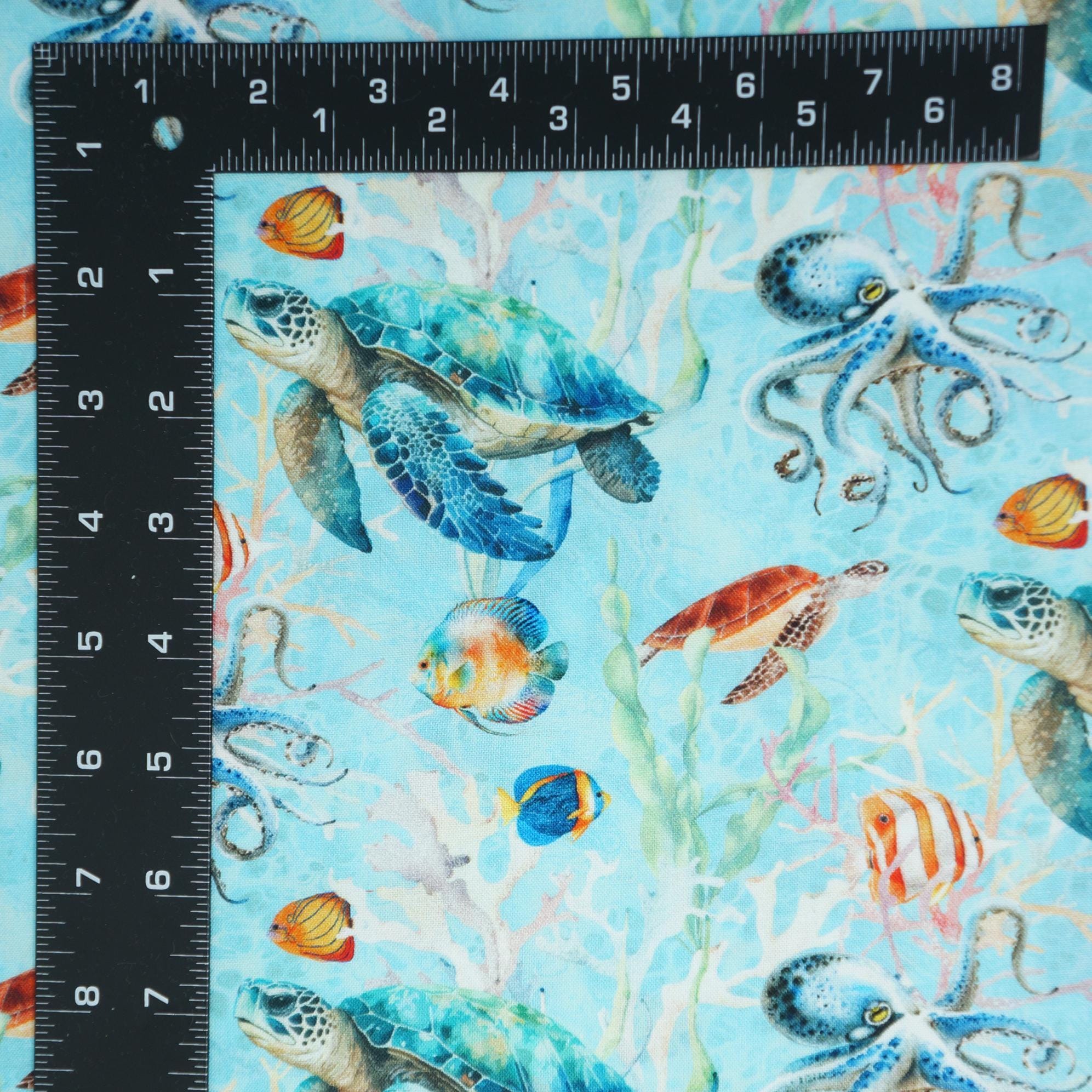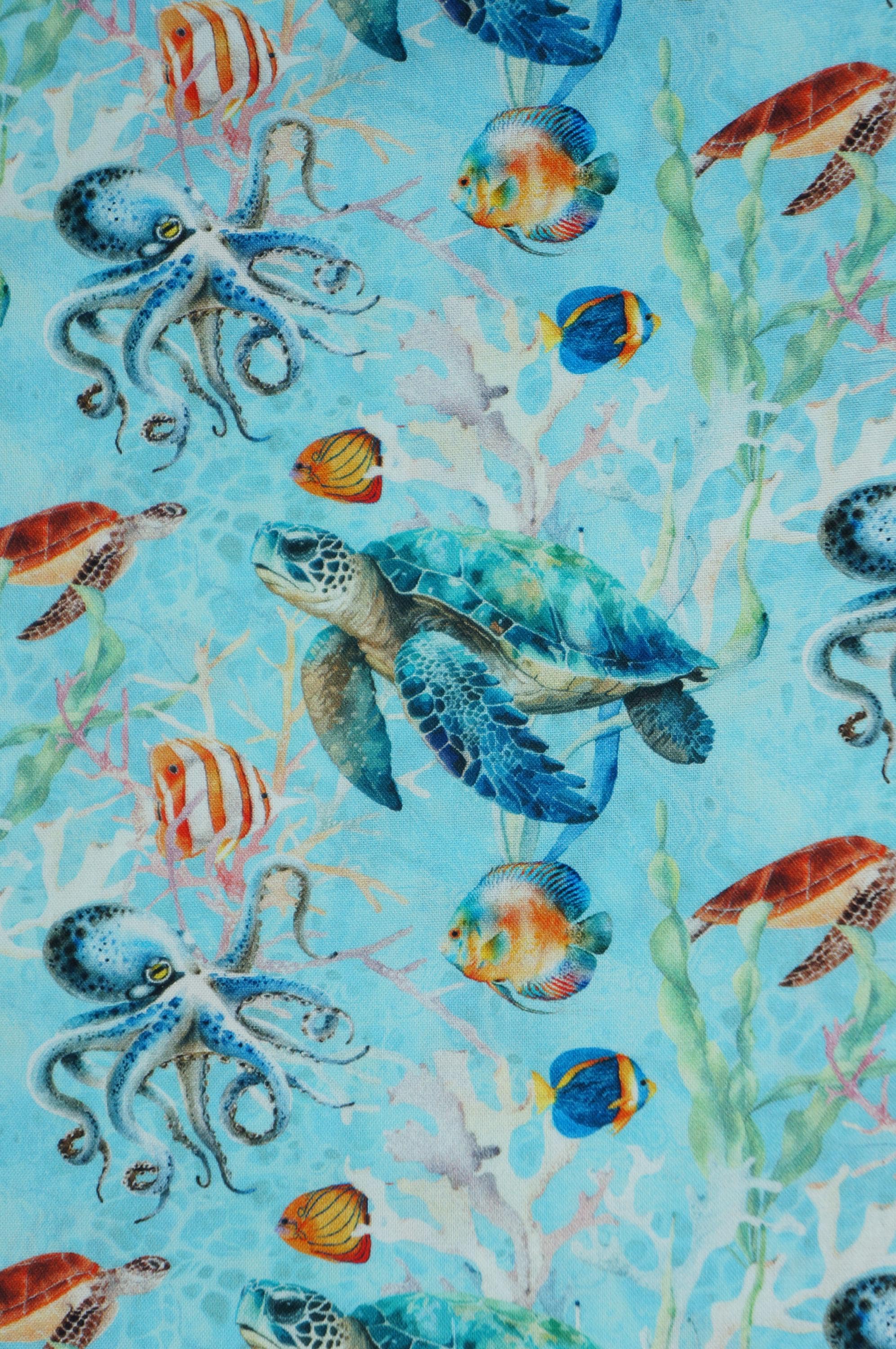 If you are obsessed with turtles, you will love this turtle quilting cotton fabric by Skyline Studio's Under the Sea Collection for Benartex Traditions. This enchanting fabric features an underwater scene filled with vibrant marine life. The design showcases a delightful array of sea turtles, octopuses, and colorful fish swimming amidst coral and seaweed, all set against a light turquoise background. The intricate details of each creature, from the texture of the turtle shells to the playful tentacles of the octopuses, create a lively and captivating pattern that brings the ocean's beauty to life, perfect for crafting projects that evoke a sense of adventure and wonder.