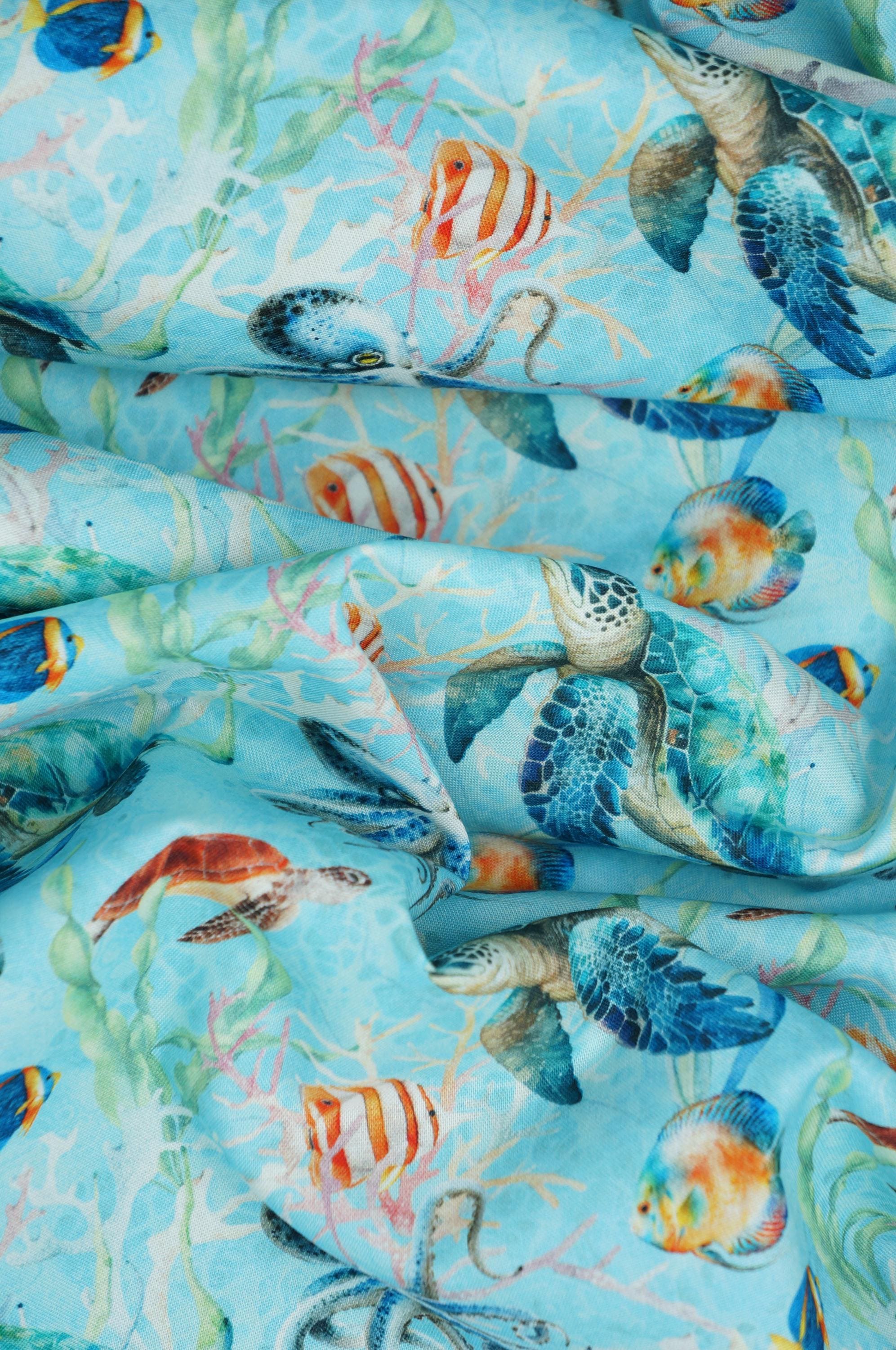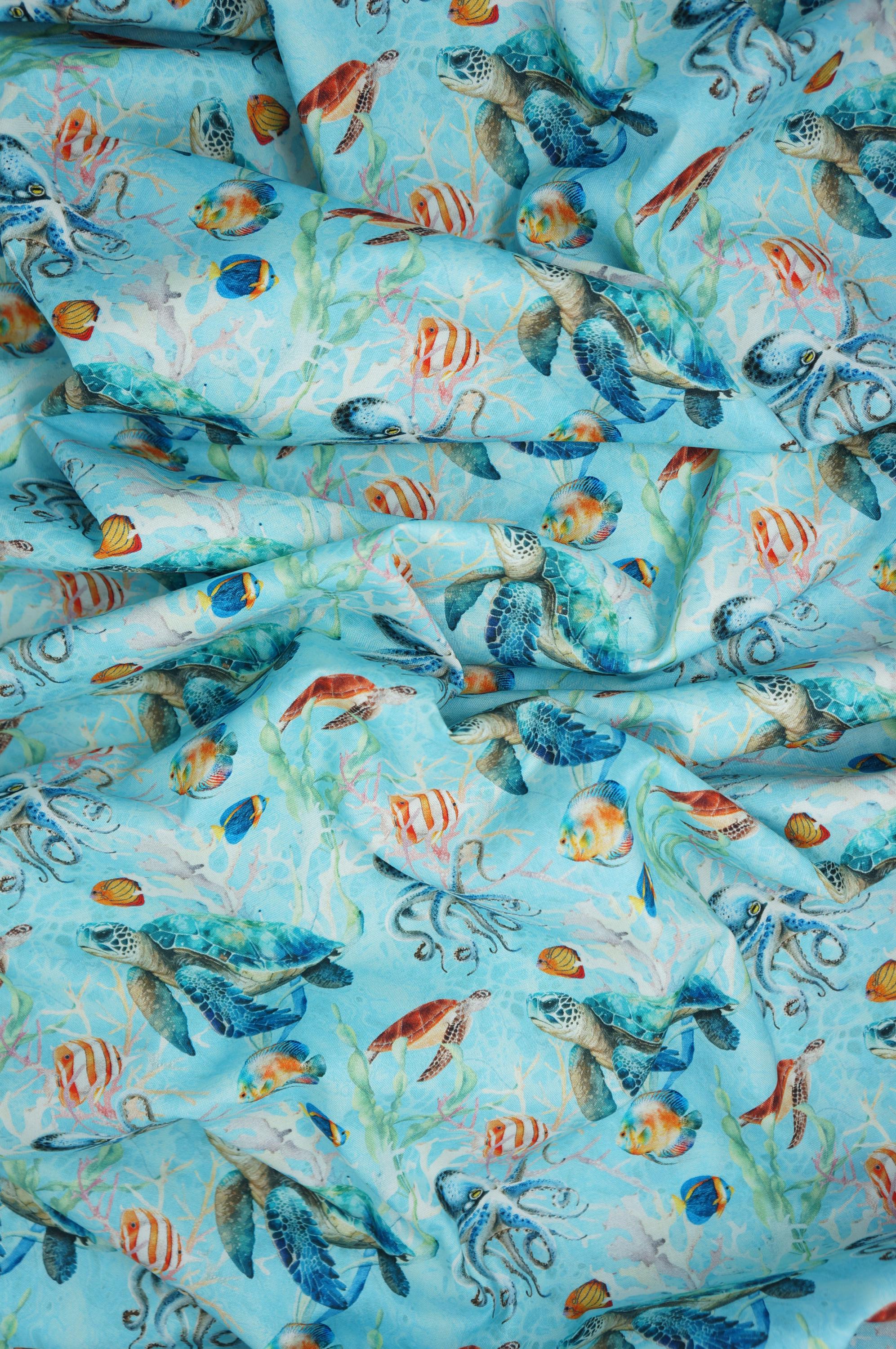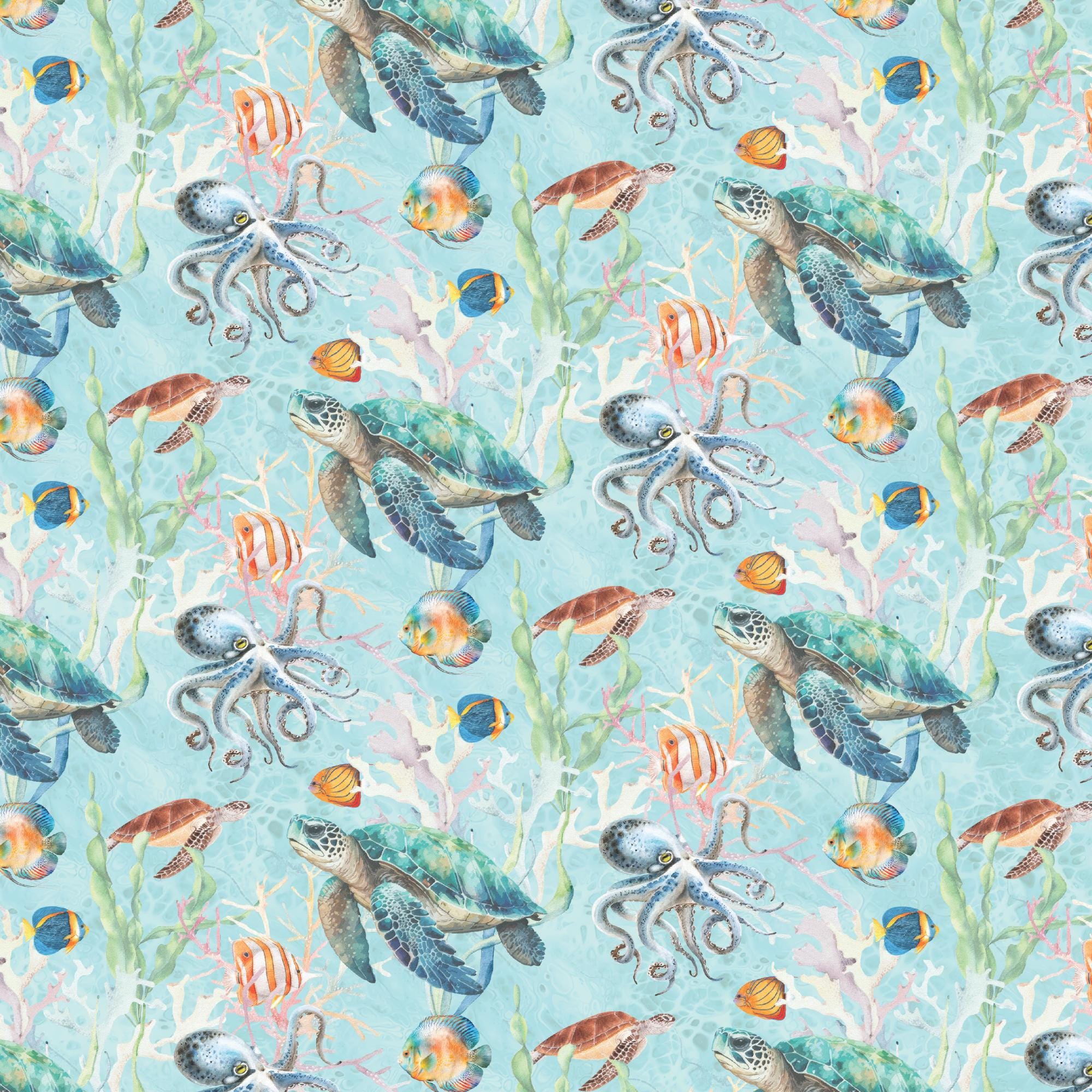 If you are obsessed with turtles, you will love this turtle quilting cotton fabric by Skyline Studio's Under the Sea Collection for Benartex Traditions. This enchanting fabric features an underwater scene filled with vibrant marine life. The design showcases a delightful array of sea turtles, octopuses, and colorful fish swimming amidst coral and seaweed, all set against a light turquoise background. The intricate details of each creature, from the texture of the turtle shells to the playful tentacles of the octopuses, create a lively and captivating pattern that brings the ocean's beauty to life, perfect for crafting projects that evoke a sense of adventure and wonder.
