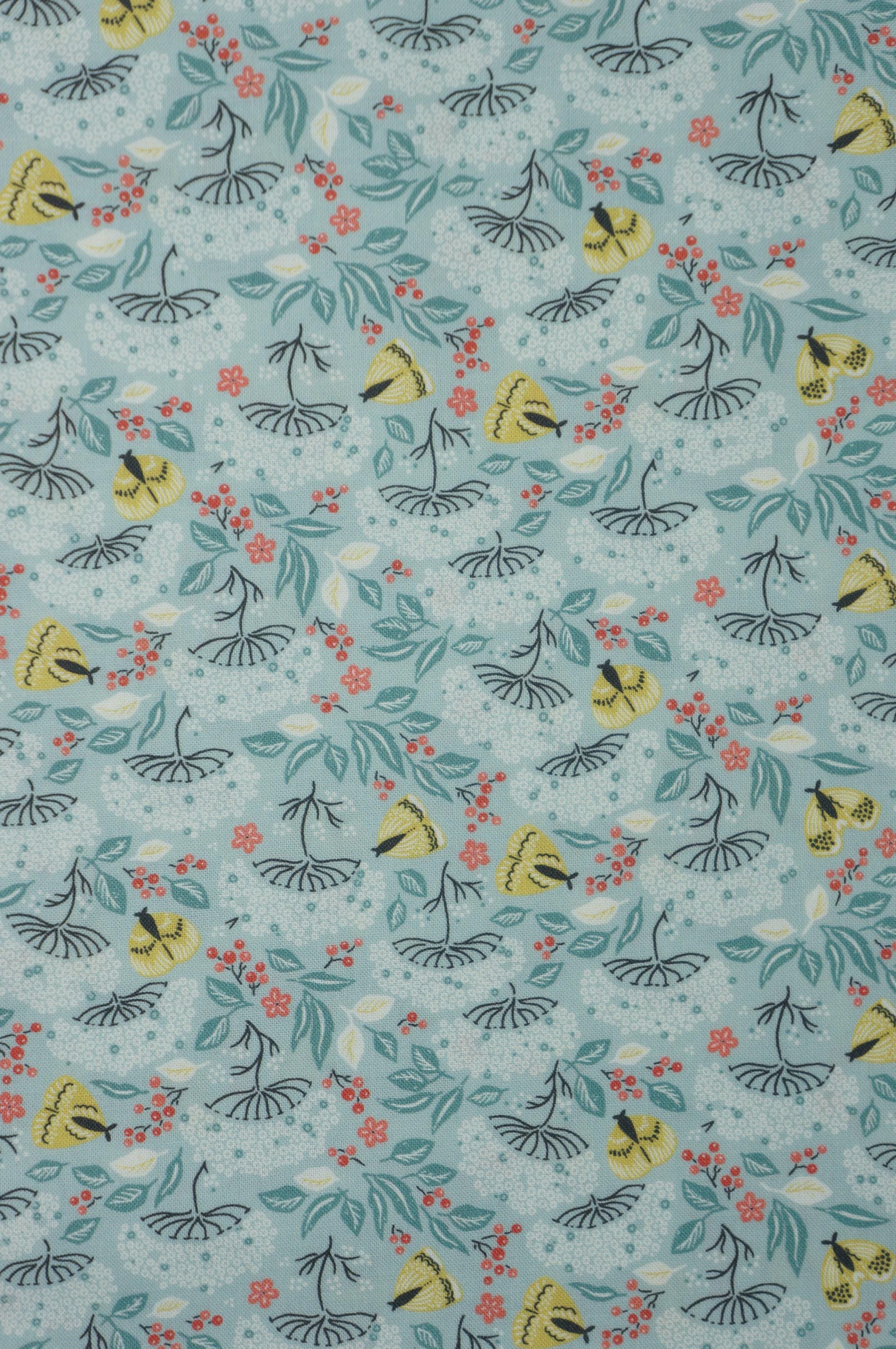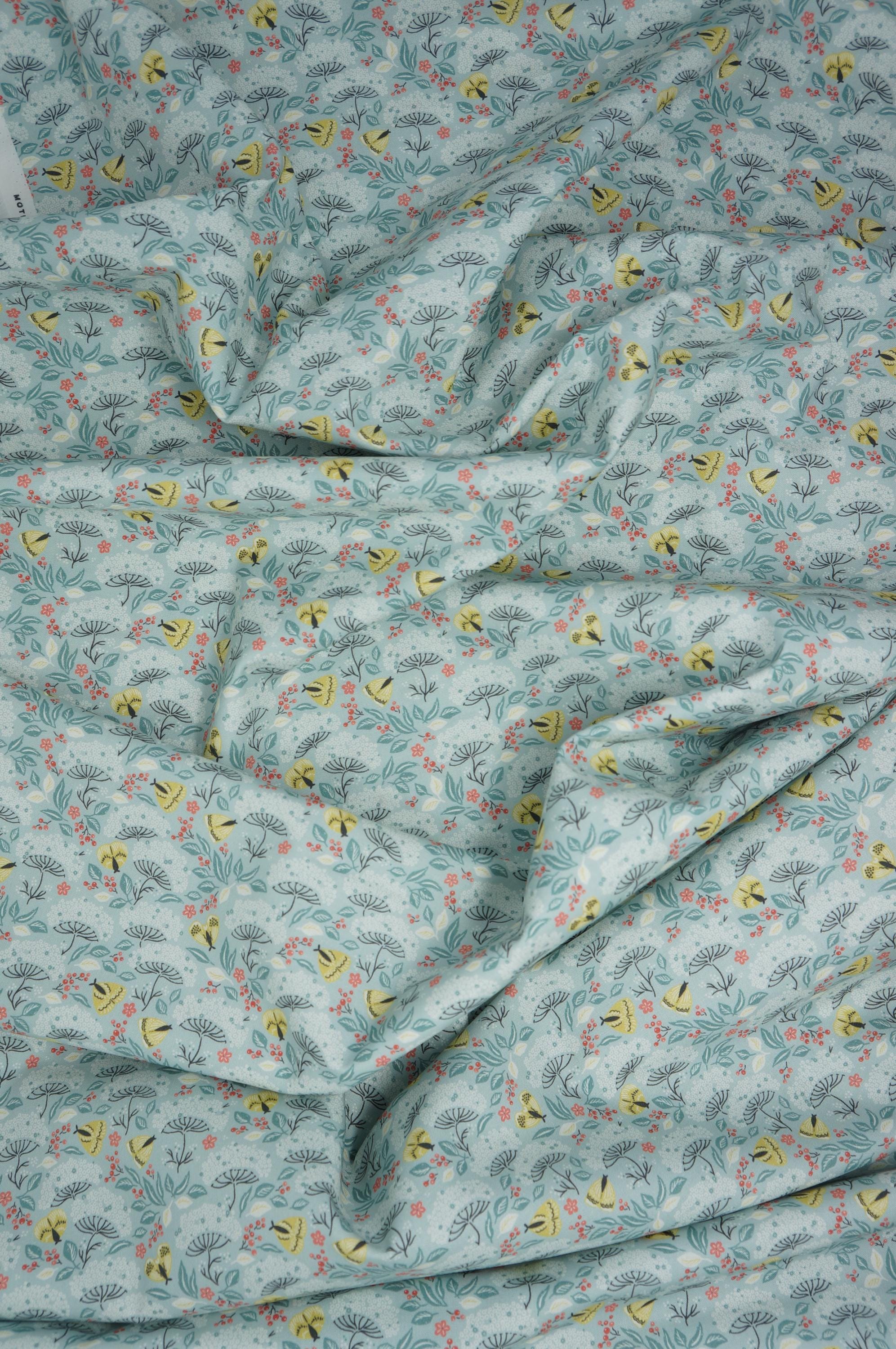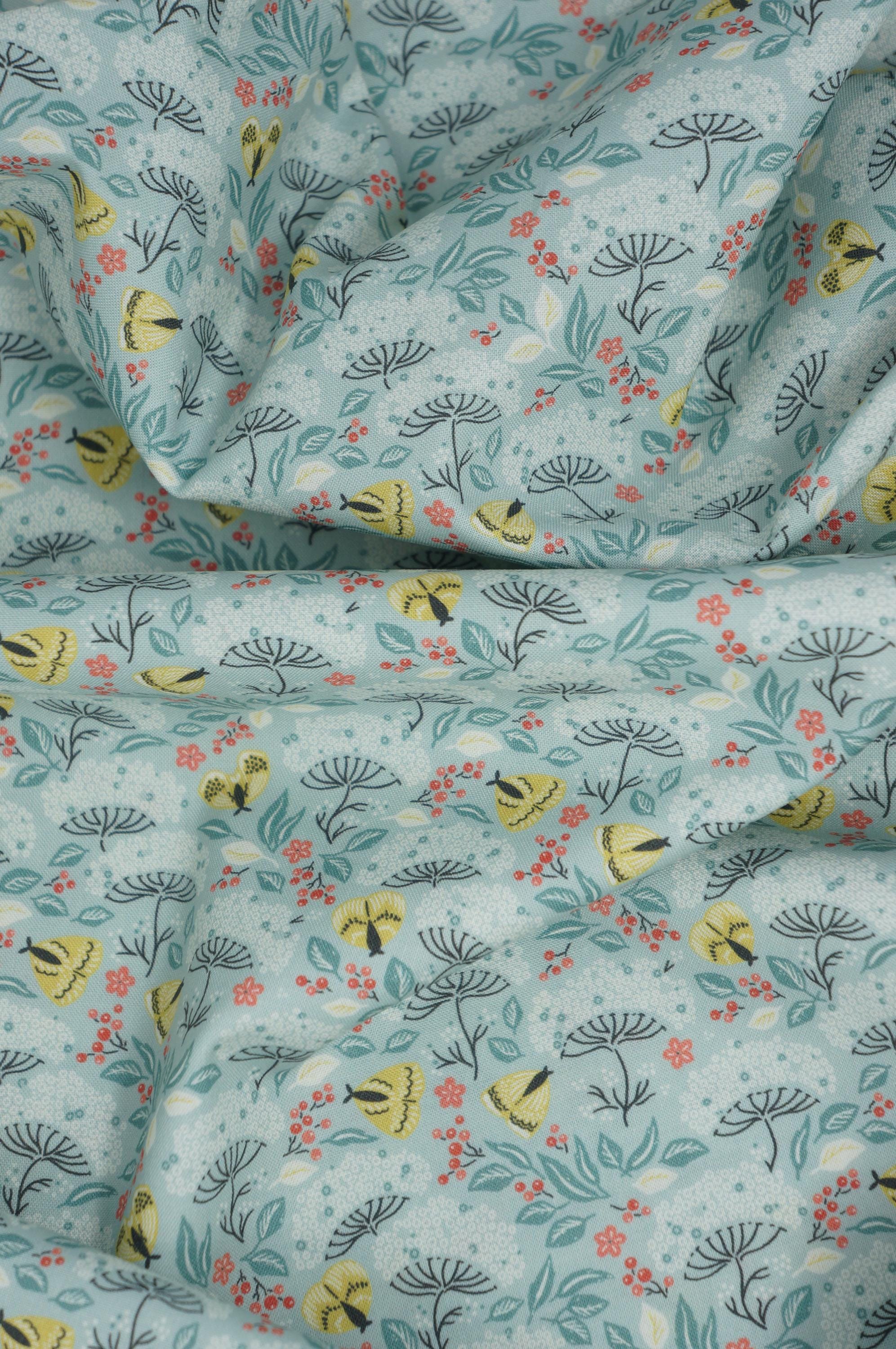 If you love moths and florals, you will adore this fabric from the Cottage Garden Collection by Kimberly Morgan for Cloud 9 Organic Quilting Cotton Fabric called Moth Haven. This charming fabric features a delightful design of turquoise flowers and leaves interspersed with golden moths and small red berries, creating a whimsical garden scene. The intricate pattern is set against a soft, light blue background, making it perfect for projects that require a touch of nature-inspired elegance. This 100% certified organic cotton fabric is high quality, durable and easy to sew with.