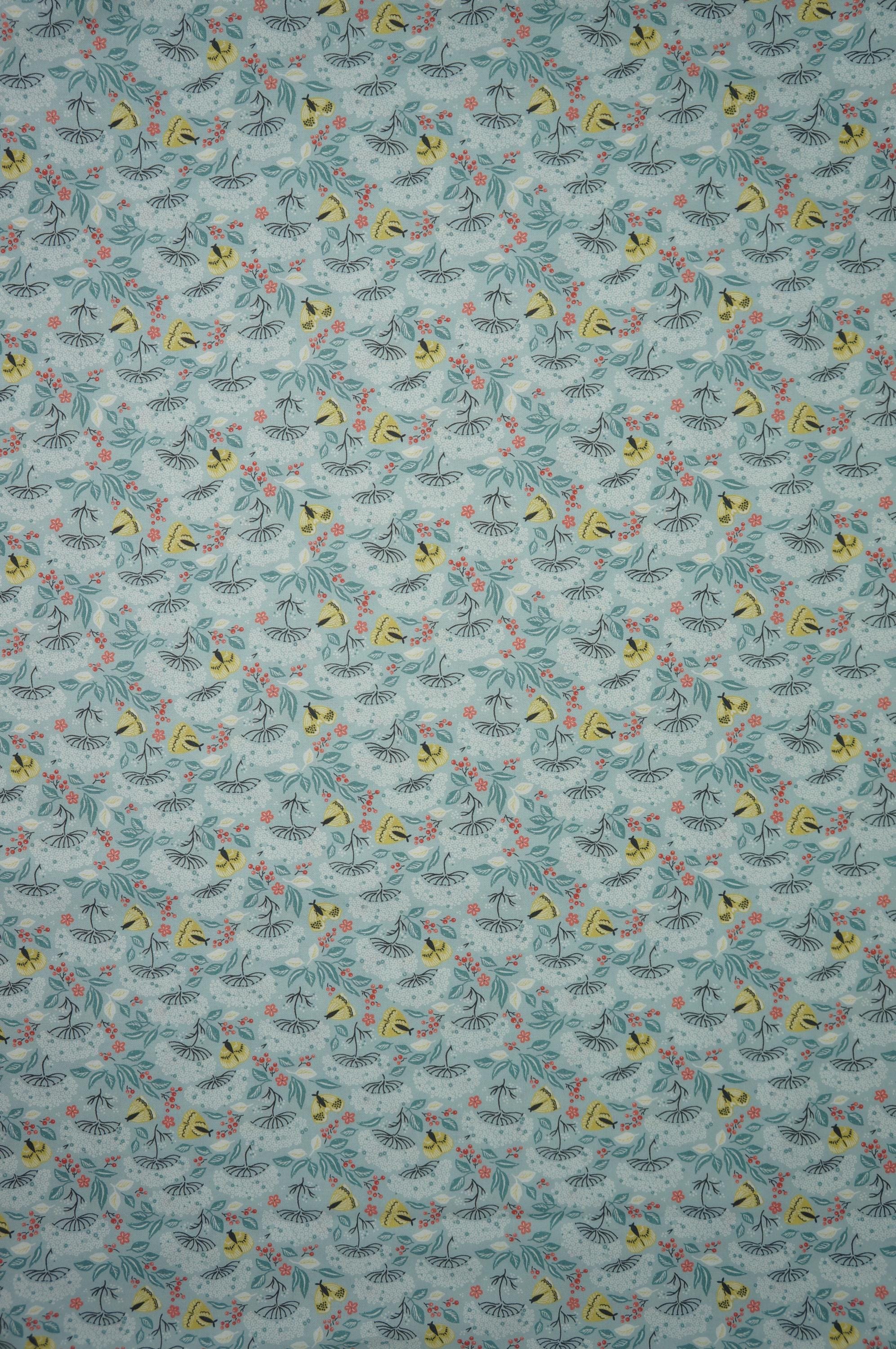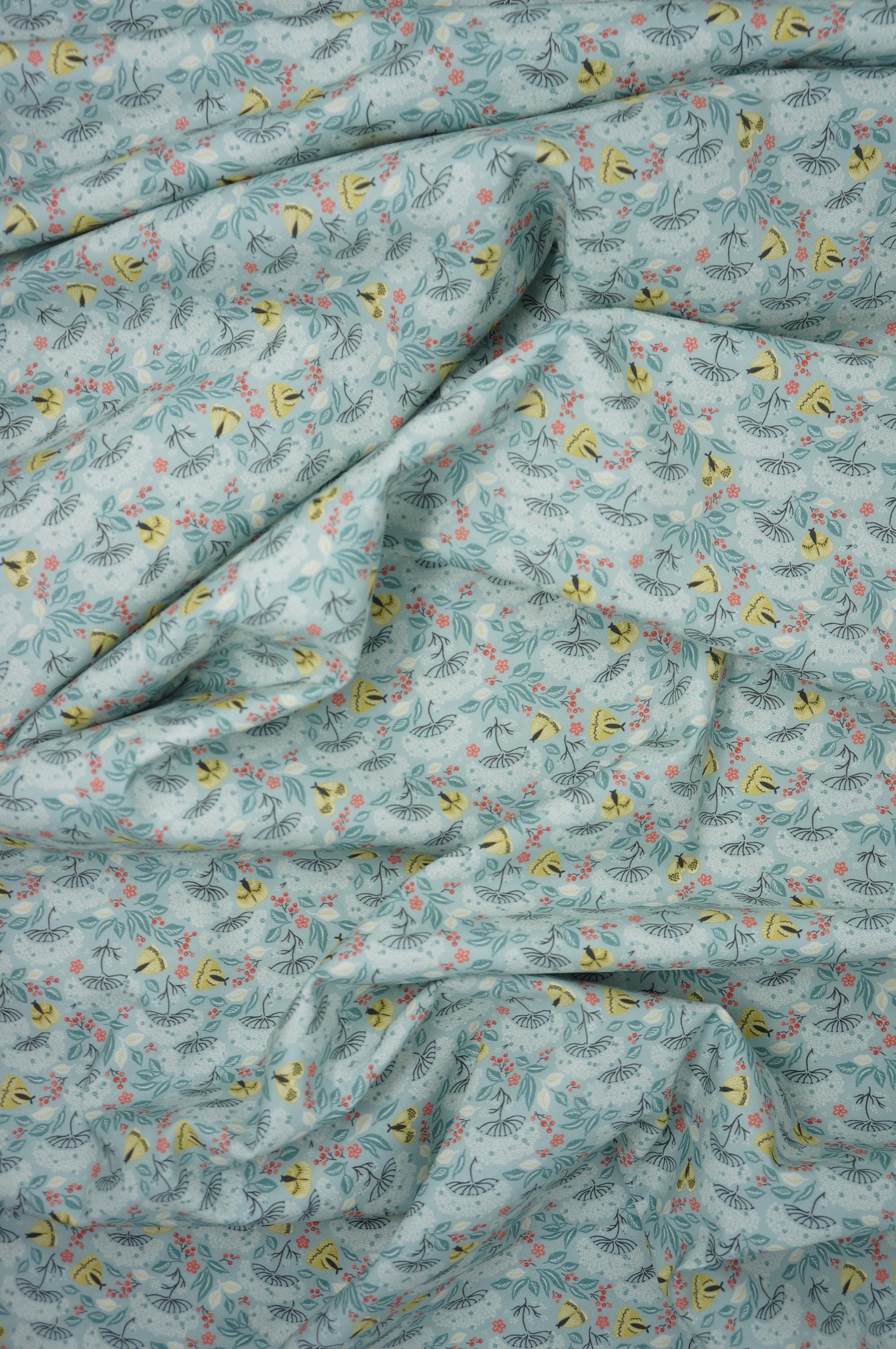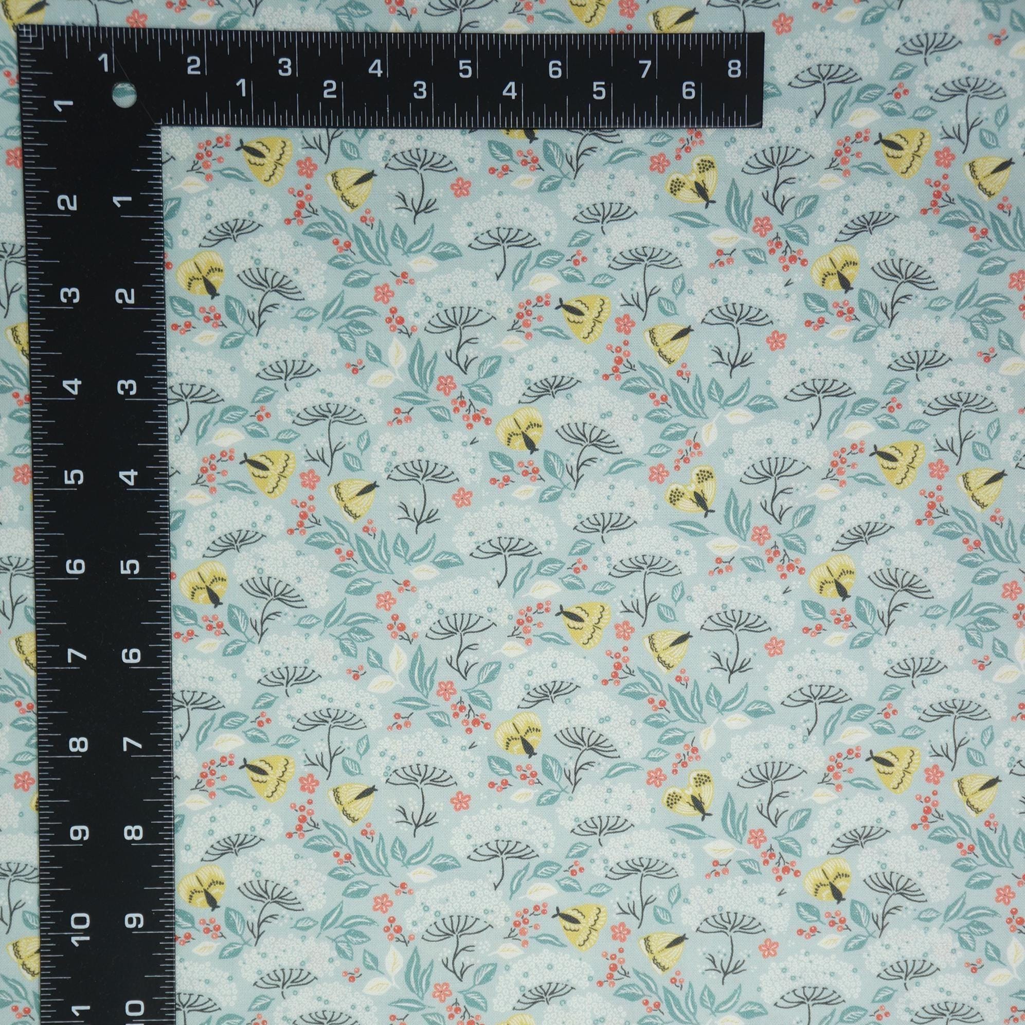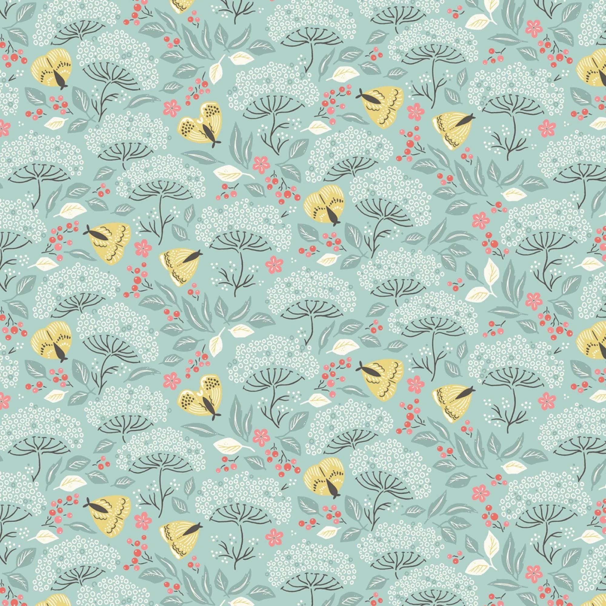If you love moths and florals, you will adore this fabric from the Cottage Garden Collection by Kimberly Morgan for Cloud 9 Organic Quilting Cotton Fabric called Moth Haven. This charming fabric features a delightful design of turquoise flowers and leaves interspersed with golden moths and small red berries, creating a whimsical garden scene. The intricate pattern is set against a soft, light blue background, making it perfect for projects that require a touch of nature-inspired elegance. This 100% certified organic cotton fabric is high quality, durable and easy to sew with.